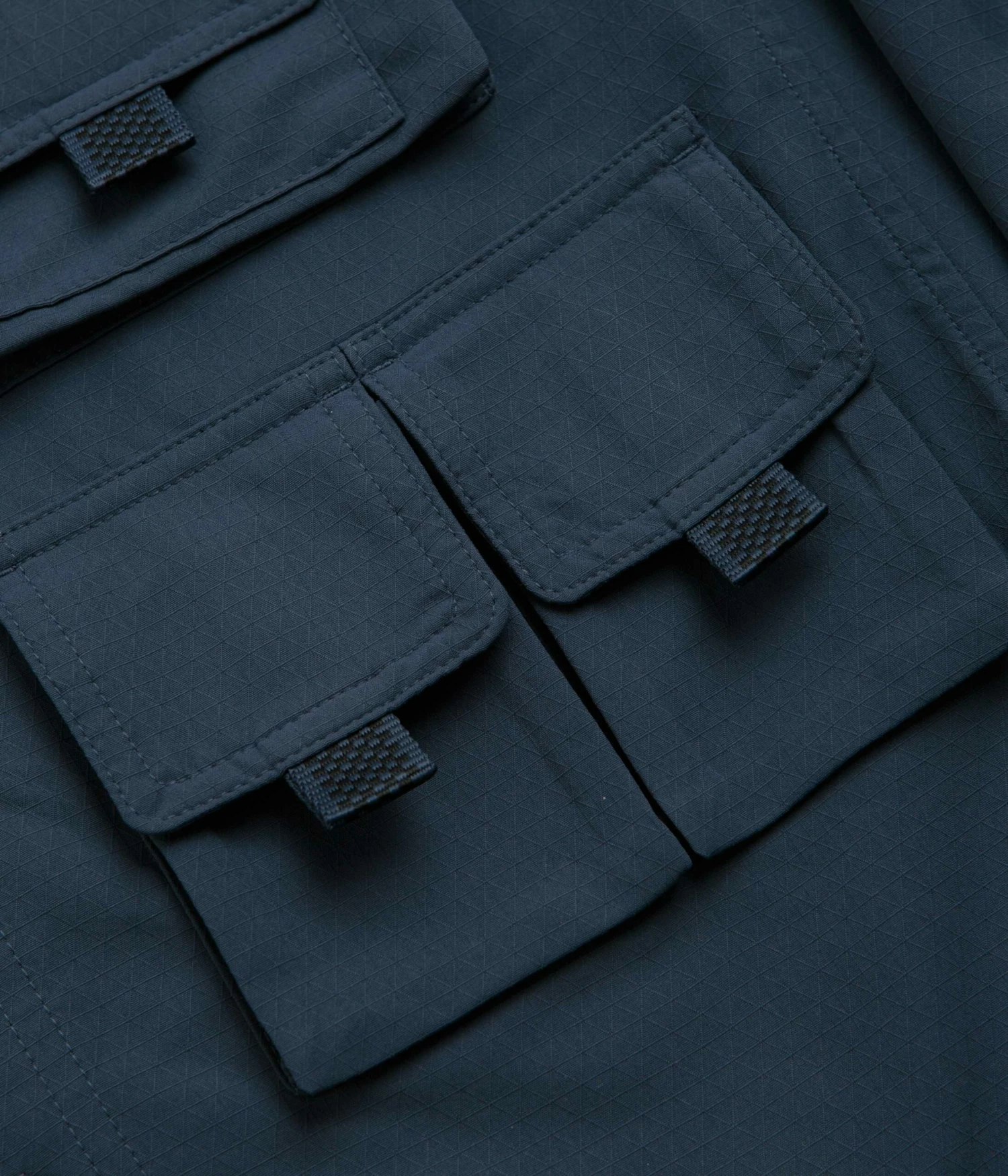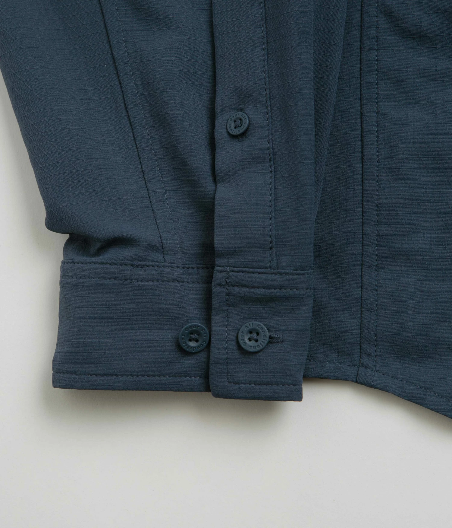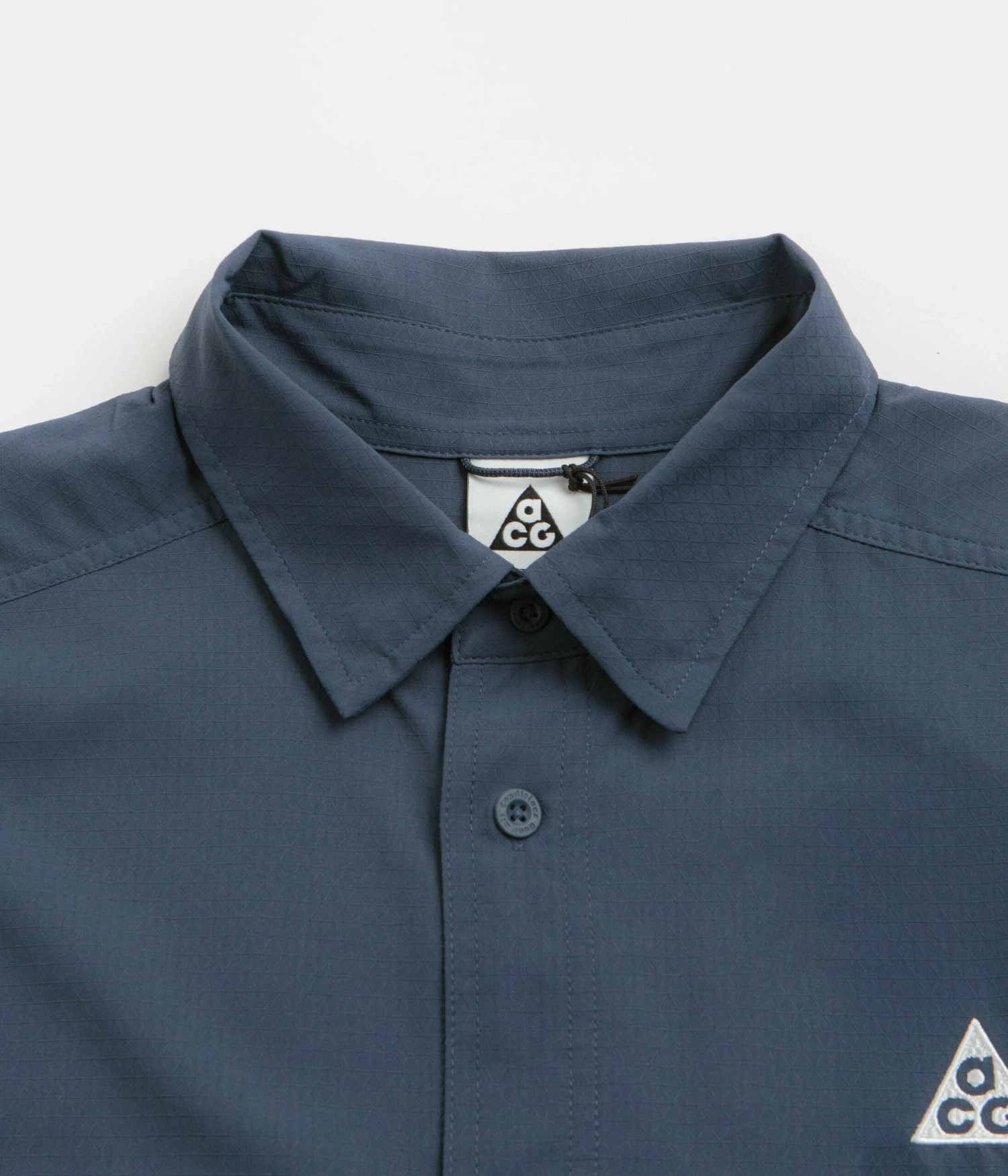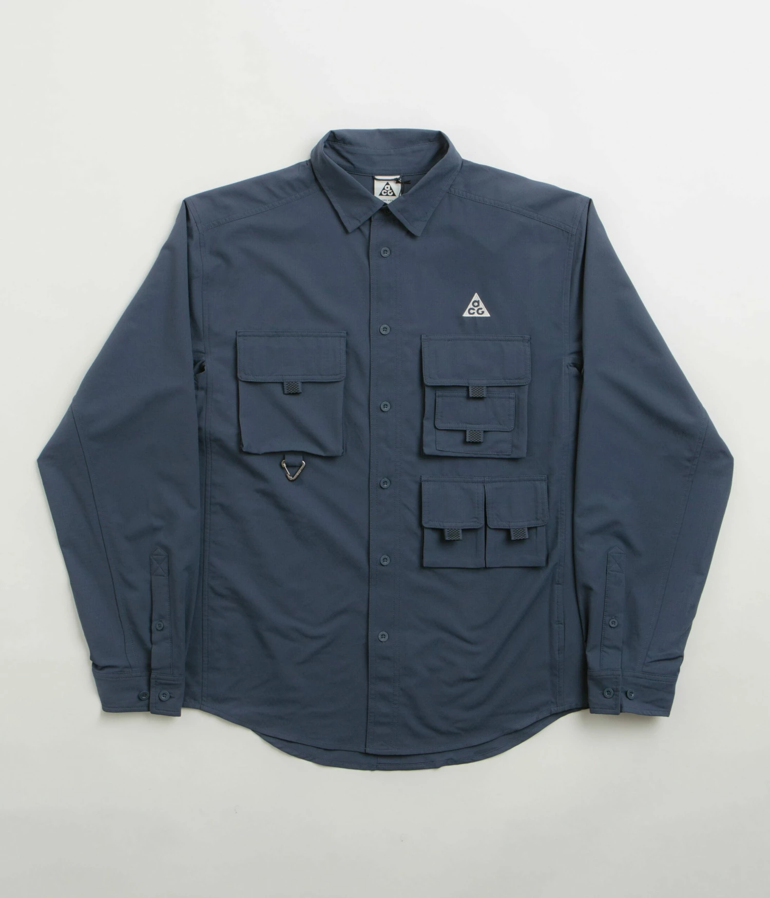 Nike ACG UV Devastation Trail Shirt in Thunder Blue and Summit White. Made from 100% polyester and utility inspired, this regular fitting Nike ACG shirt is designed with UV protection and Dri-FIT ADV technology. Featuring a fold-down collar, a full length button fastening, a curved hem and adjustable cuffs, this navy Nike ACG shirt is finished with multiple chest pockets, an ACG carabiner clip and with embroidered logo branding.