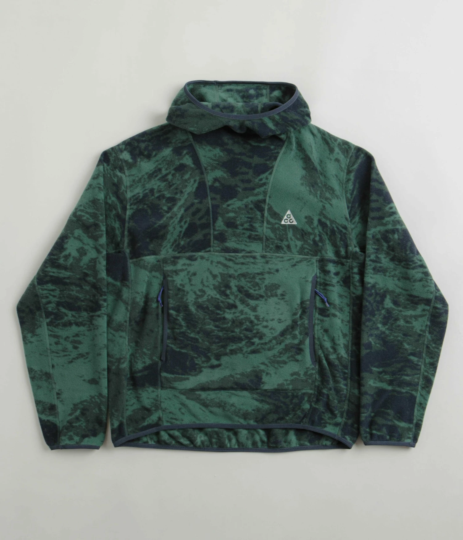 Nike ACG Wolf Tree Print Hoodie in Bicoastal, Thunder Blue and Summit White. Inspired by Oregon’s Smith Rock with an all-over patterned print, this loose fitting Nike ACG hoodie is made from 100% polyester Polartec® fleece. Featuring a triple panel hood, a built-in gaiter, elasticated cuffs and a woven elastic hem, this green Nike ACG hoodie is finished with two waist pockets and with embroidered logo branding.