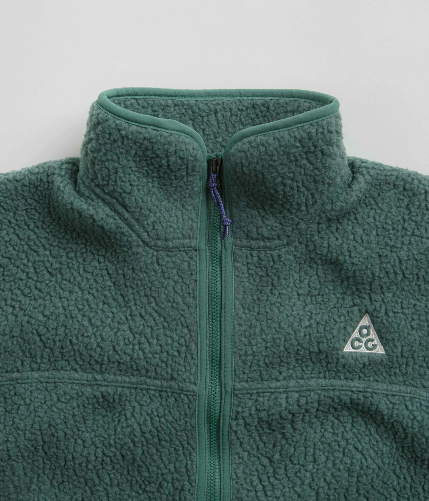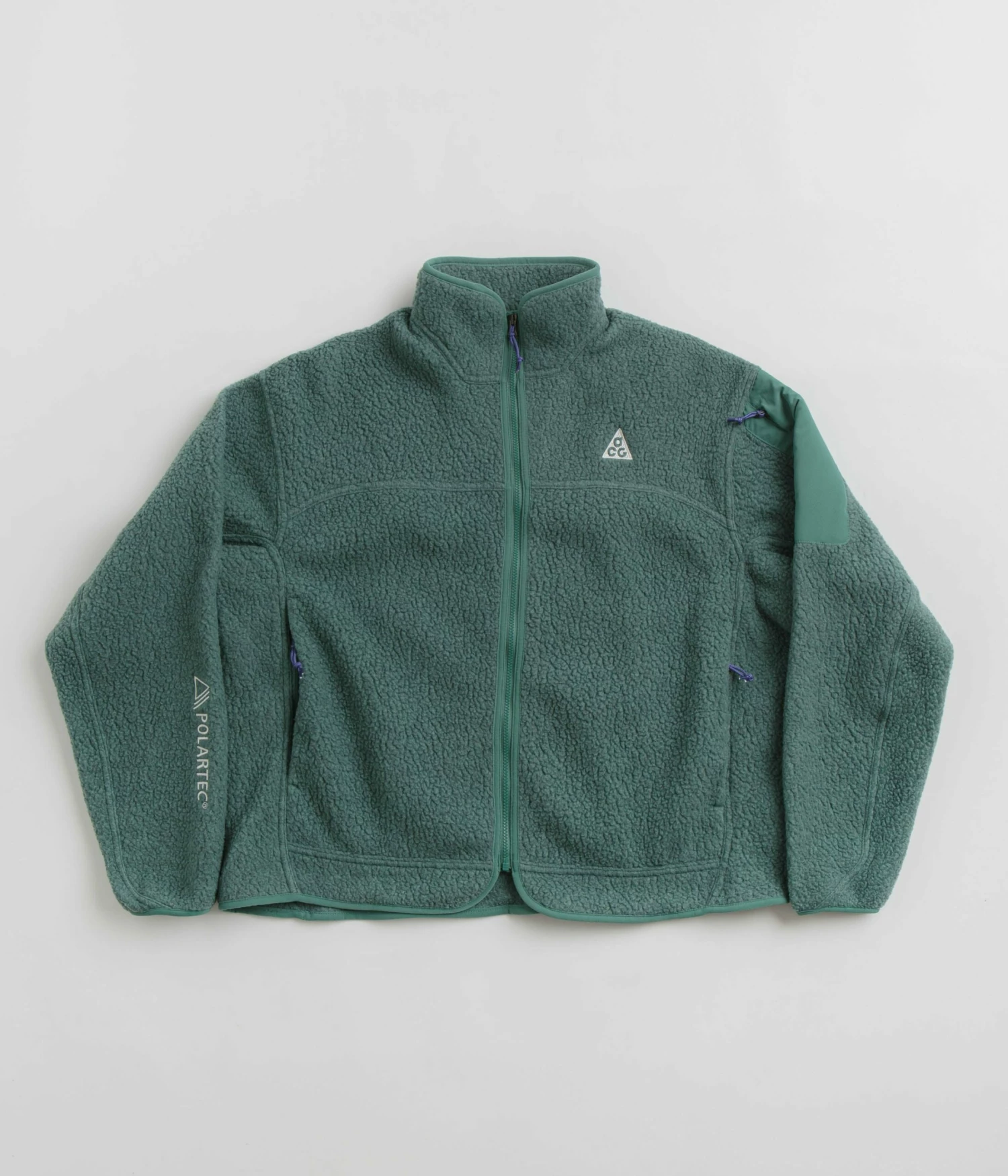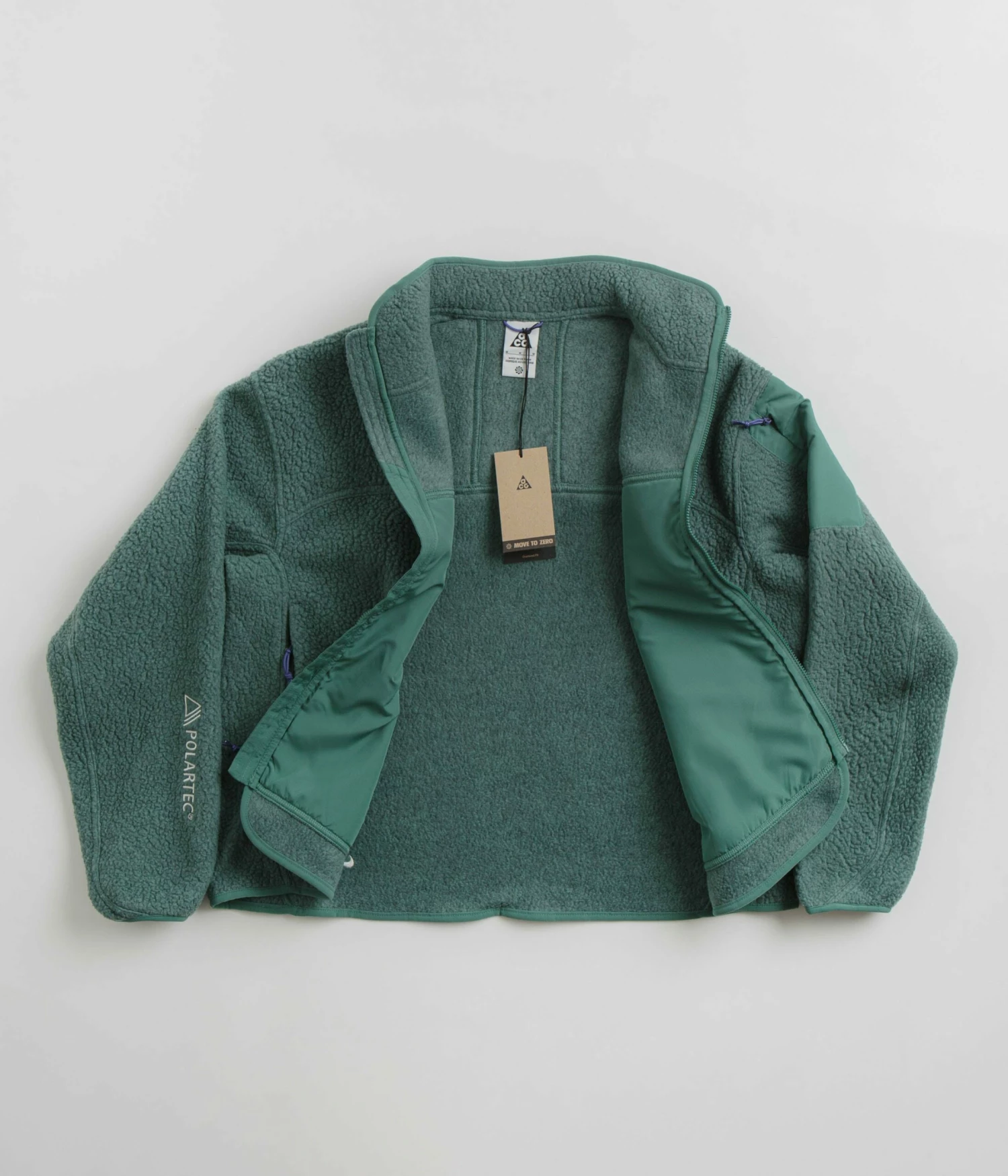 Nike ACG Womens Arctic Wolf Full-Zip Fleece in Bicoastal and Summit White. Made from 100% polyester Polartec® fleece, this Nike ACG fleece is designed with a full length zipper fastening and a high-rise collar. Featuring elasticated cuffs, taped seams and a V-insert woven elastic hem, this green Nike ACG womens fleece is finished with two zippered waist pockets, a zipped sleeve pocket and embroidered logo branding.