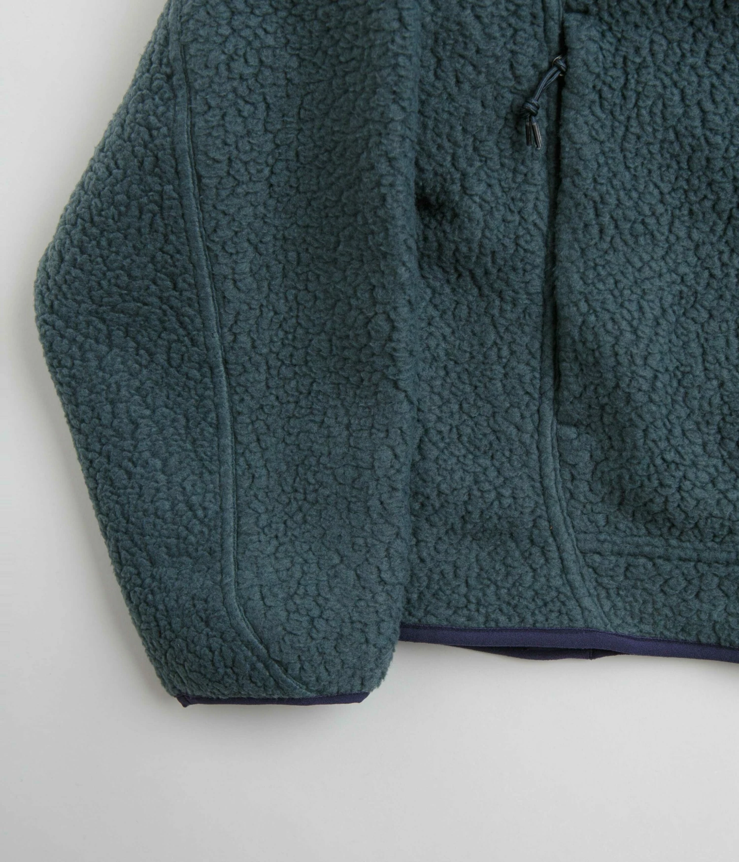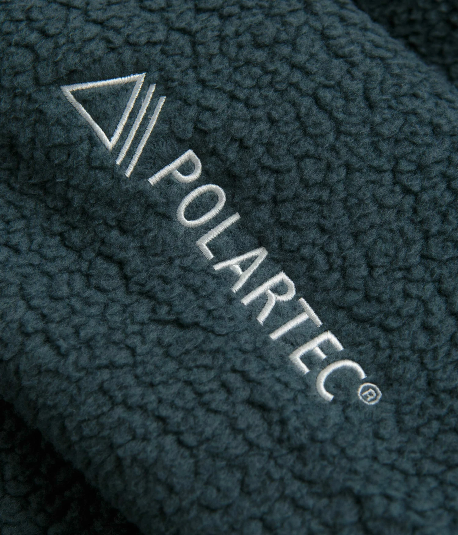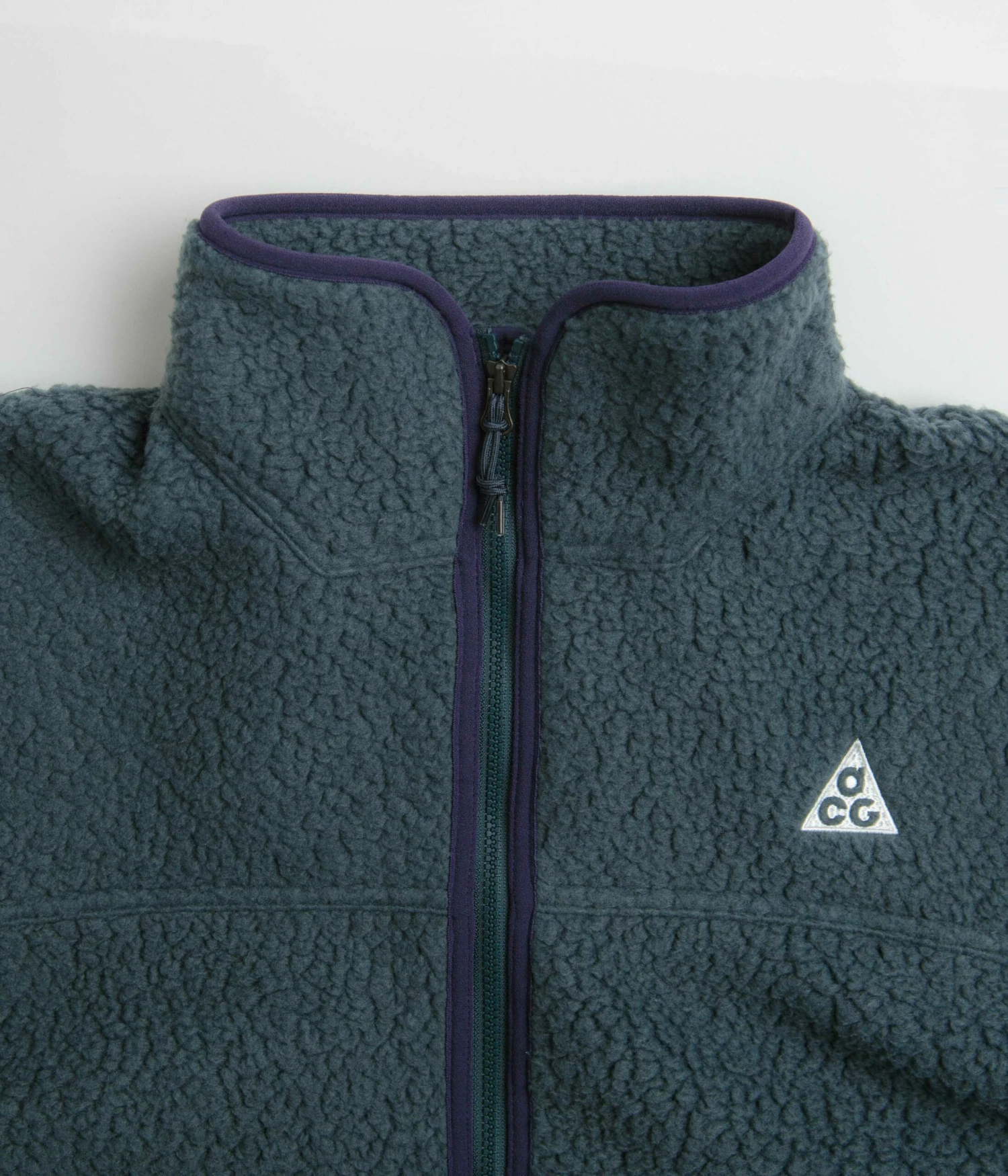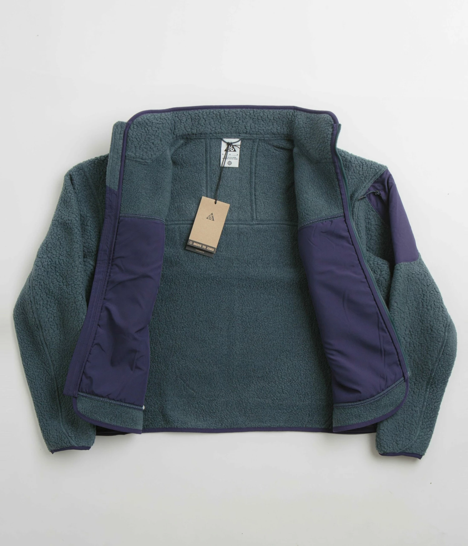 Nike ACG Womens Arctic Wolf Full-Zip Fleece in Deep Jungle, Purple Ink and Summit White. Tailored to an oversized fitting from 100% polyester Polartec®, this Nike ACG fleece is designed with a full length zipper fastening and a high-rise extended collar. Featuring contrasting elastic binding, elasticated cuffs and a woven elastic hem, this teal Nike ACG Womens fleece is finished with two zippered waist pockets, a zipped left sleeve utility pocket and with embroidered logo branding.
