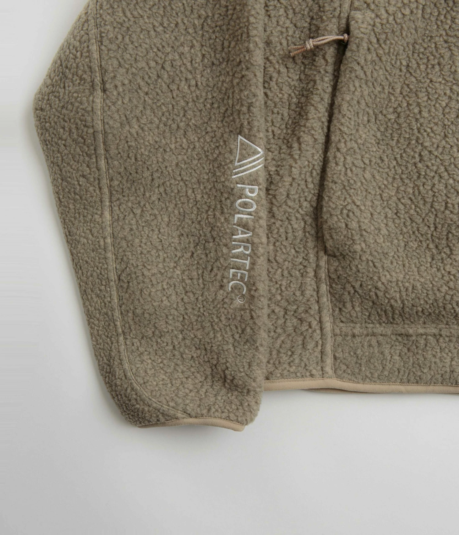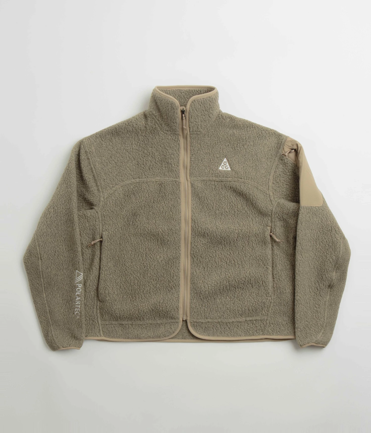 Nike ACG Womens Arctic Wolf Full-Zip Fleece in Khaki and Summit White. Made from 100% polyester Polartec®, this Nike ACG fleece is tailored to an oversized fitting with a full length zipper fastening. Featuring a high-rise extended collar, tonal elastic binding and woven elastic cuffs, this khaki Nike ACG fleece is finished with two zippered waist pockets, a zipped left sleeve pocket and with embroidered logo branding.