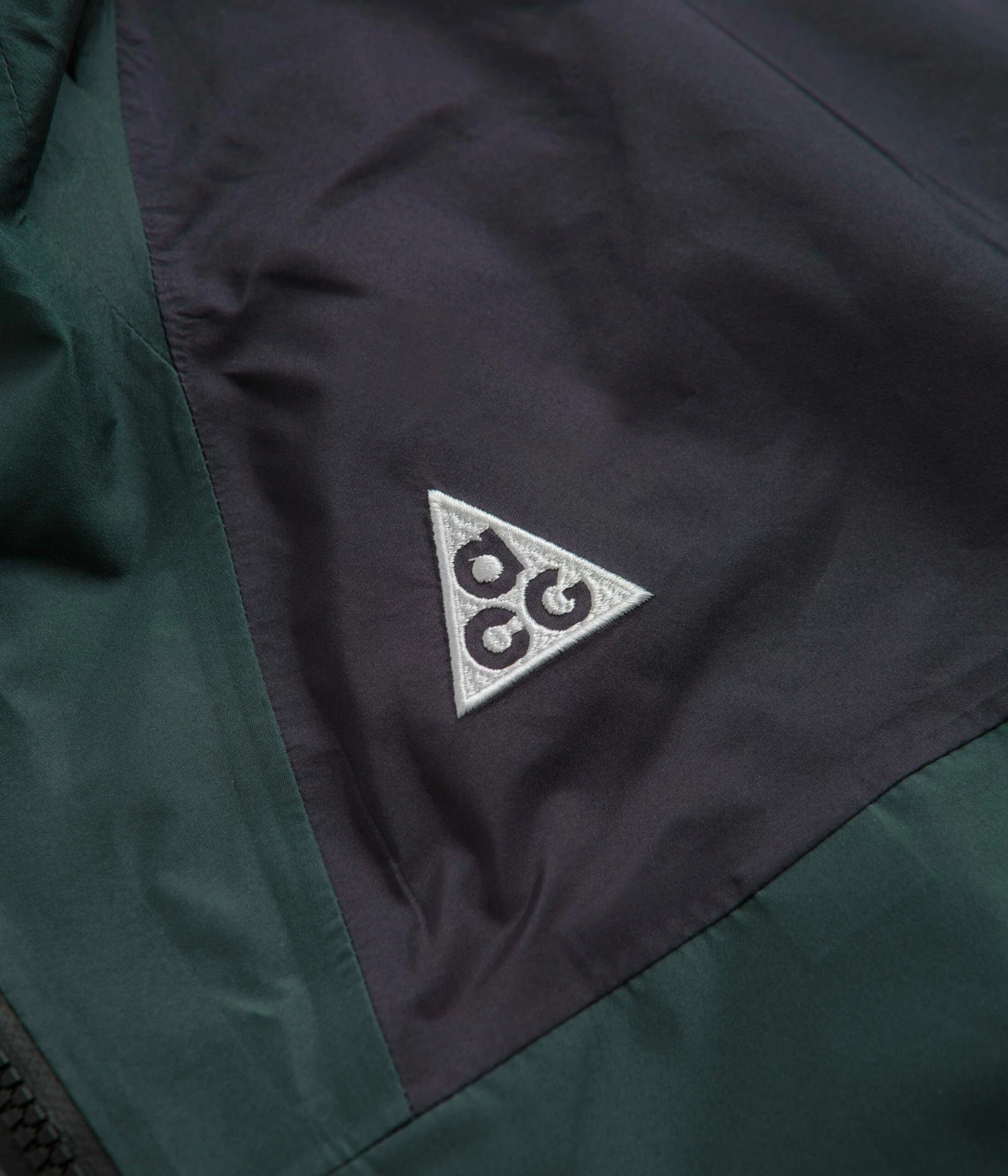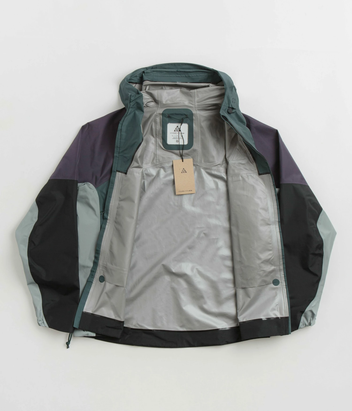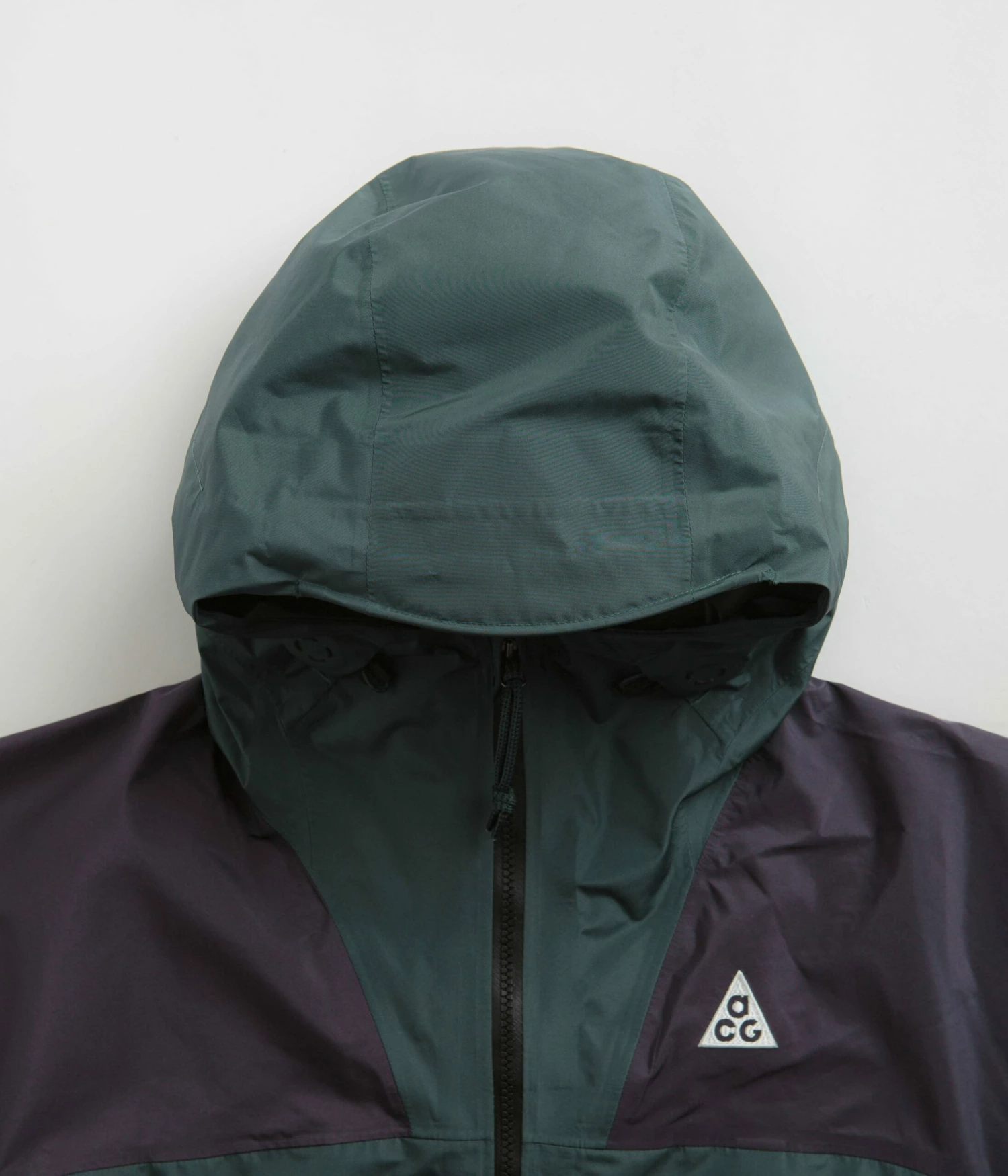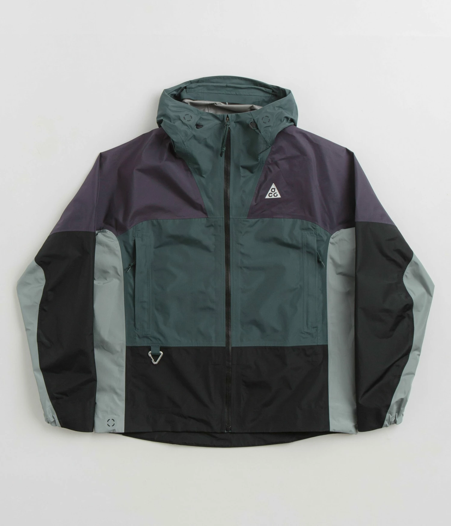 Nike ACG Womens Chain Of Craters Jacket in Faded Spruce, Gridiron and Summit White. Inspired by Iceland’s Skógafoss waterfall, this loose fitting Nike ACG jacket is made from 100% recycled polyester with Storm-FIT ADV technology. Featuring a triple layer GORE-TEX shell, a bungee-cord hood, data mapped seams, a full length zipper and AquaGuard fasteners, this spruce green Nike ACG womens jacket is finished with elasticated cuffs, an ACG carabiner clip, two waist pockets and embroidered ACG logo branding.