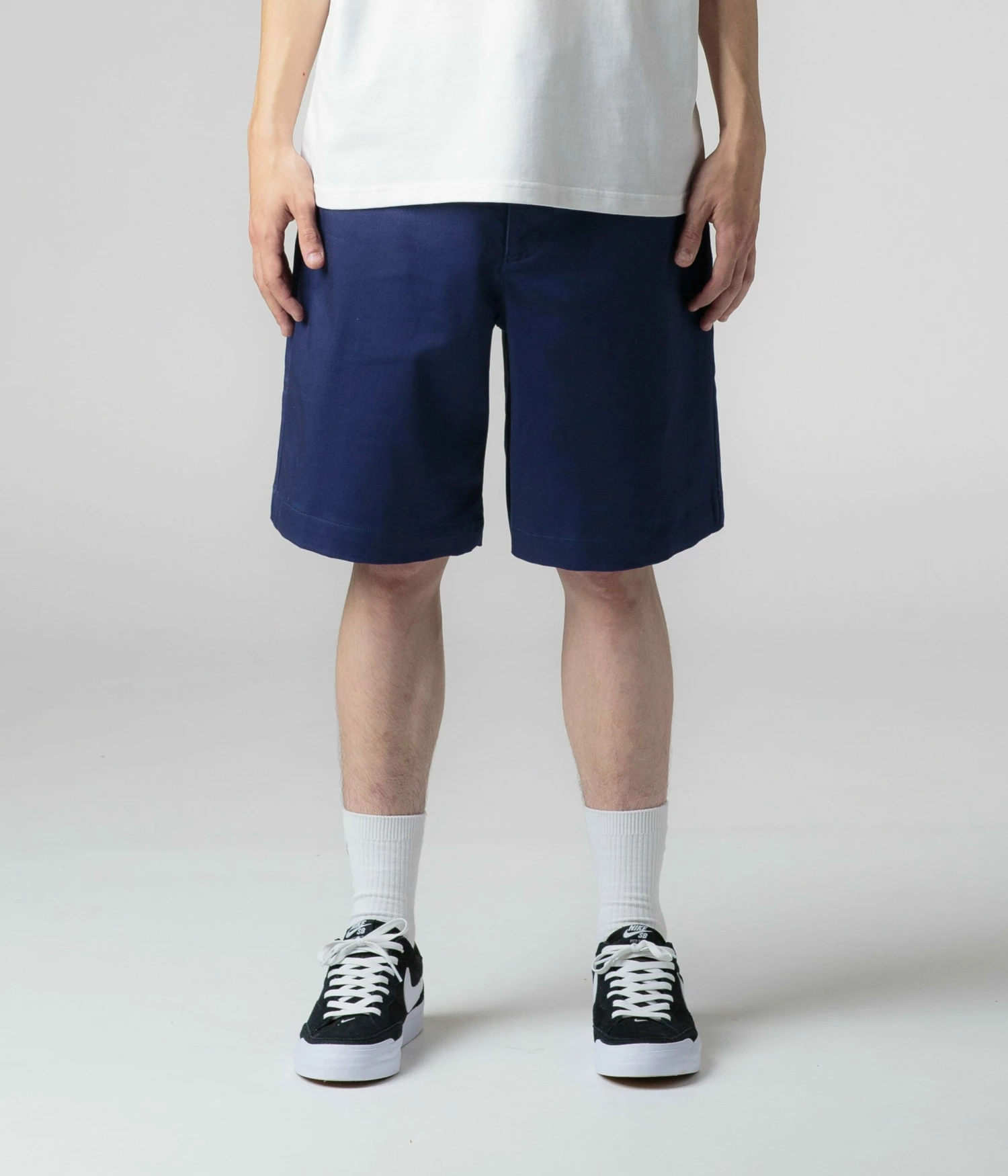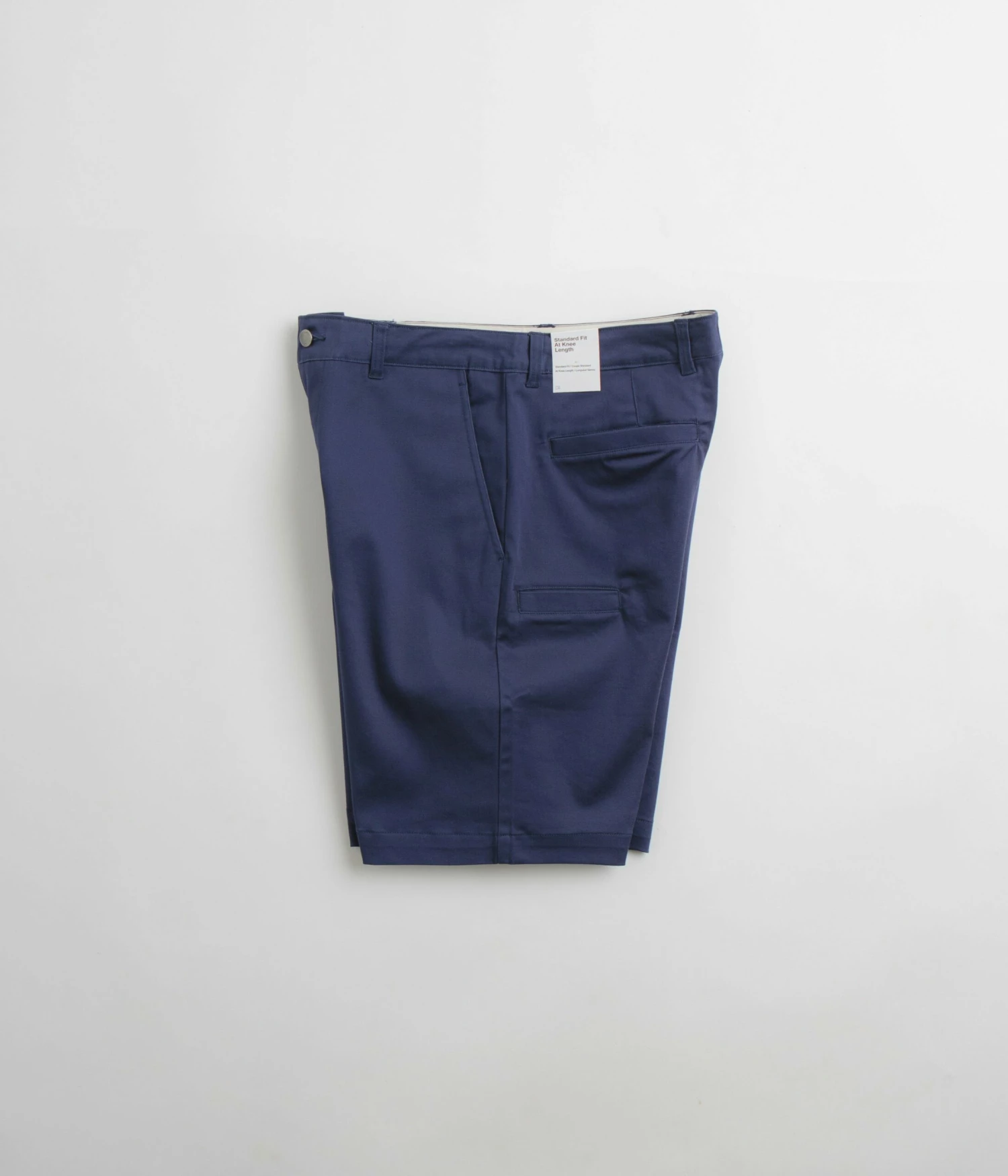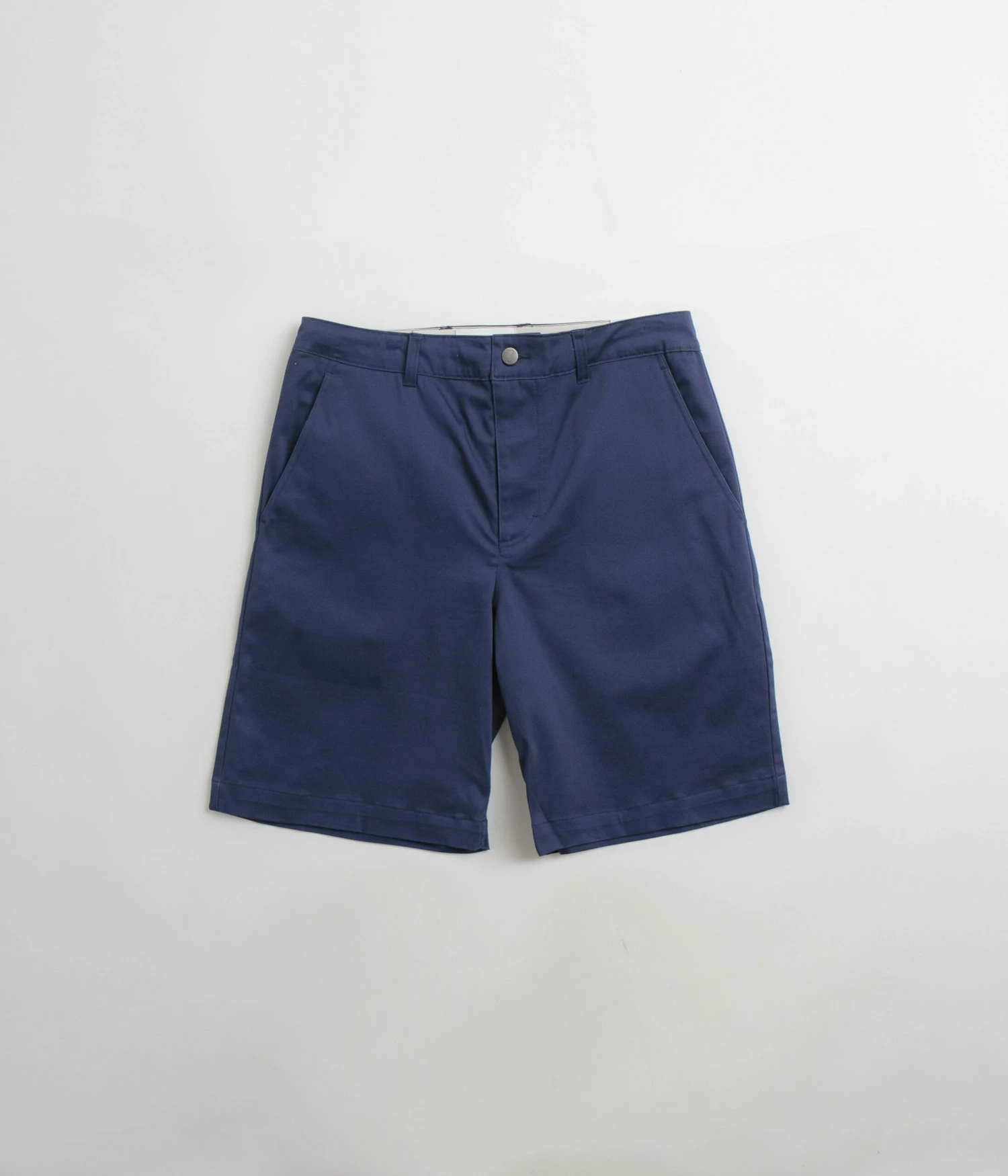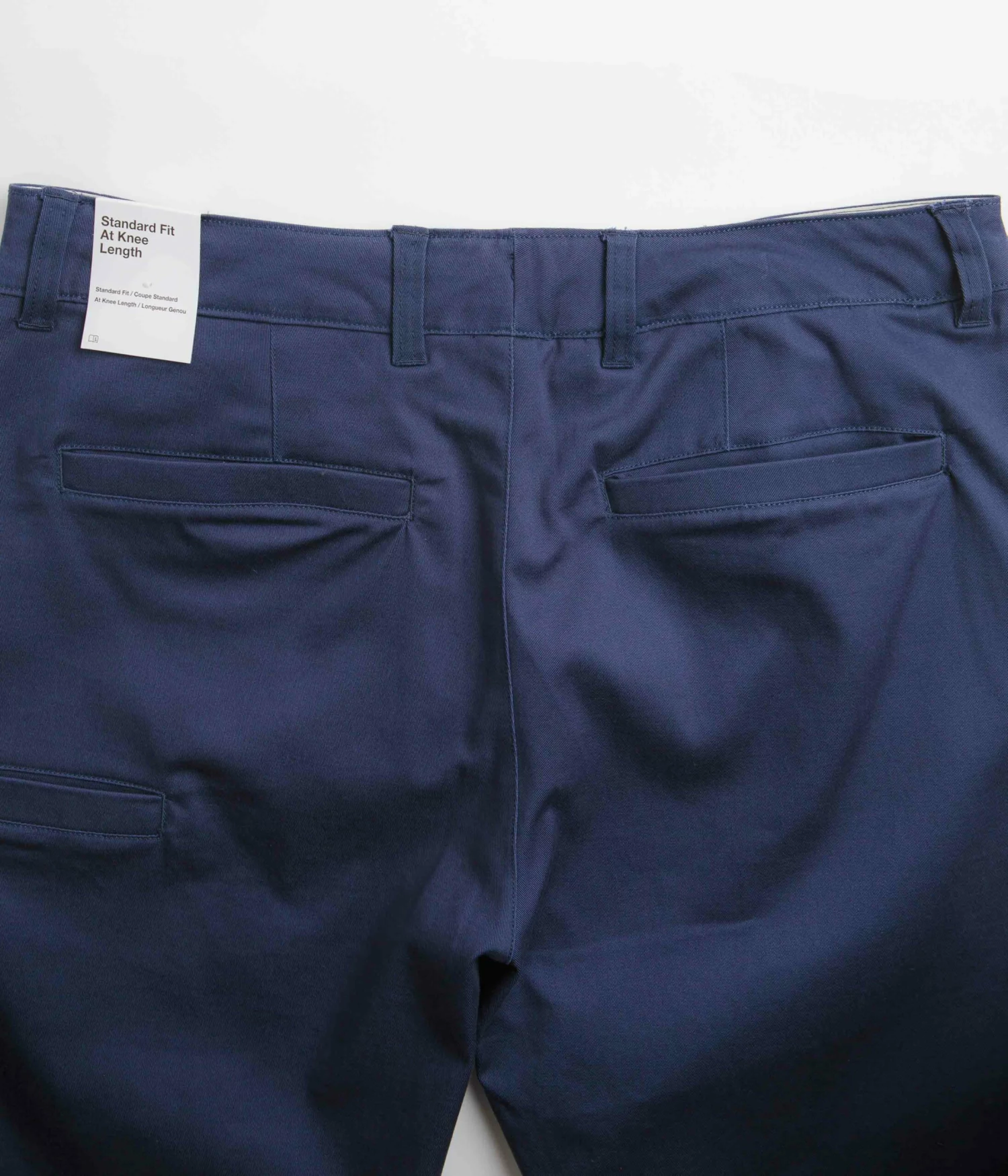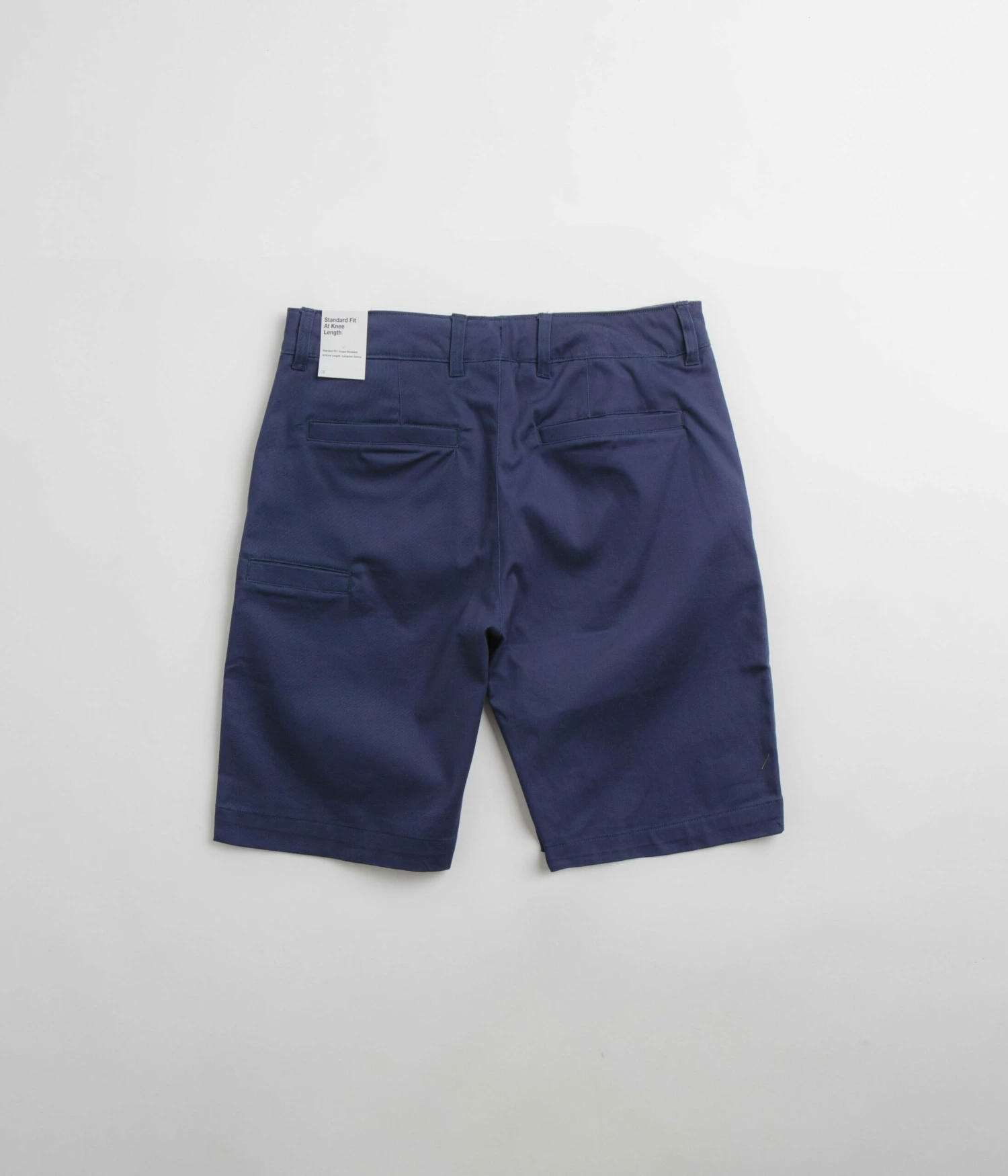 Nike SB El Chino Shorts in Midnight Navy. Made from a cotton-spandex blend and workwear inspired, these knee length Nike SB shorts are tailored to a regular fit. Featuring a belt loop waistband with an inner drawstring adjuster, a single button secured zipper fly and a relaxed seat, these navy Nike SB chino shorts are finished with two front pockets, two rear pockets, an additional rear pocket and with embroidered flag label branding.