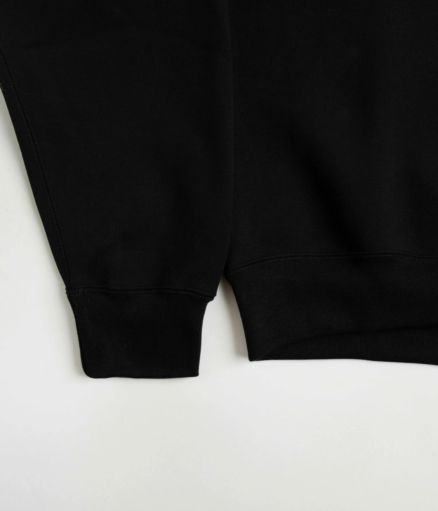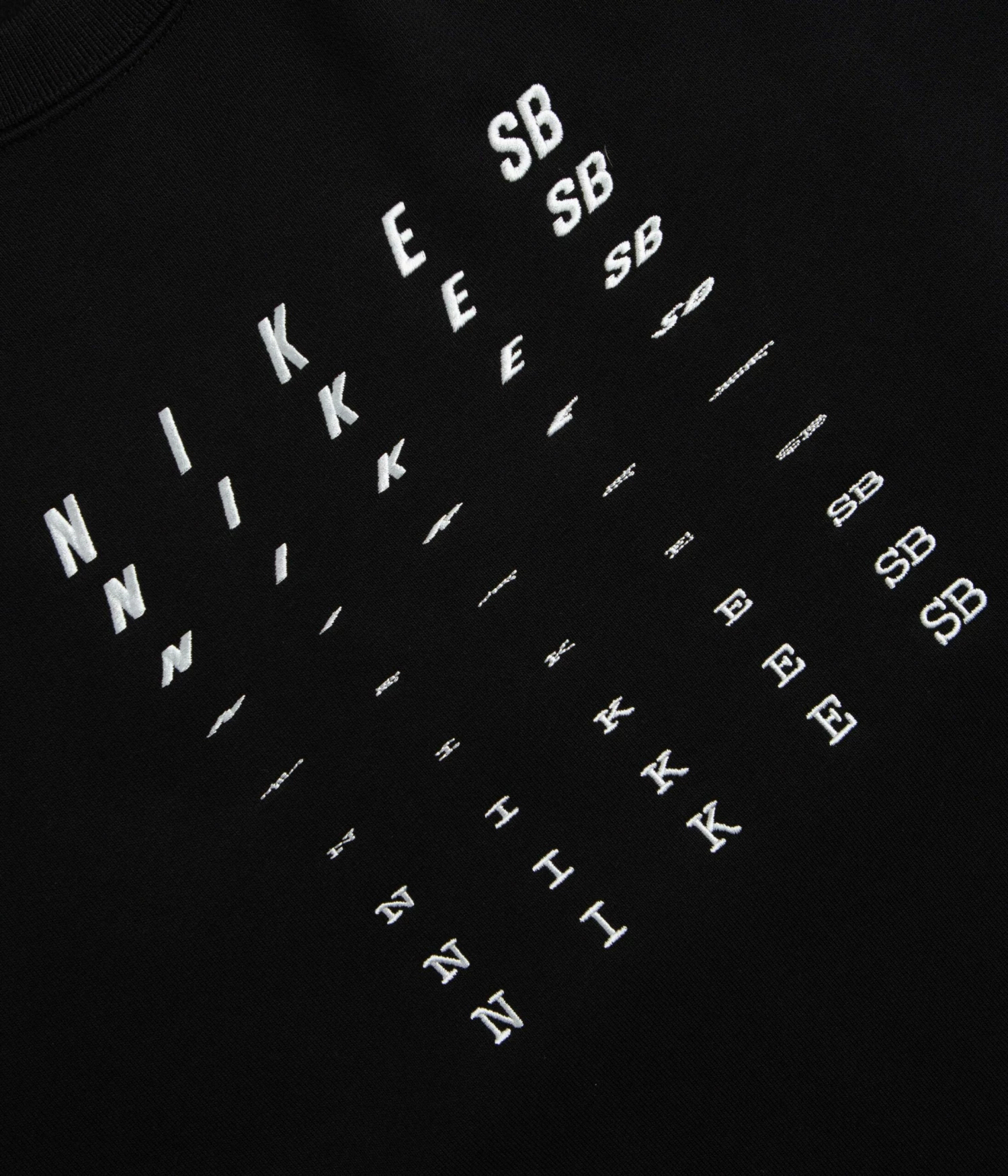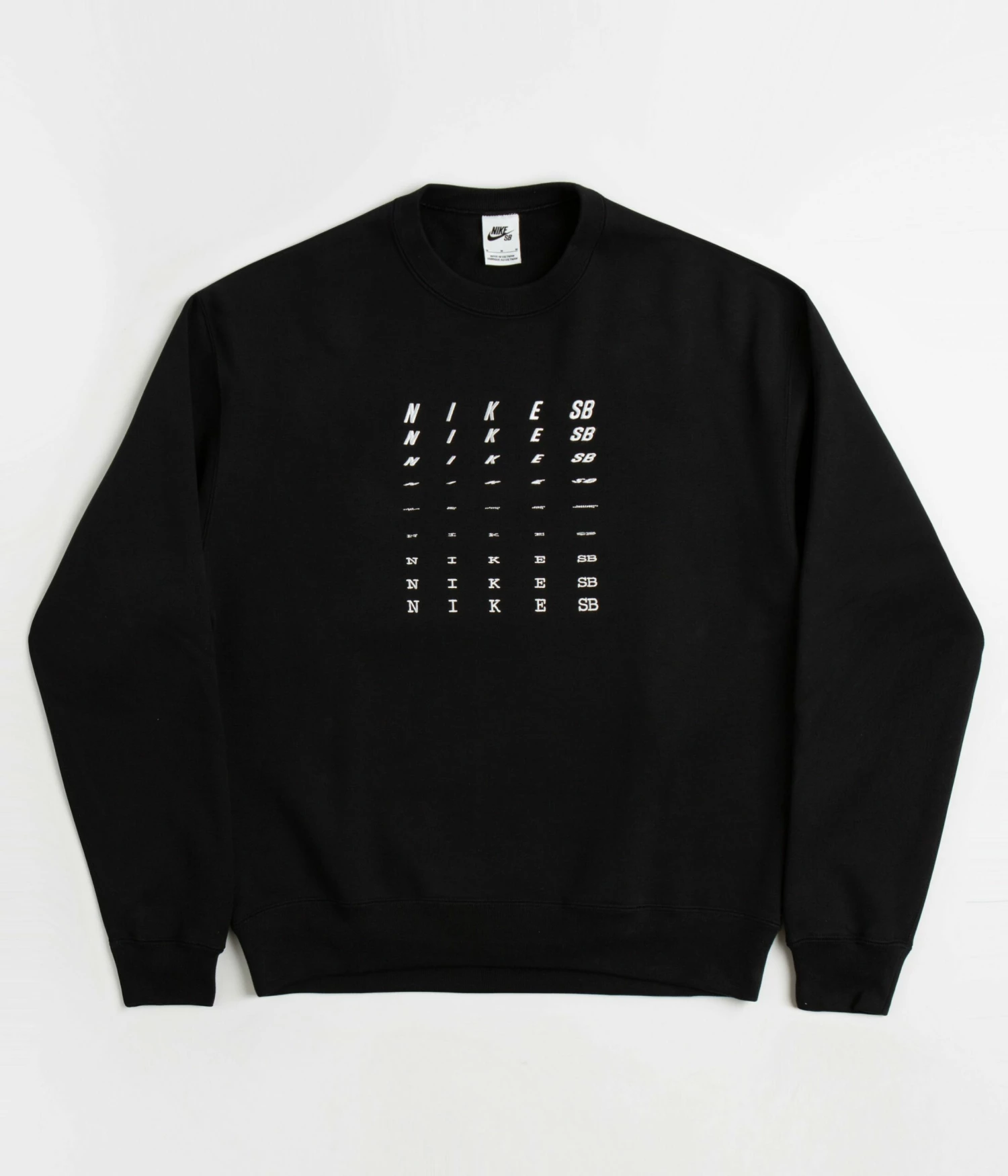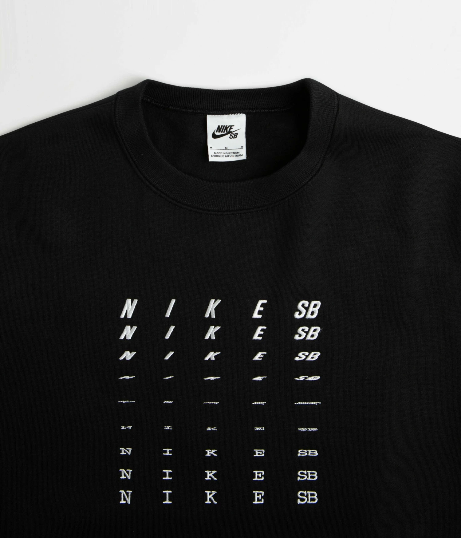 Nike SB Fade Crewneck Sweatshirt in Black. Tailored to a loose fitting from a cotton-polyester blend, this Nike SB sweater is designed with a heavyweight fleece fabrication. Featuring a flexible rib knit collar, dropped shoulders and ribbed cuffs, this black Nike SB sweater is finished with embroidered Y2K inspired graphics.