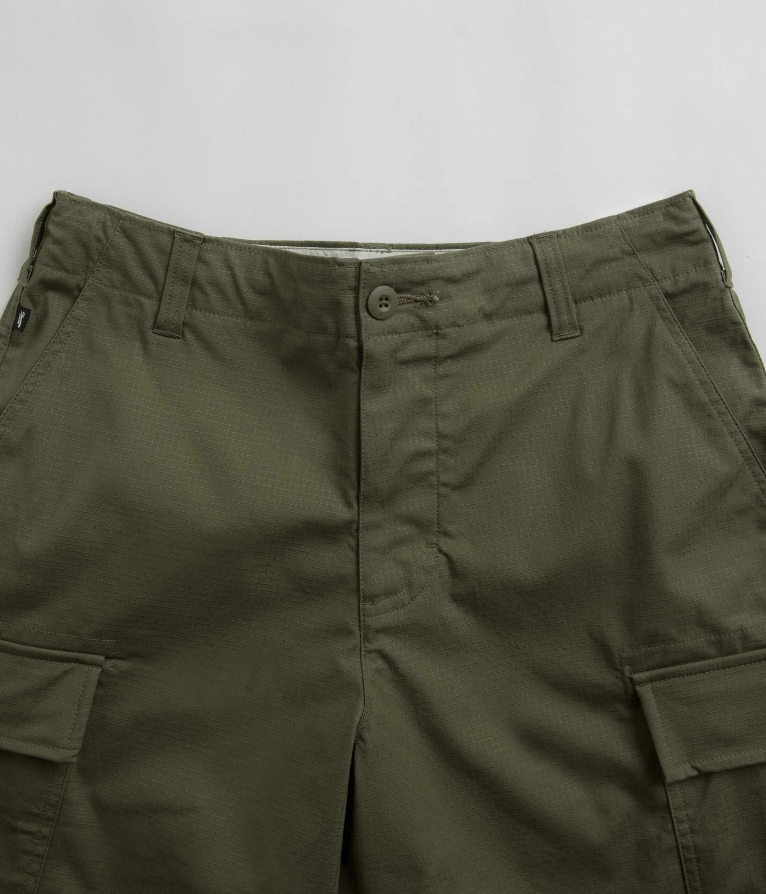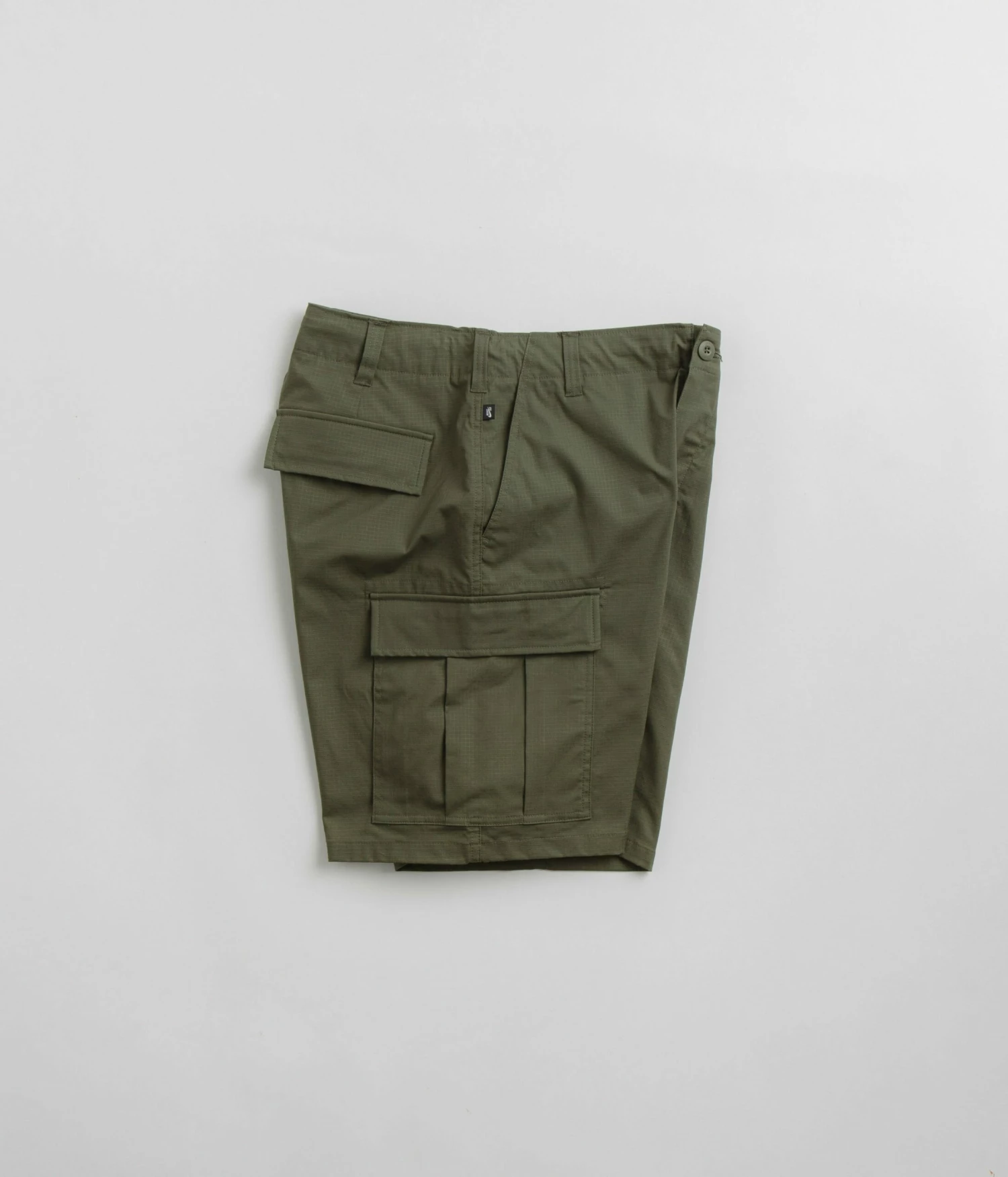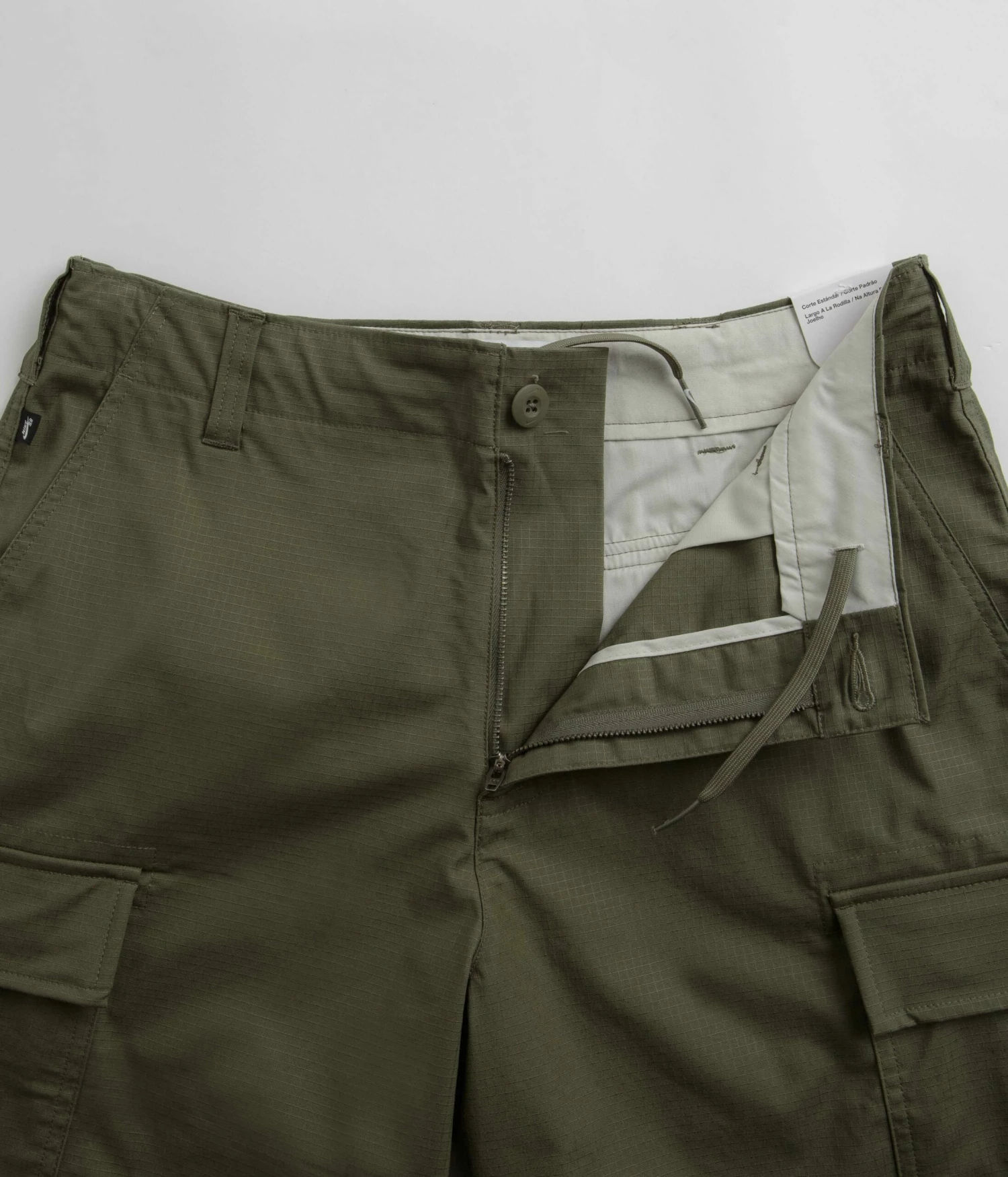Nike SB Kearny Cargo Shorts in Medium Olive. Tailored to a regular fitting and cut to knee length, these Nike SB shorts are made from a cotton-elastane blend with a drawstring adjustable waistband and tonal stitched seams. Featuring a single button secured zipper fly, these olive green Nike SB cargo shorts are finished with four classic pockets, additional cargo pockets and with woven flag label branding.