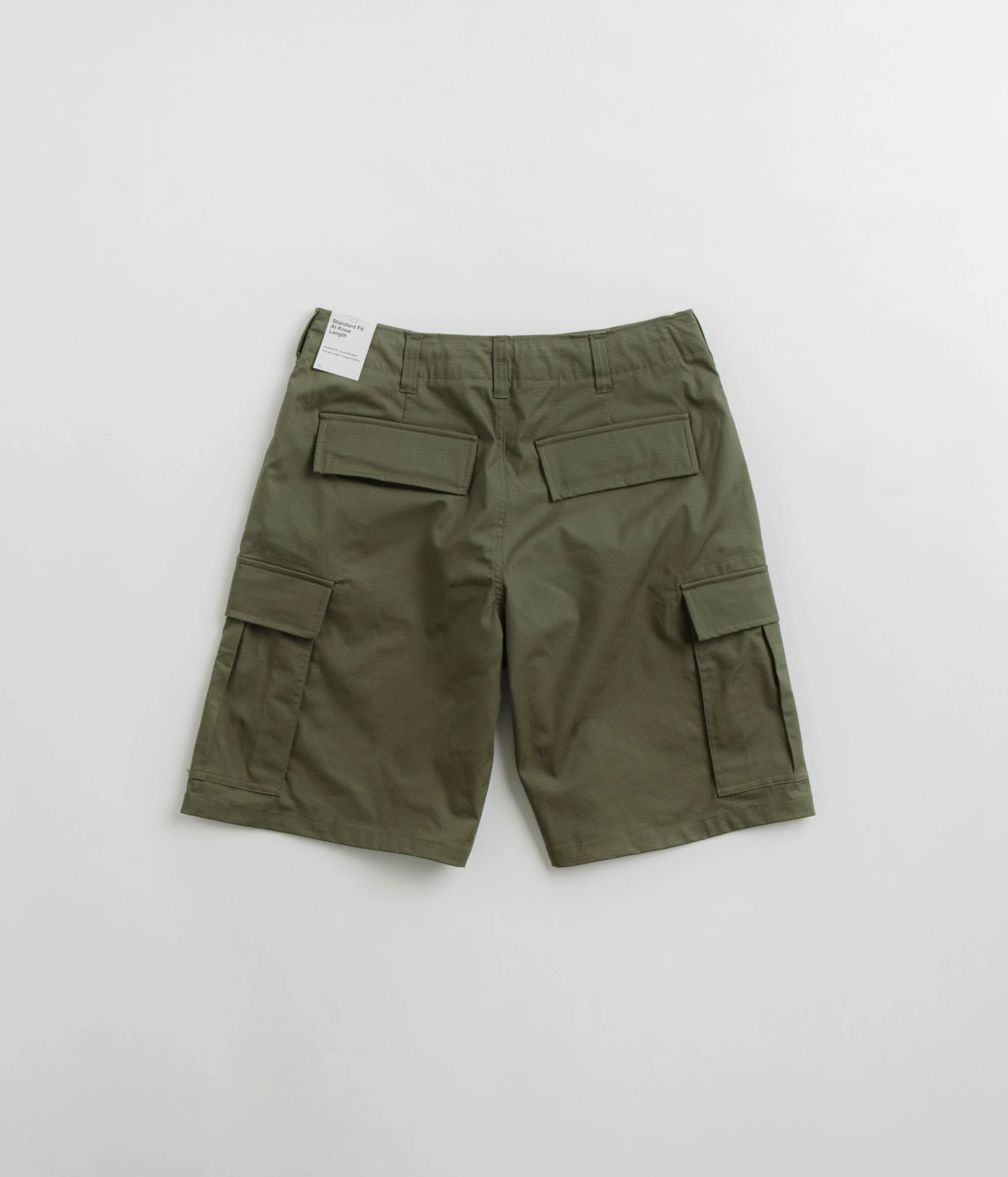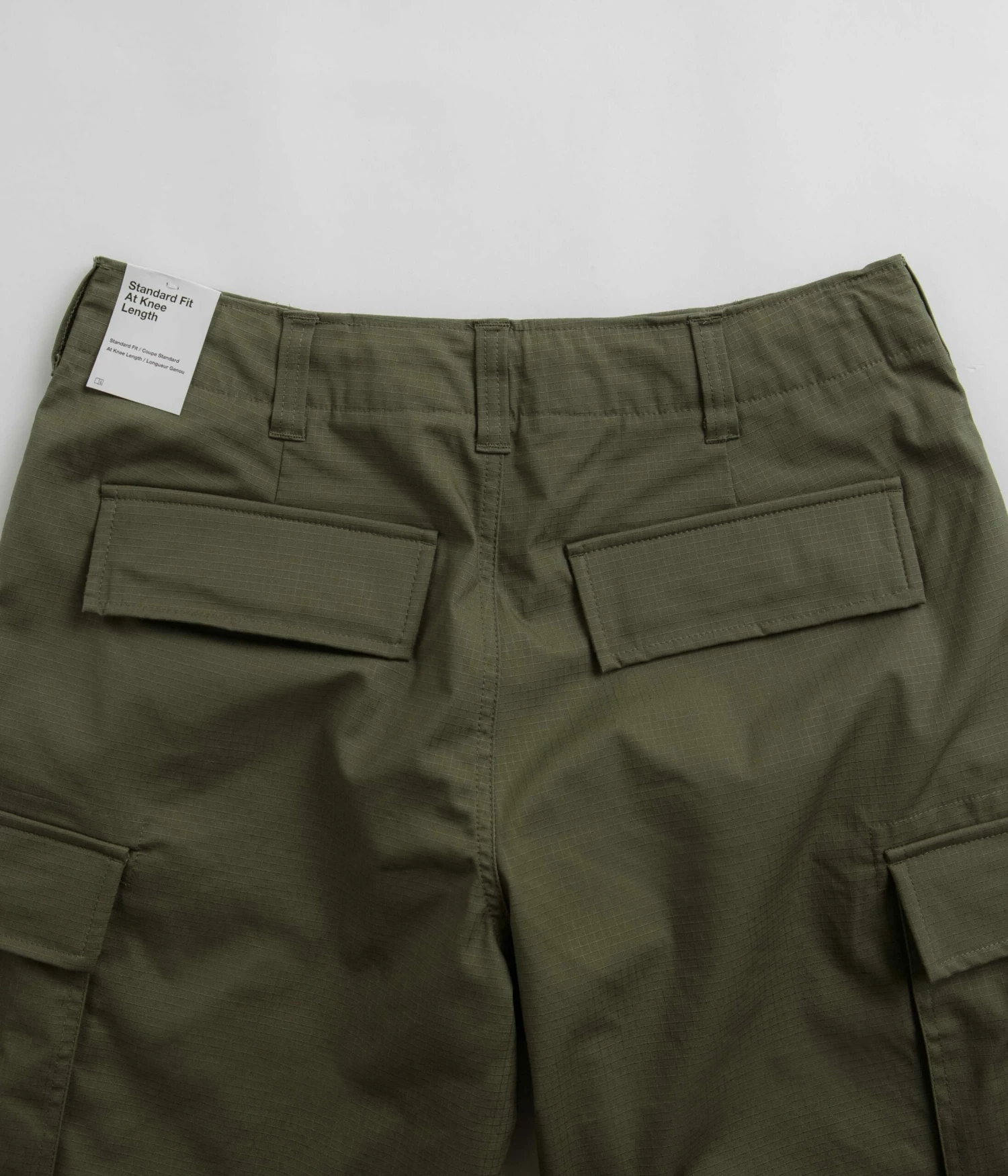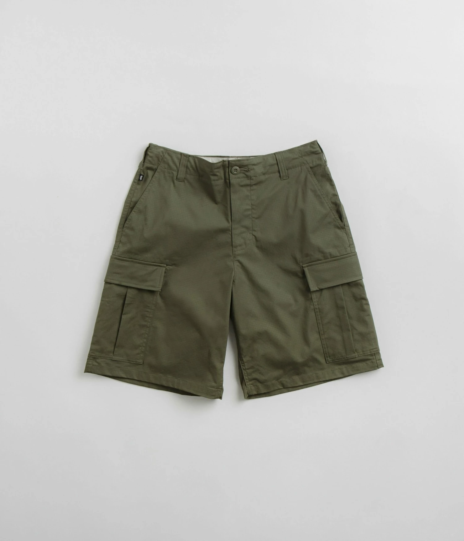 Nike SB Kearny Cargo Shorts in Medium Olive. Tailored to a regular fitting and cut to knee length, these Nike SB shorts are made from a cotton-elastane blend with a drawstring adjustable waistband and tonal stitched seams. Featuring a single button secured zipper fly, these olive green Nike SB cargo shorts are finished with four classic pockets, additional cargo pockets and with woven flag label branding.