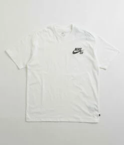 Nike SB Logo T-Shirt in White and Black. Arriving as part of the brand’s latest collection, this loose fitting Nike SB t-shirt is crafted from 100% cotton. Featuring a flexible rib knit crew collar, a reinforced hemline and colour matched seams, this Nike t-shirt has a white base with a black Nike SB Swoosh logo printed across the left chest and with a woven flag label sewn across the left side.