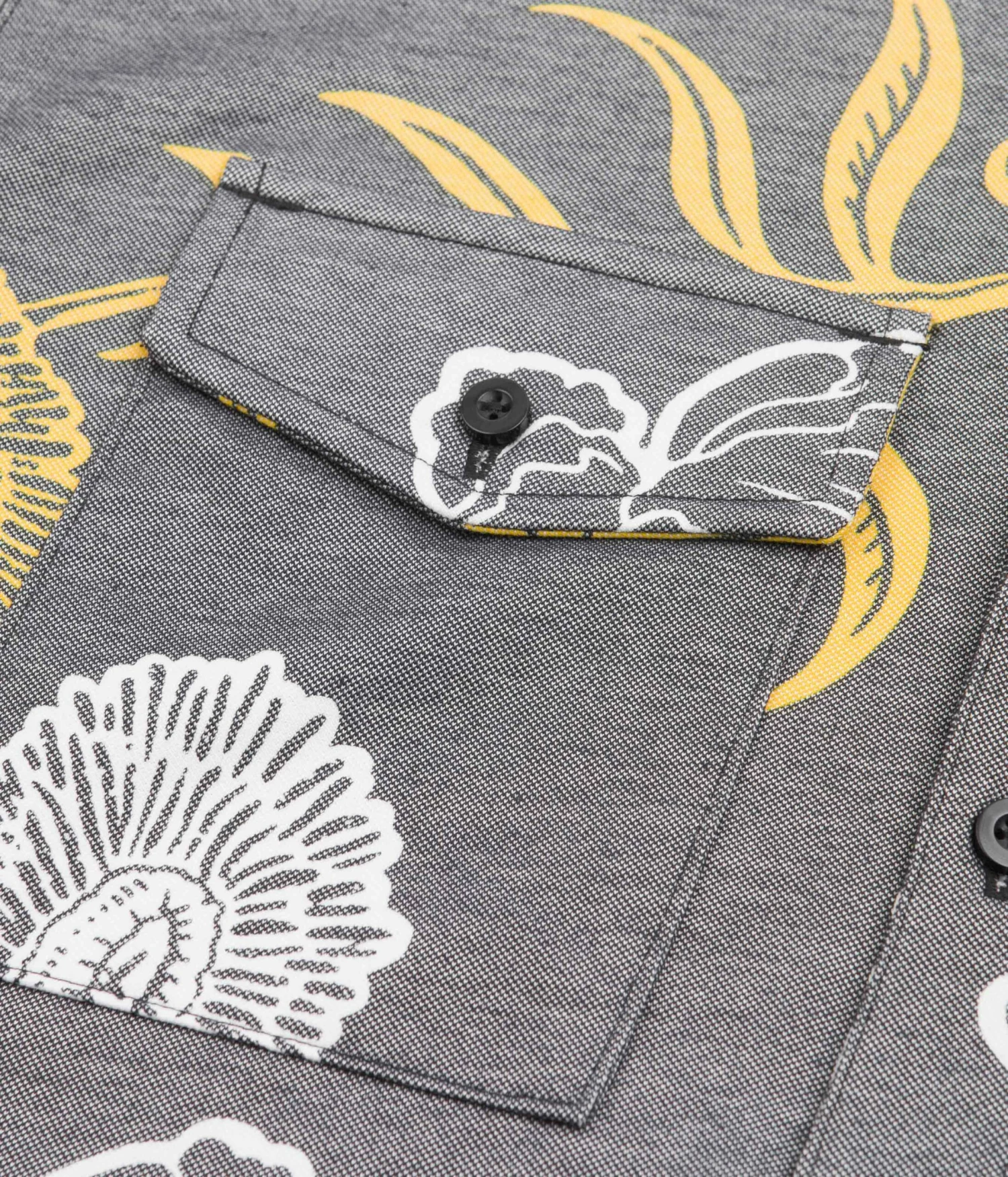 Nike SB Printed Knit Shirt in Black. Made from a sustainable blend of 61% cotton and 39% polyester, this short sleeve Nike SB shirt arrives as a regular fitting silhouette from the brand’s SU22 release. Inspired by Mexico’s coastline and styled with a repeated floral print throughout, this new season shirt features a stand collar, a four button placket, a curved hemline and tonal stitched seams. Finished with a jersey fabric construction, two alternatively styled upper chest pockets and with an embroidered ‘Nike SB’ flag label sewn across the left side.