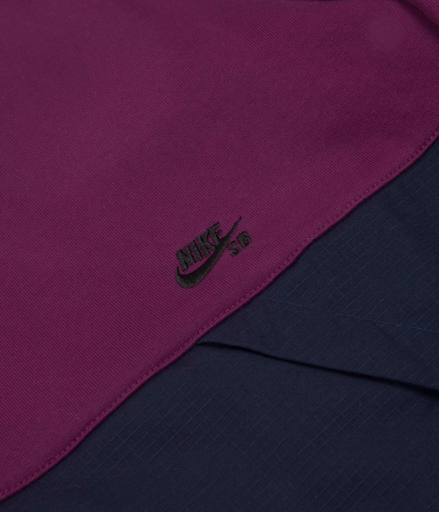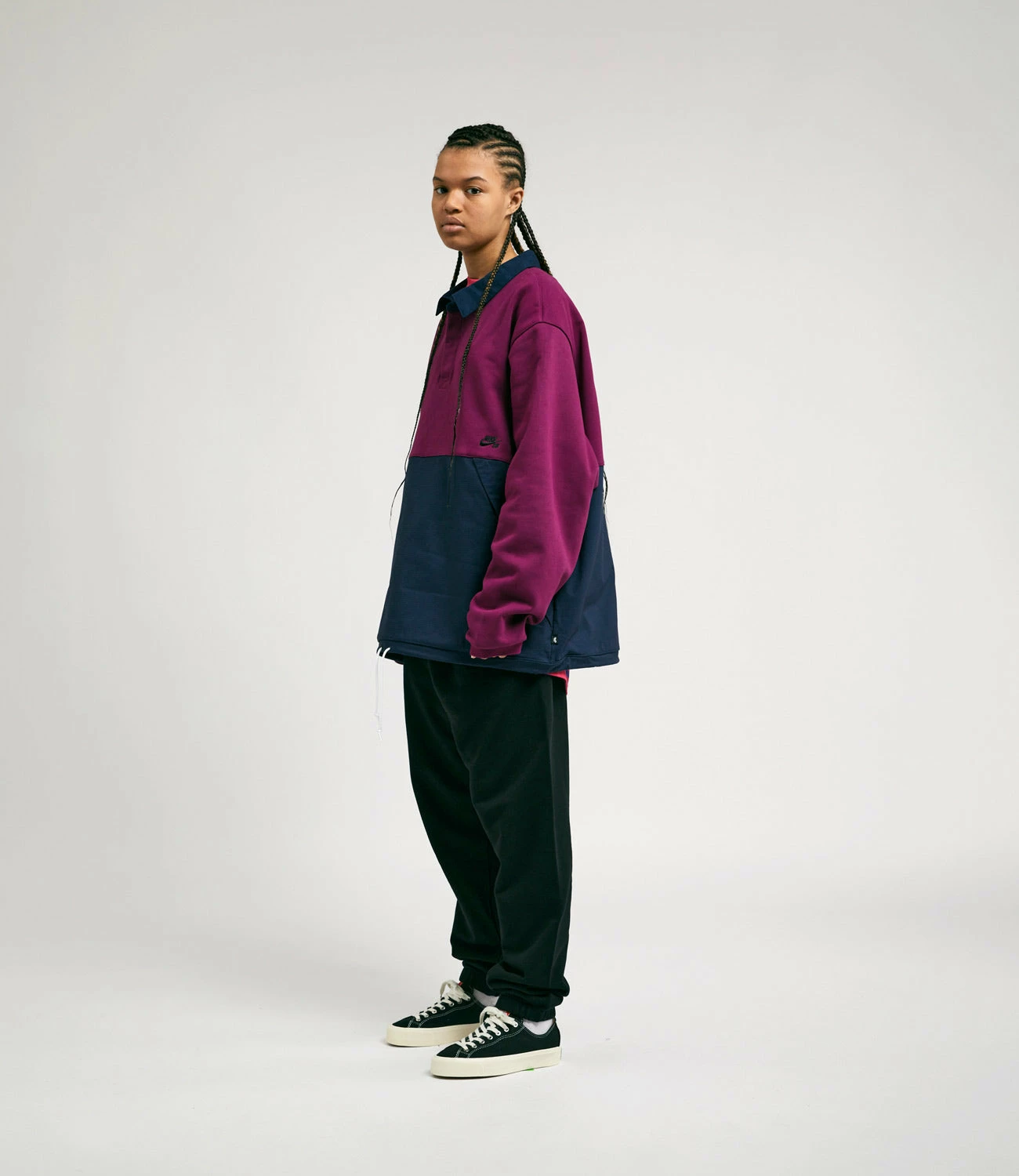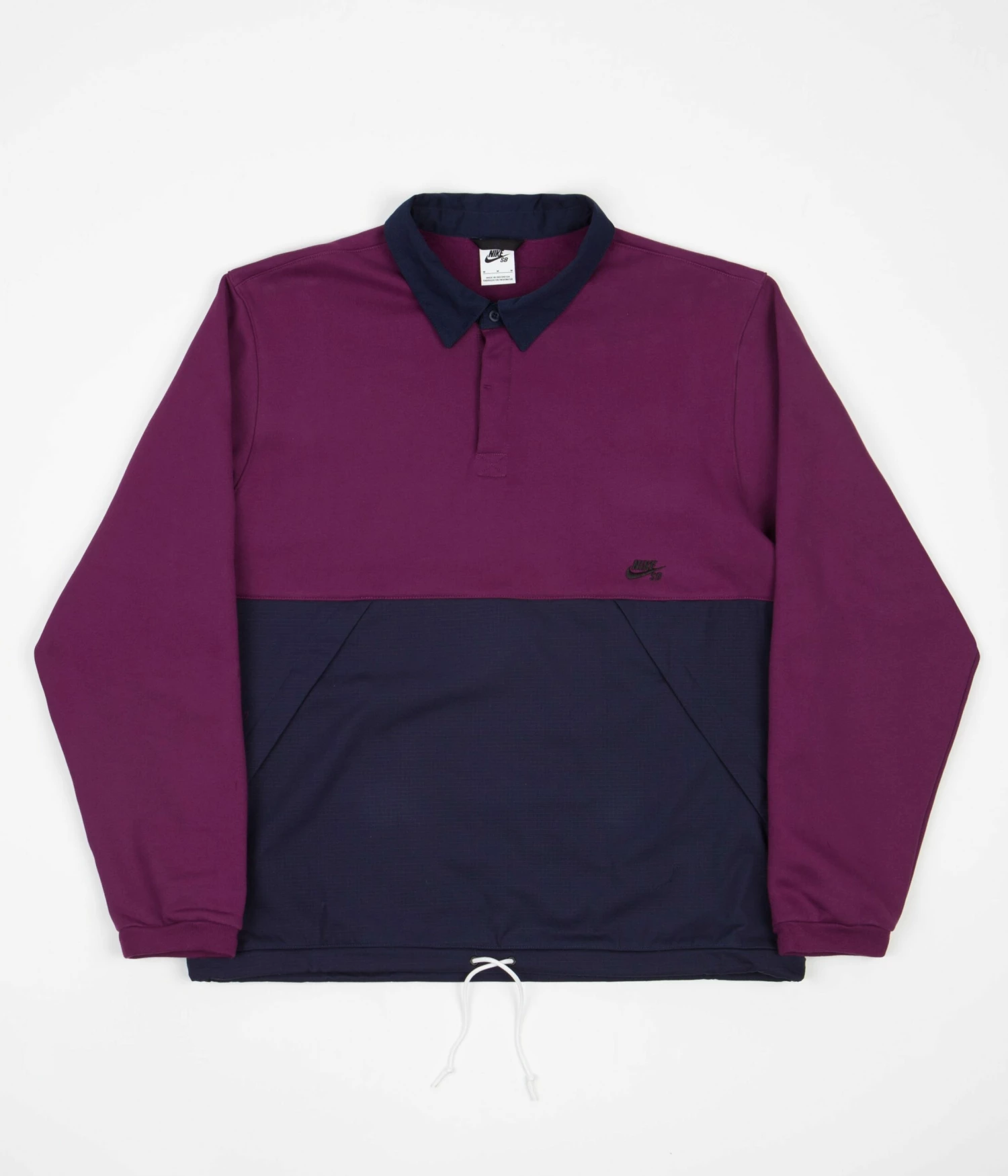 Nike SB Rugby Pullover Jacket in Sangria, Obsidian and Black. Inspired by classic team sport jerseys and crafted from a blend of 84% cotton and 16% polyester, this long sleeve Nike SB pullover jacket is tailored to a relaxed fitting for elevated all-season comfort. Styled with a mix match fabric composure with a French terry brush lined interior, this heavyweight two-tone jacket features cuffed sleeves, a drawcord adjustable hemline and a classic pointed collar neckline styled with a traditional polo placket. Embroidered ‘Nike SB’ branding can be seen across the left chest, whilst two zip secured handwarmer pockets are neatly integrated into the all-weather woven waist panel for increased on-the-go functionality.