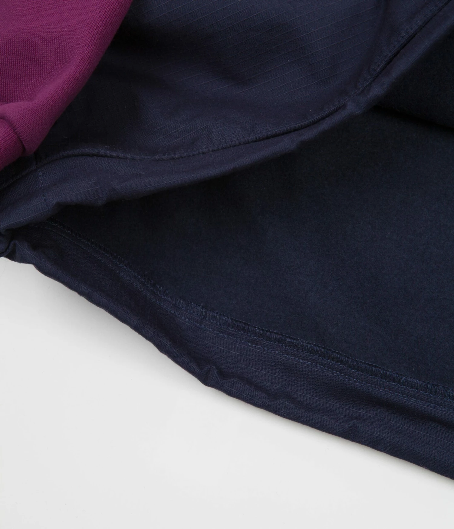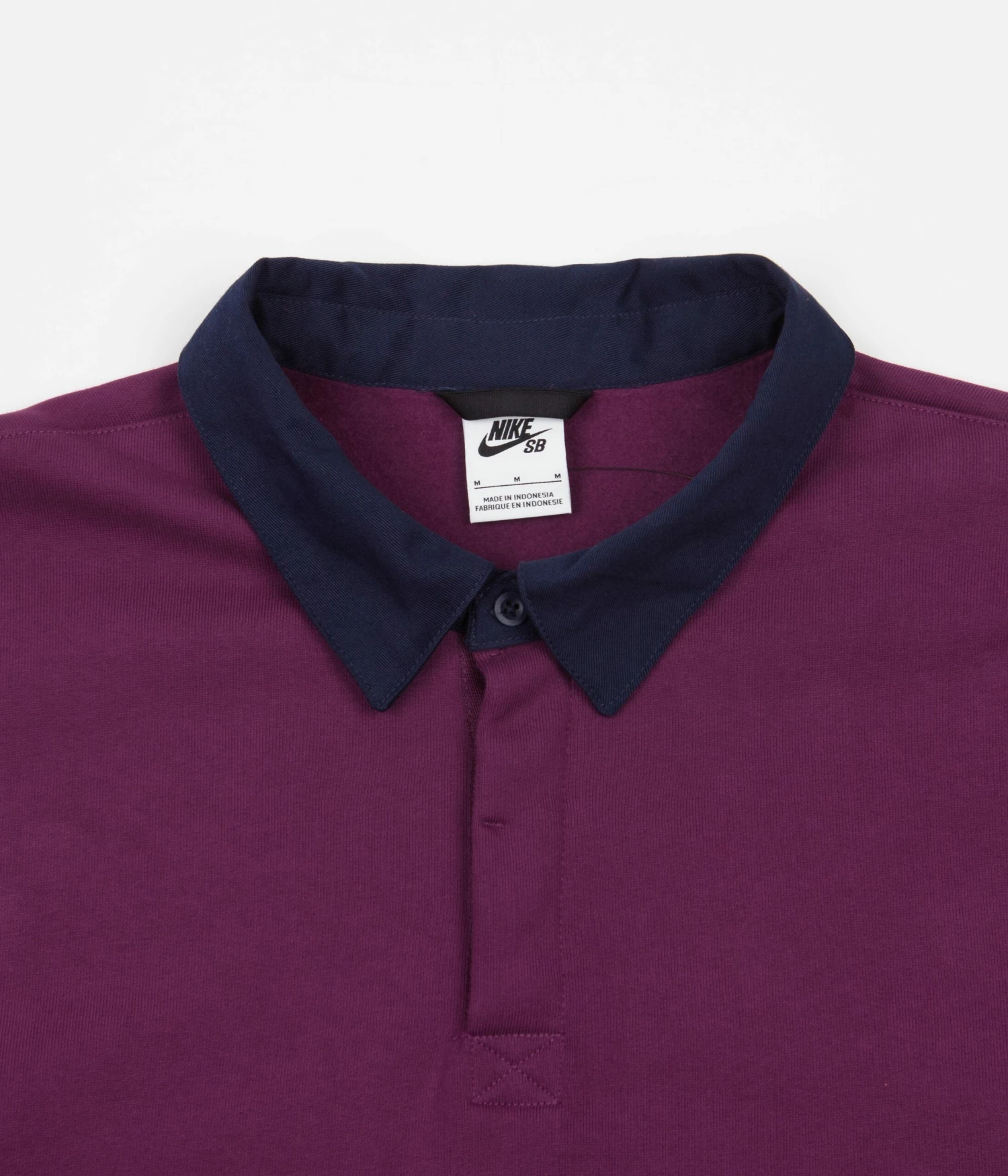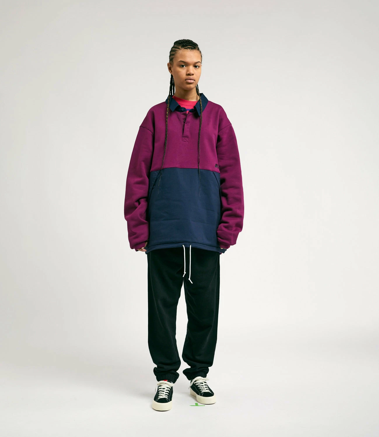 Nike SB Rugby Pullover Jacket in Sangria, Obsidian and Black. Inspired by classic team sport jerseys and crafted from a blend of 84% cotton and 16% polyester, this long sleeve Nike SB pullover jacket is tailored to a relaxed fitting for elevated all-season comfort. Styled with a mix match fabric composure with a French terry brush lined interior, this heavyweight two-tone jacket features cuffed sleeves, a drawcord adjustable hemline and a classic pointed collar neckline styled with a traditional polo placket. Embroidered ‘Nike SB’ branding can be seen across the left chest, whilst two zip secured handwarmer pockets are neatly integrated into the all-weather woven waist panel for increased on-the-go functionality.