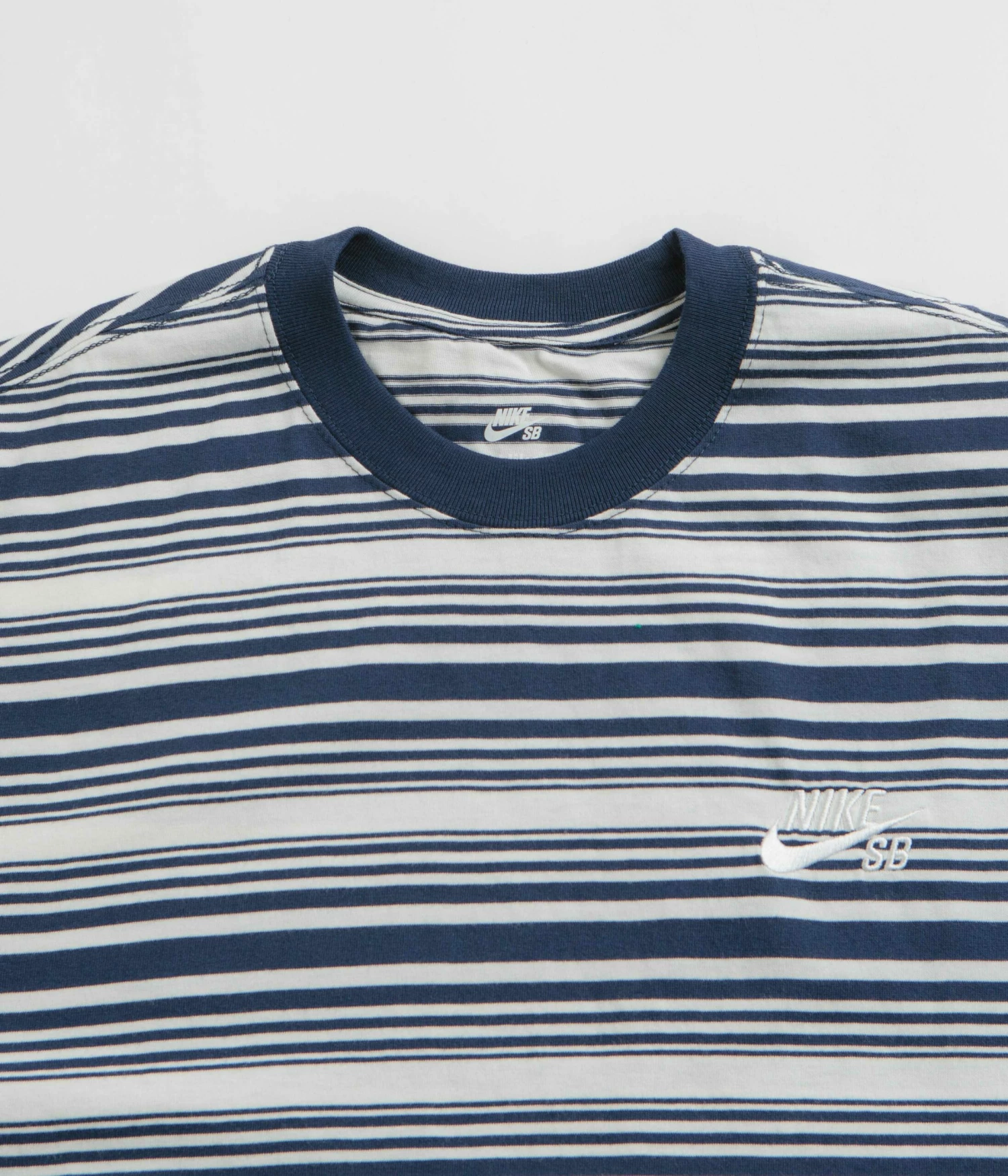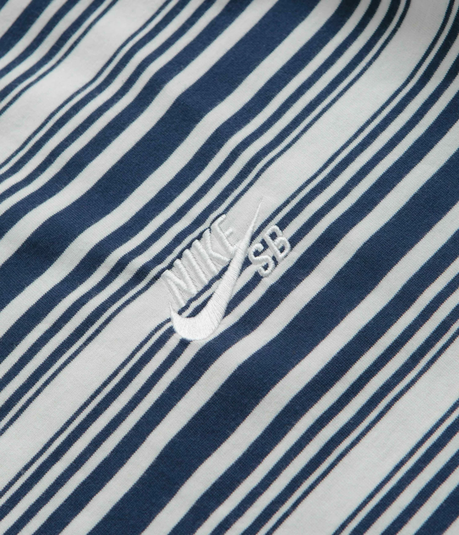 Nike SB Striped T-Shirt in Midnight Navy. Made from 100% cotton, this Nike SB t-shirt is designed with an all-over stripe and a loose, Max90 inspired fit. Featuring a crew collar, dropped shoulders and a reinforced hem, this navy Nike SB t-shirt is finished with woven flag label branding and with an embroidered logo.
