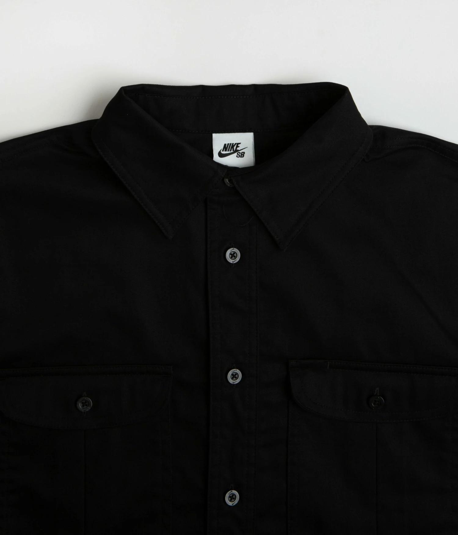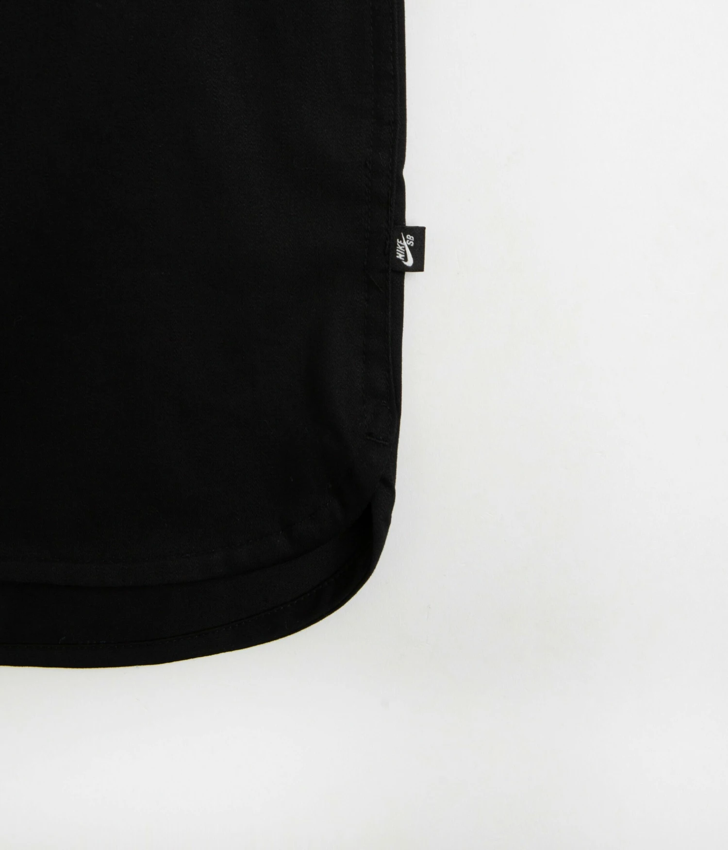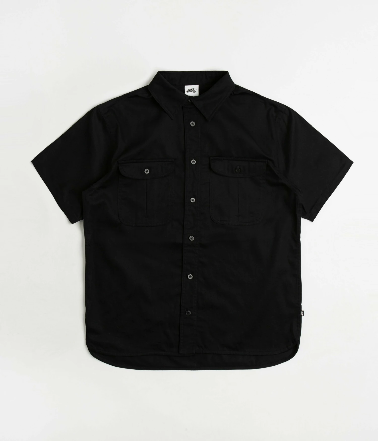 Nike SB Tanglin Short Sleeve Shirt in Black. Workwear inspired with a peached fabric texture, this loose fitting Nike SB shirt is made from 100% cotton with a fold-down collar and a full length button fastening. Featuring a curved hem and tonal stitched seams, this black Nike SB shirt is finished with two inverted box-pleat chest pockets, woven flag label branding and with a woven hanger loop sewn between the shoulders.