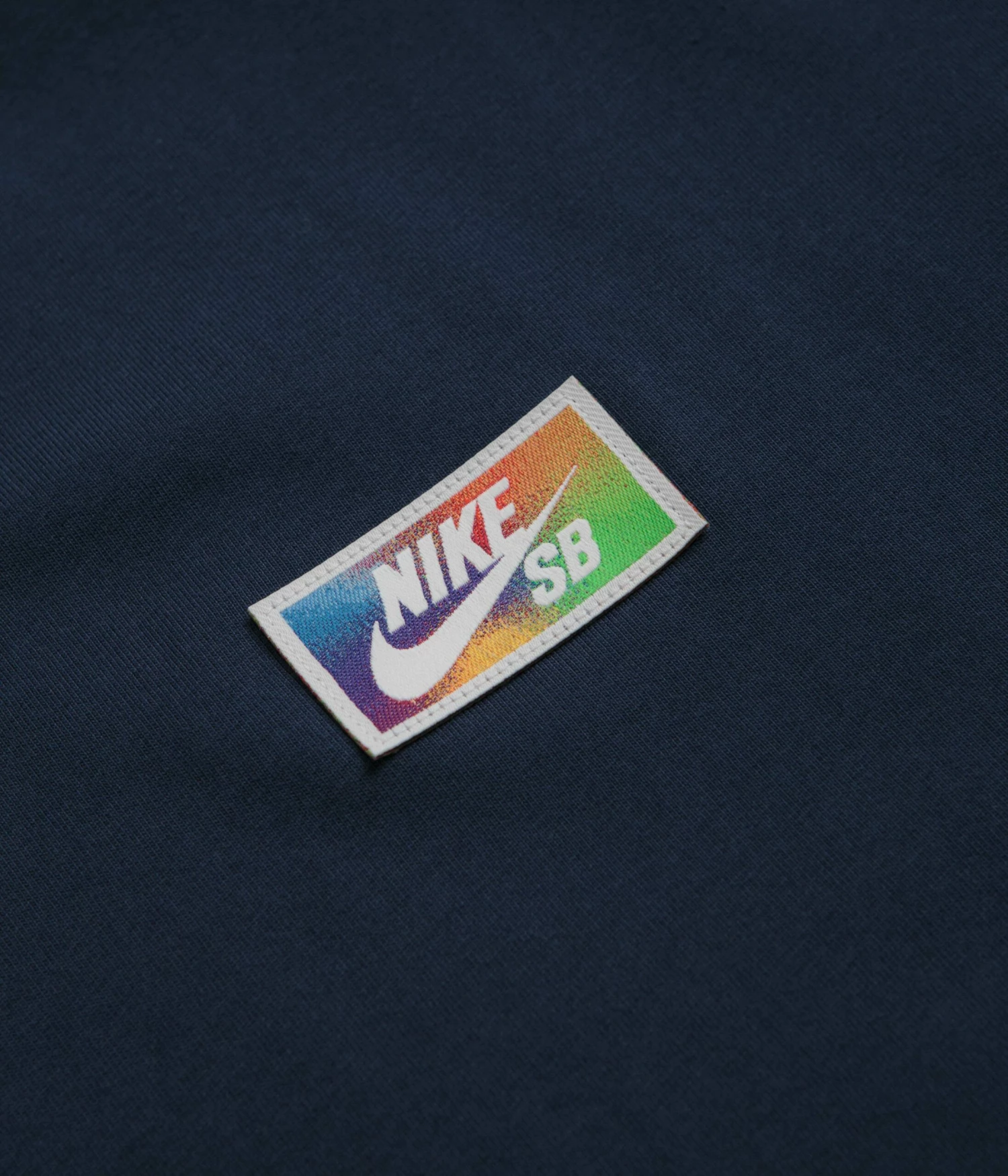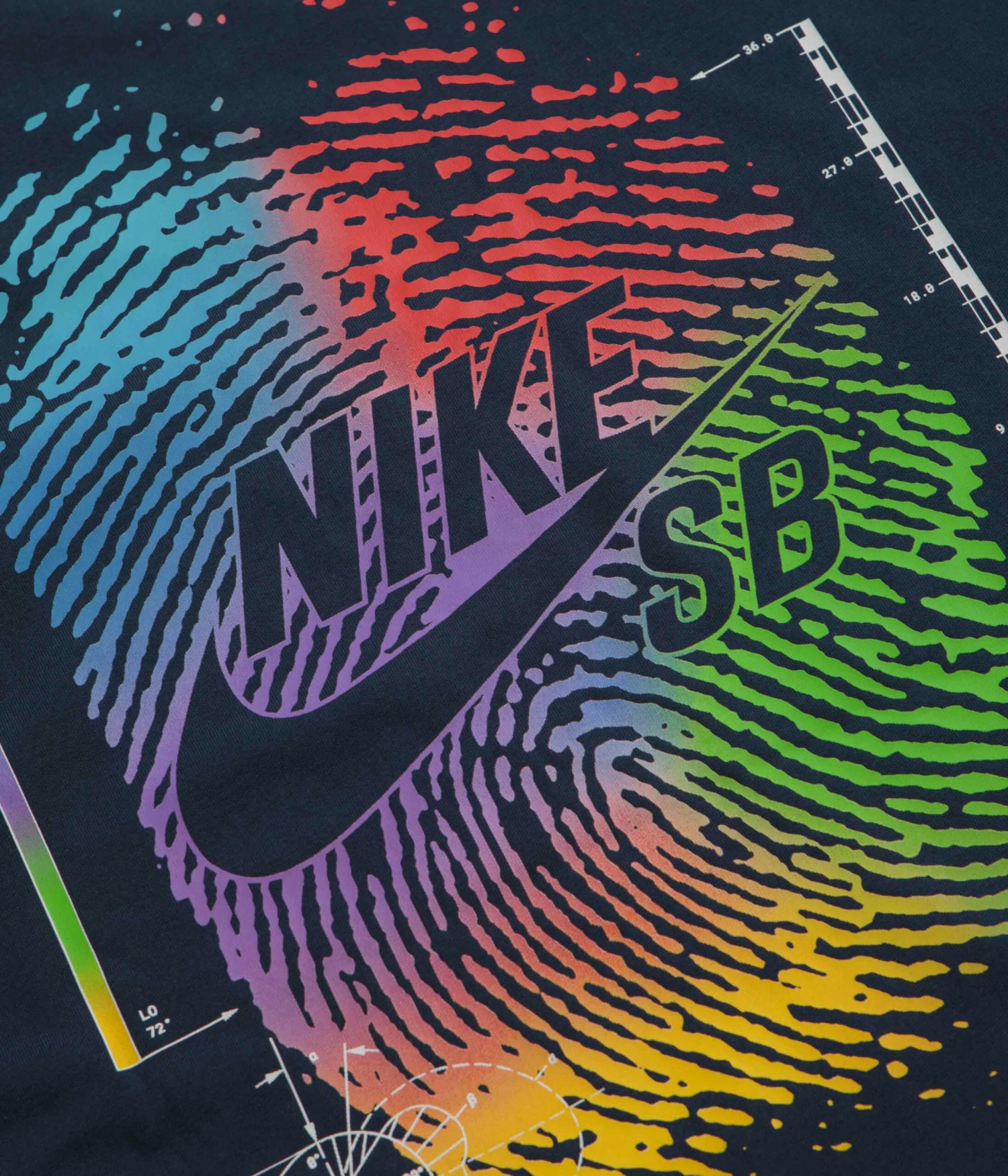 Nike SB Thumbprint T-Shirt in Midnight Navy. A midweight silhouette, this loose fitting Nike SB t-shirt is made from 100% cotton. Featuring a flexible rib knit collar, dropped shoulders and a flag labelled side seam, this navy Nike SB t-shirt is finished with printed front and rear graphics.