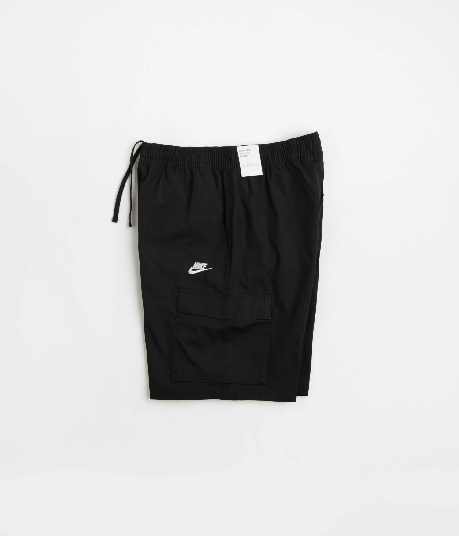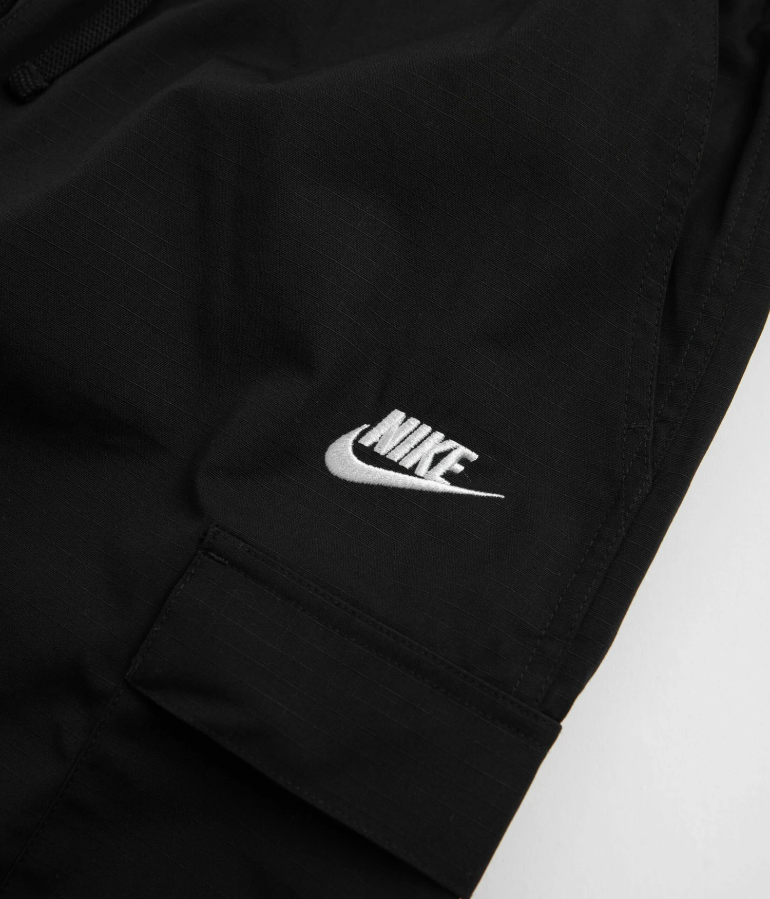 Nike Club Cargo Shorts in Black and White. Tailored to a regular fitting with an above-knee length, these Nike shorts are made from 100% cotton ripstop. Featuring a drawstring waist, tonal stitched seams and additional cargo pockets, these Nike Club shorts are finished with two side pockets, a single rear pocket and with an embroidered Futura Swoosh logo.