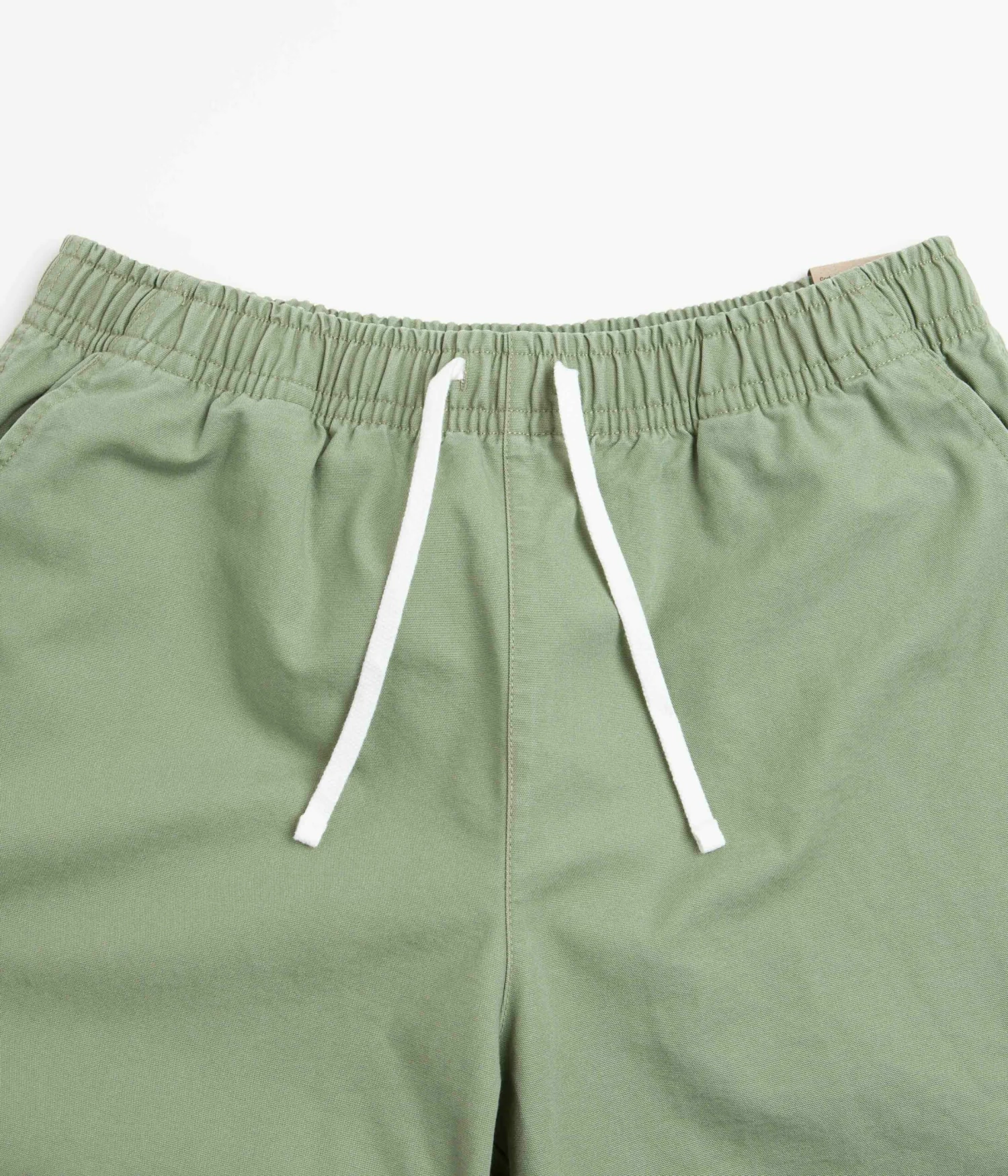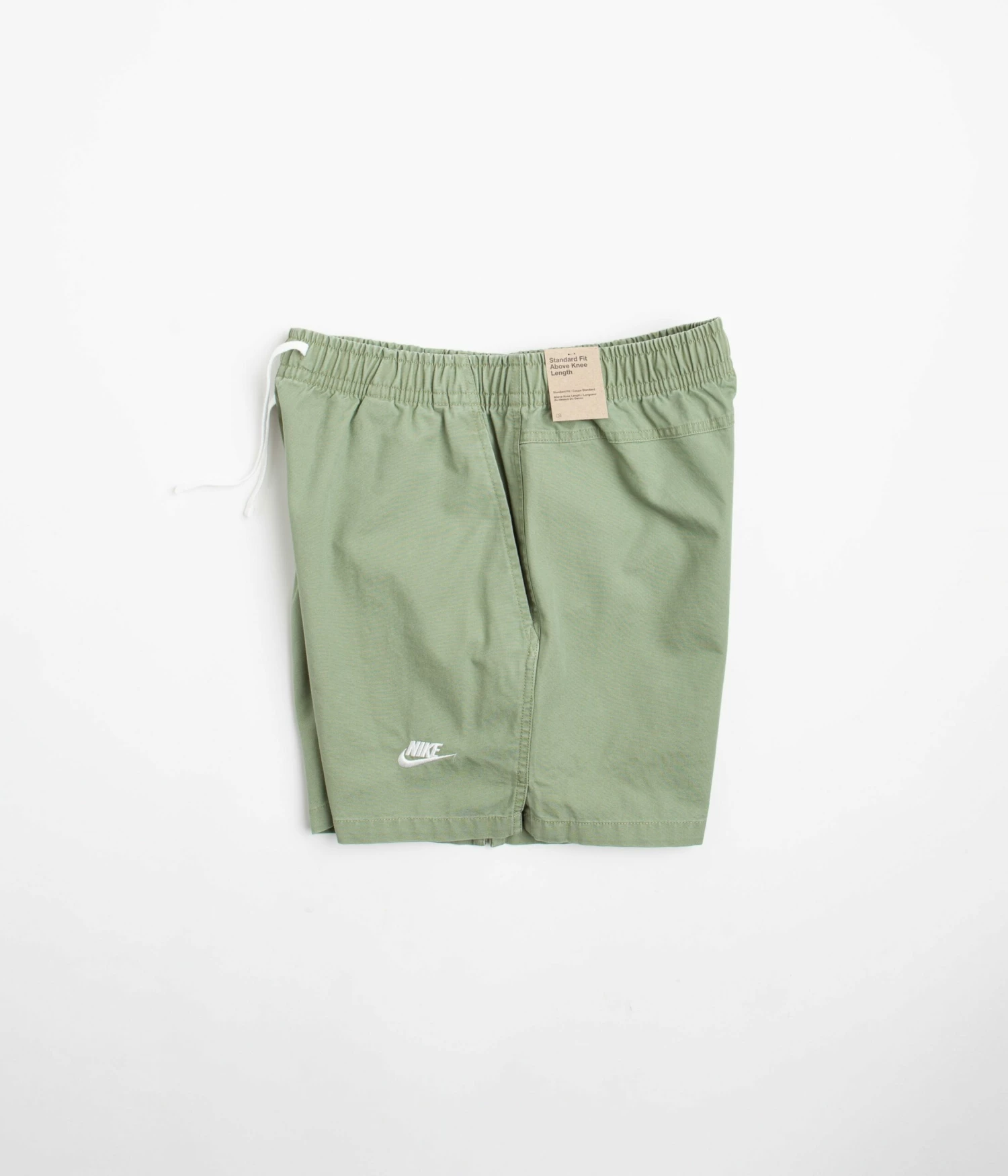 Nike Club Flow Shorts in Oil Green and White. Regular fitting and styled with tonal stitched seams, these Nike shorts are cut to an above-knee length from 100% cotton canvas. Featuring an elasticated drawstring waistband, these oil green Nike Club shorts are finished with two side pockets, a single rear pocket and with an embroidered Futura Swoosh logo.