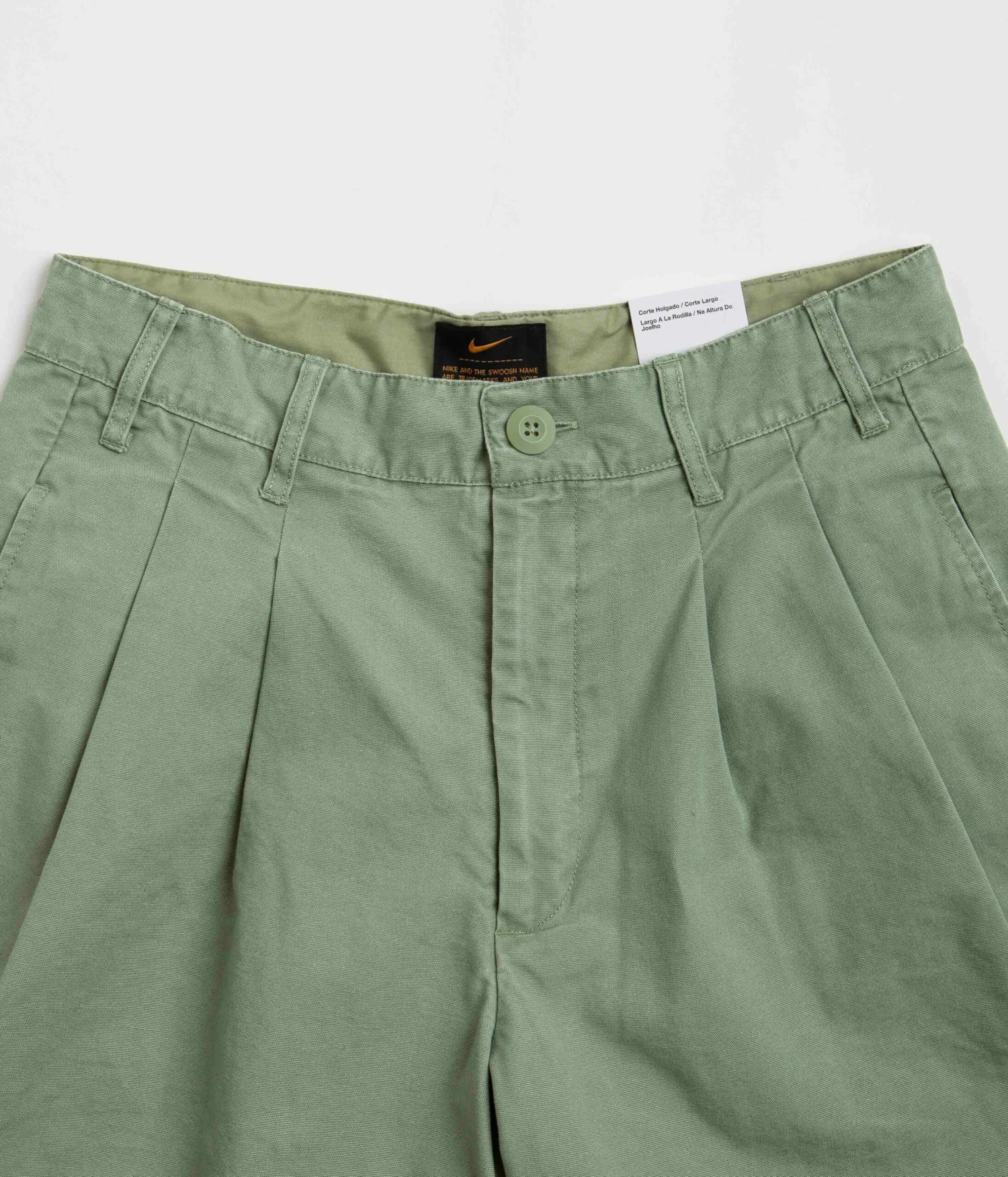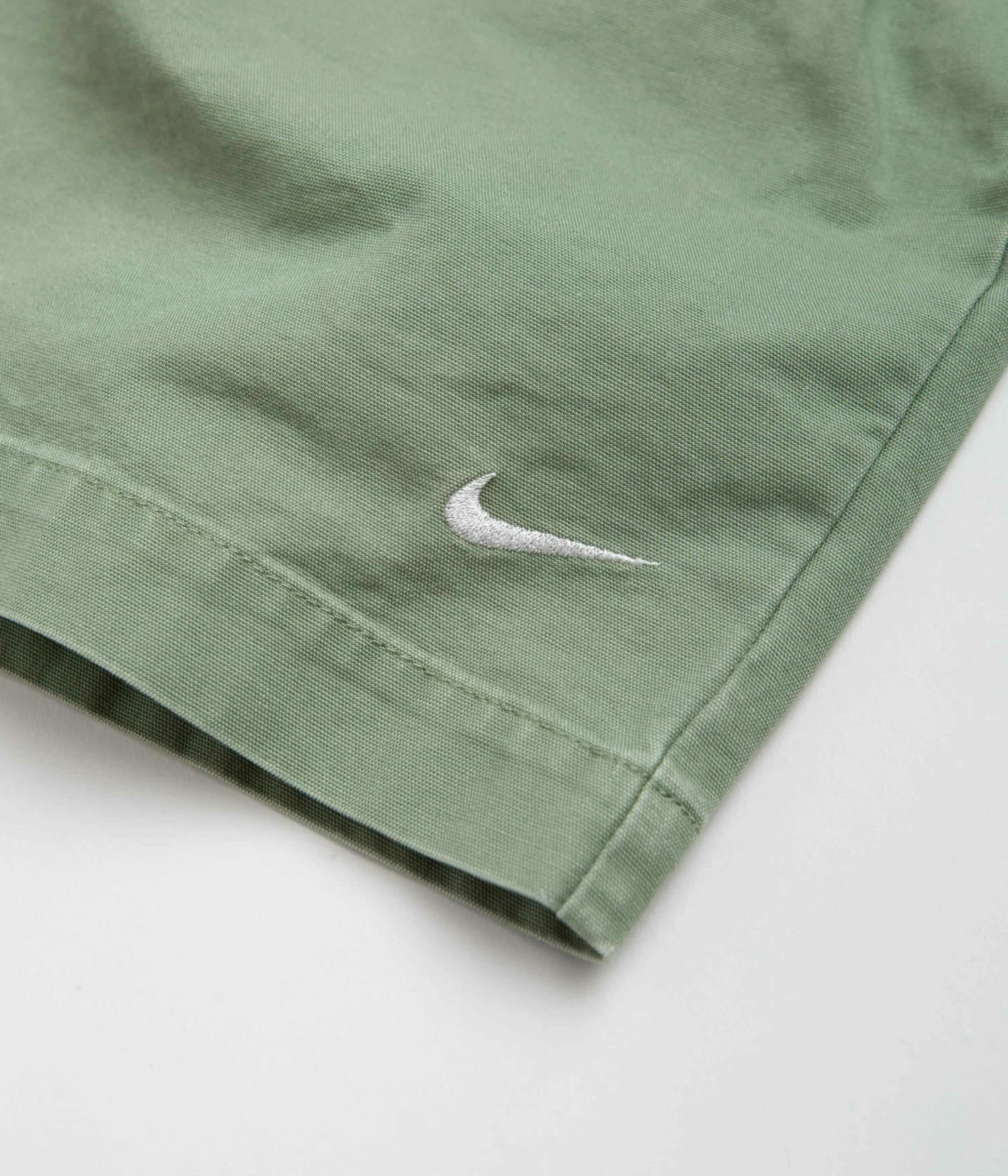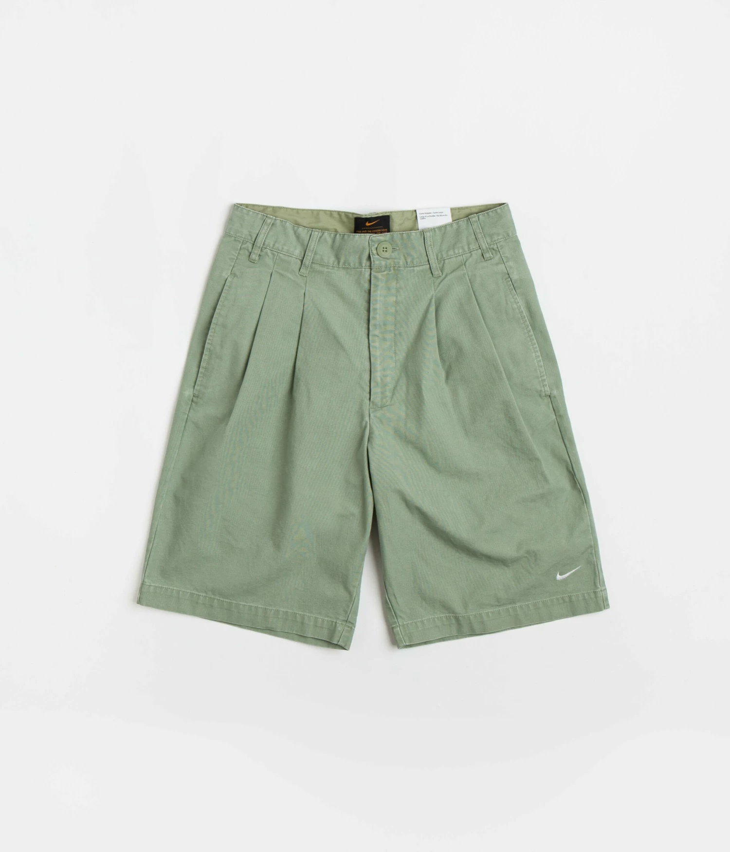 Nike Pleated Chino Shorts in Oil Green and White. Part of the brand’s Nike Life collection, these utility style Nike shorts are tailored to a relaxed fitting with a knee length cut. Featuring pleated front panels with a 100% cotton construction, these green Nike chino shorts are finished with a zippered fly, two side pockets, two flap-over rear pockets and with an embroidered Swoosh sewn above the left cuff.