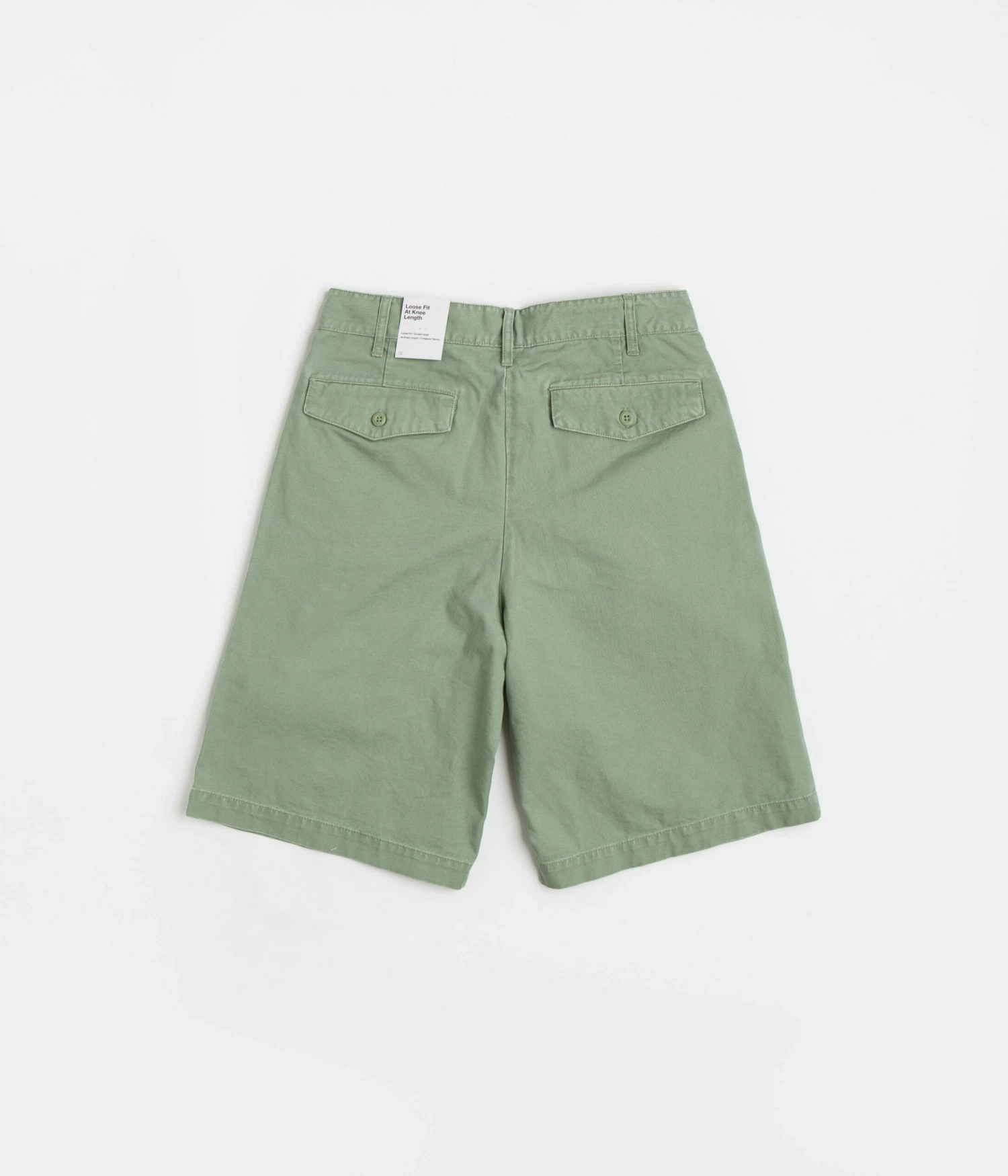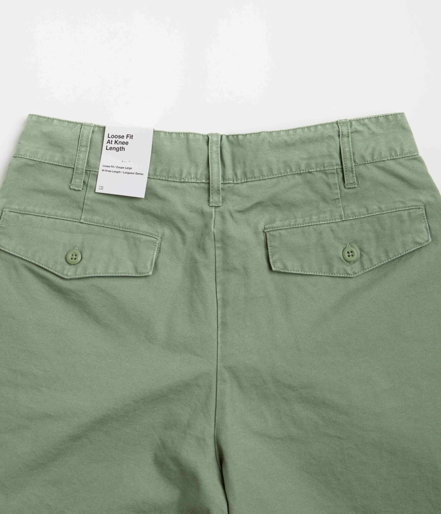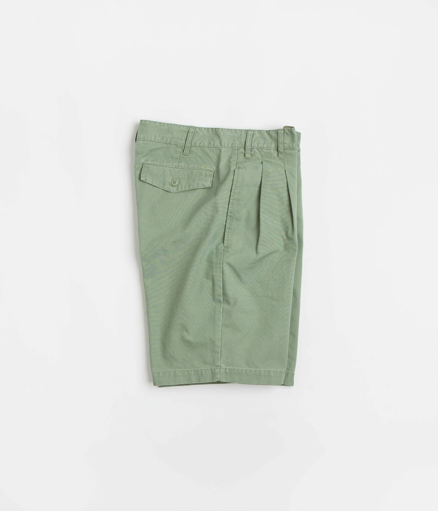 Nike Pleated Chino Shorts in Oil Green and White. Part of the brand’s Nike Life collection, these utility style Nike shorts are tailored to a relaxed fitting with a knee length cut. Featuring pleated front panels with a 100% cotton construction, these green Nike chino shorts are finished with a zippered fly, two side pockets, two flap-over rear pockets and with an embroidered Swoosh sewn above the left cuff.