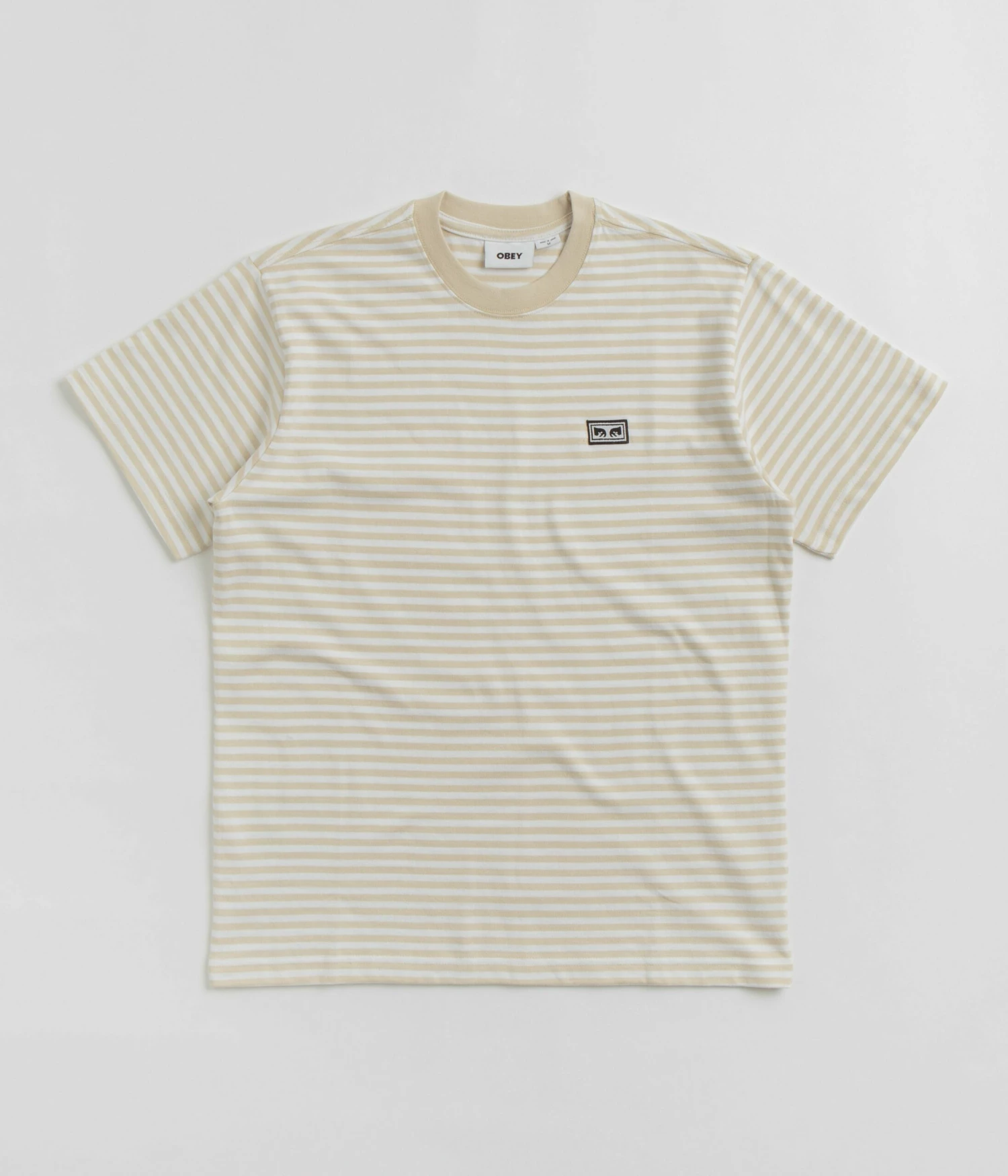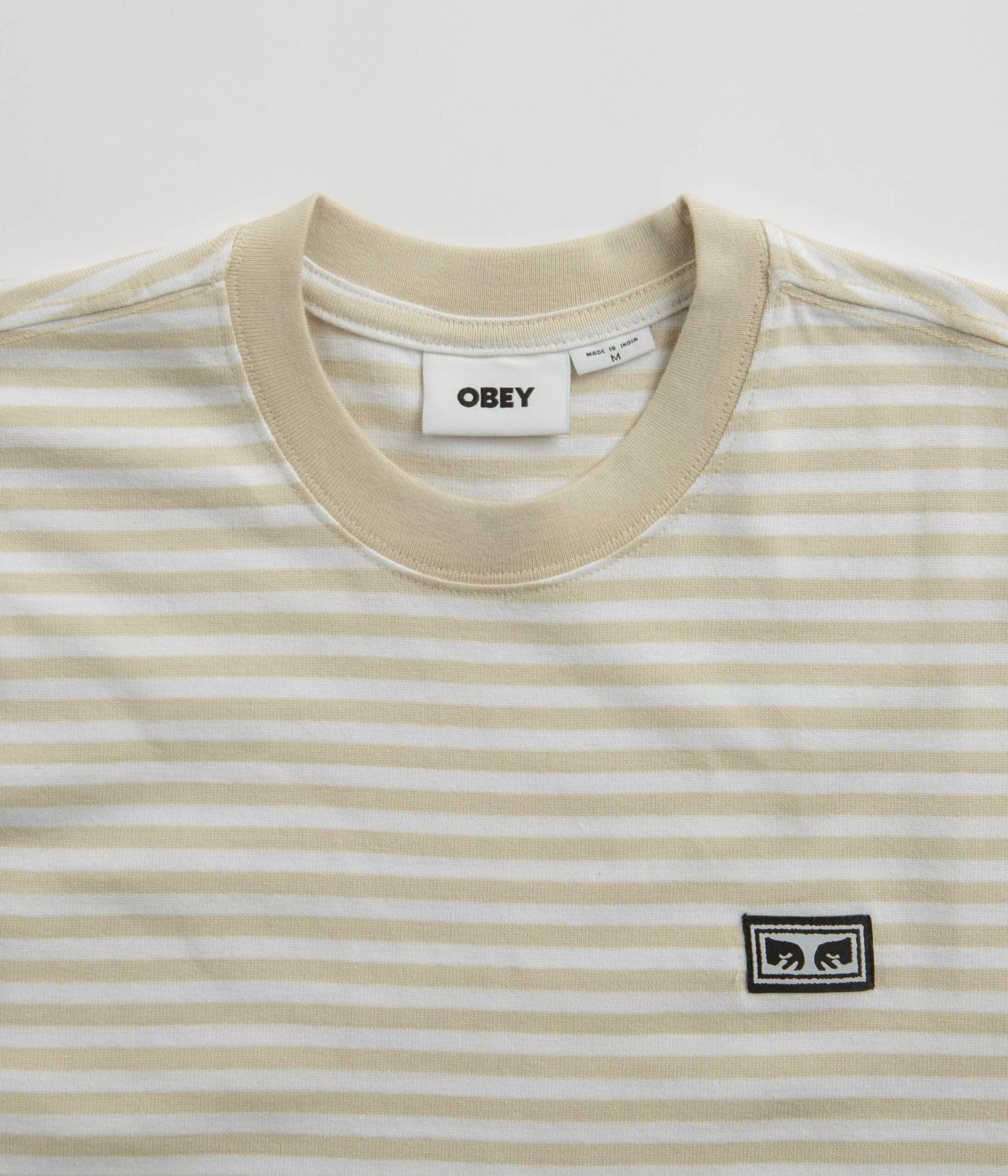 Obey Established Works Eyes Stripe T-Shirt in Clay Multi. Made from 100% cotton with a yarn dyed stripe, this Obey t-shirt is designed with a colour black crew collar and a reinforced hem. Finished in a shade of beige khaki with an embroidered left chest label.