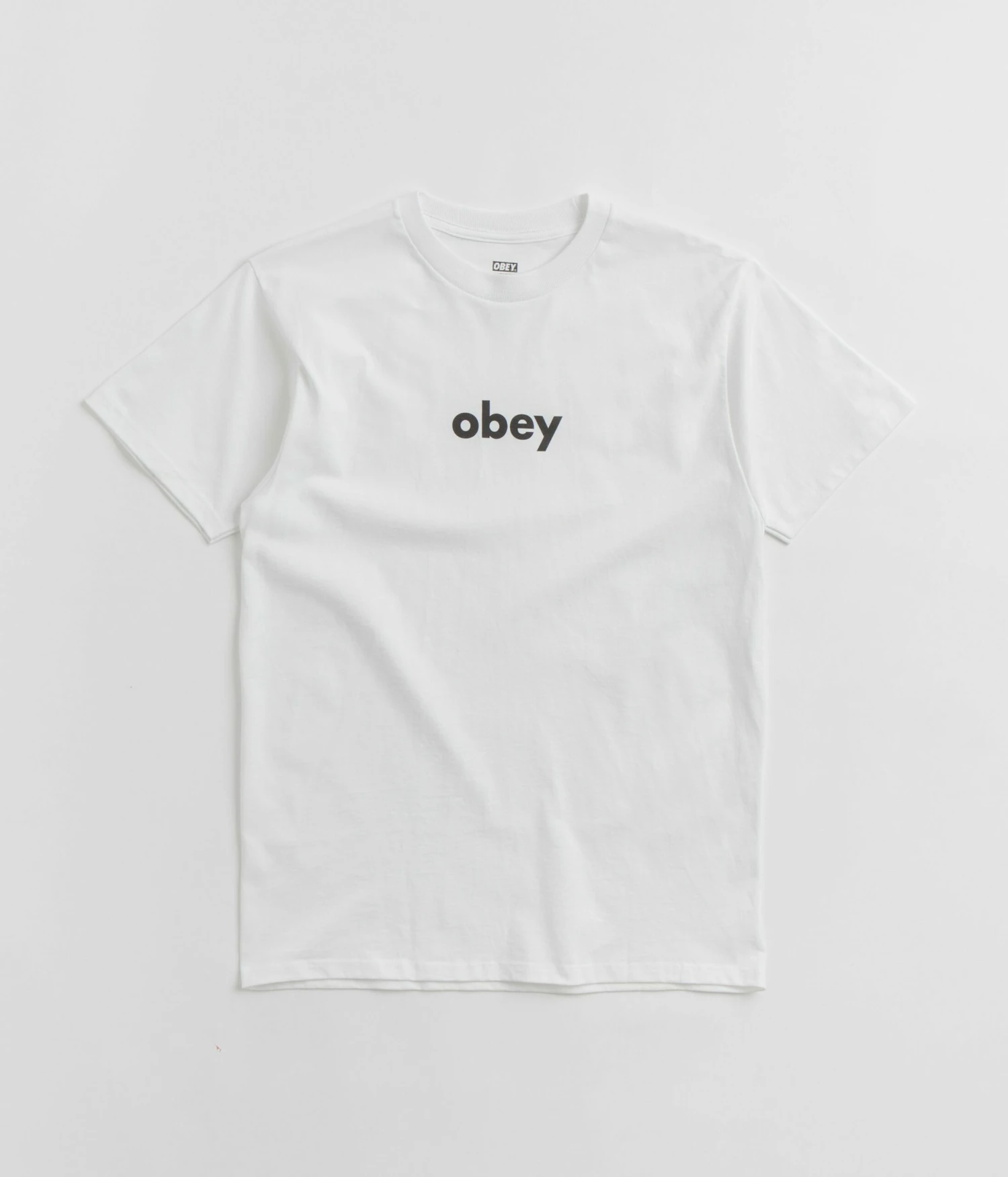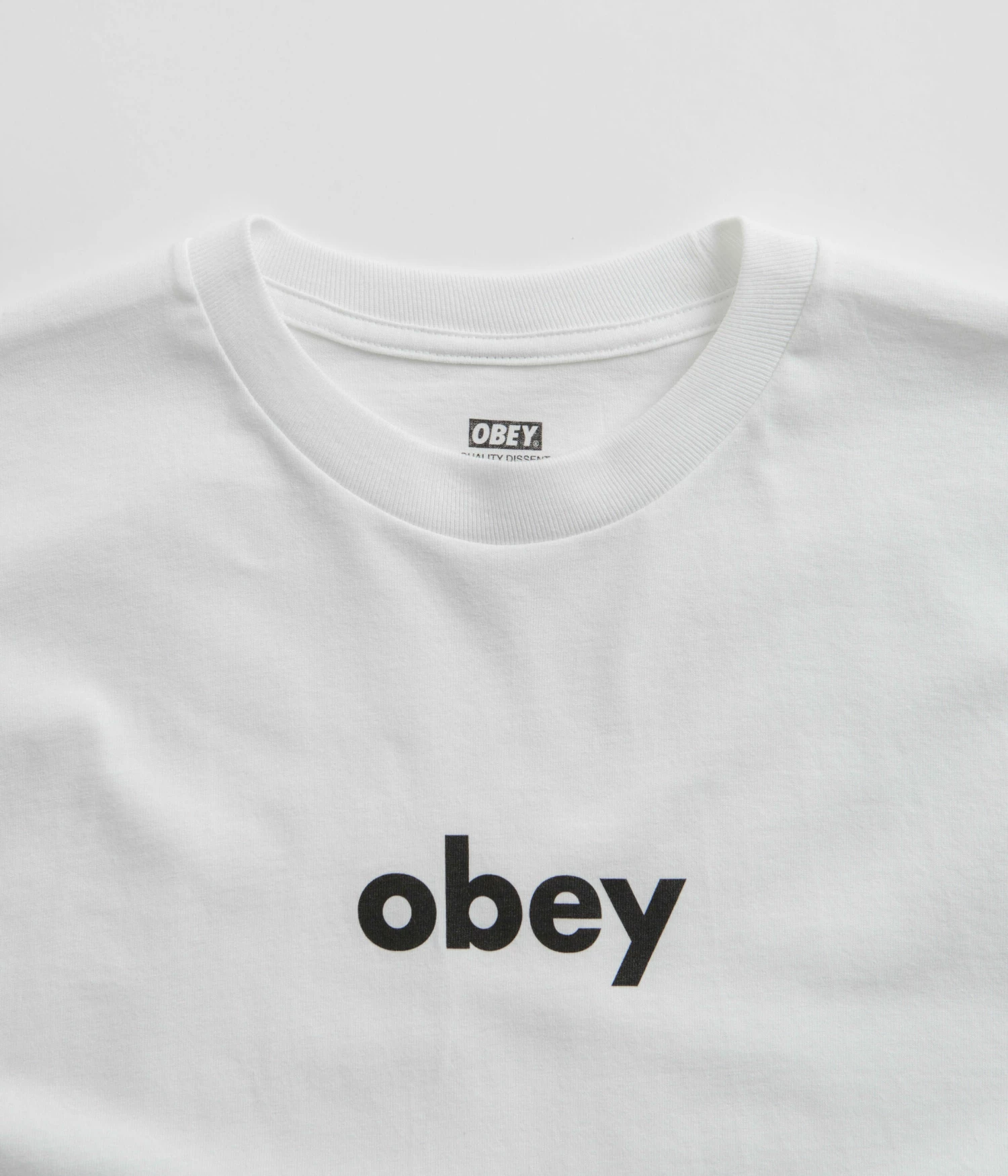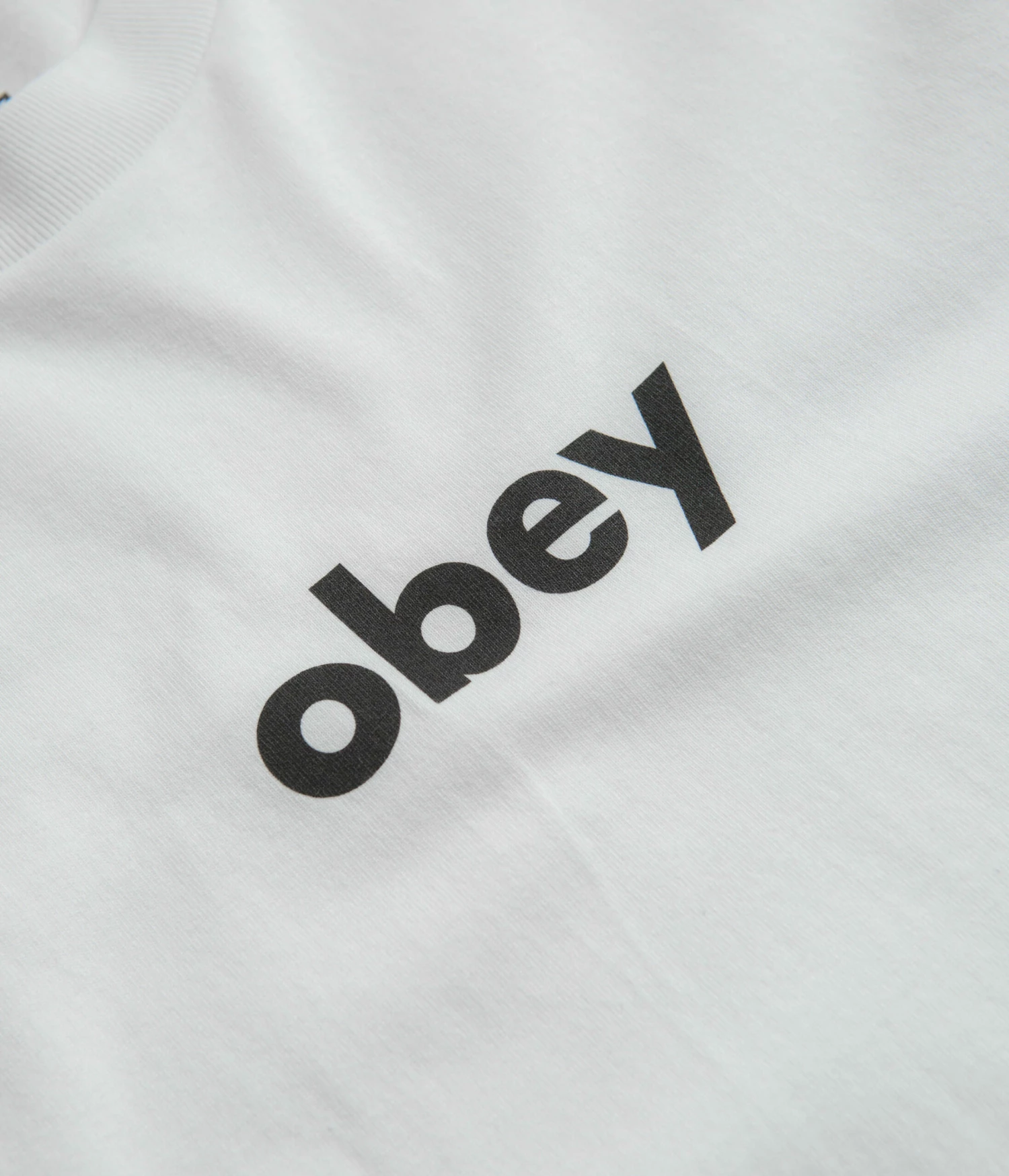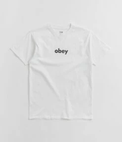 Obey Lower Case 2 T-Shirt in White. Regular fitting and made from 100% cotton, this block tone Obey t-shirt is designed with a classic crew collar and a reinforced hem. Finished in a shade of white with a printed lowercase chest logo.