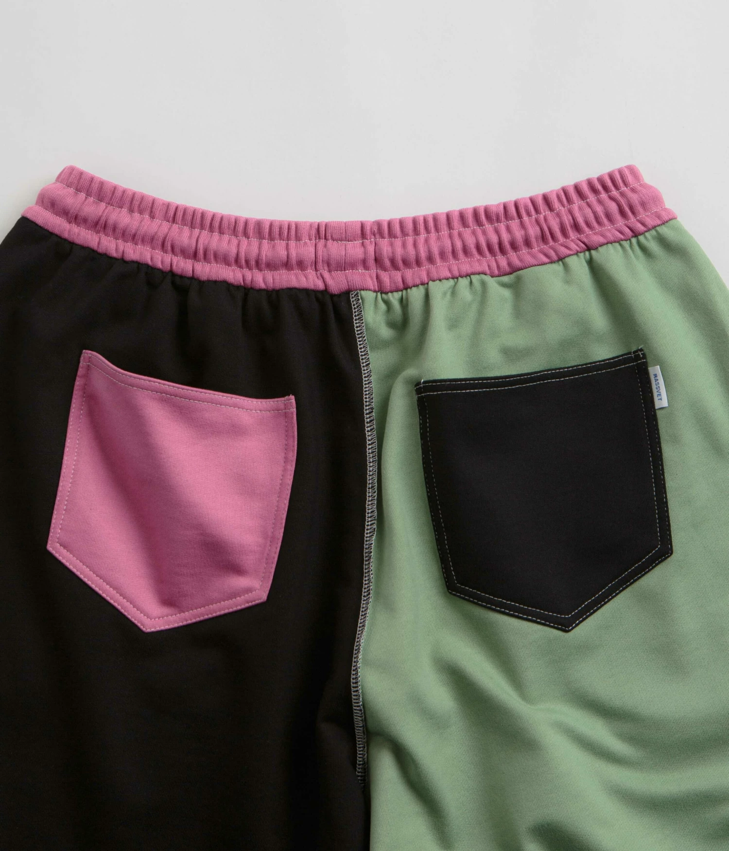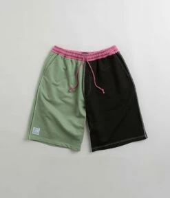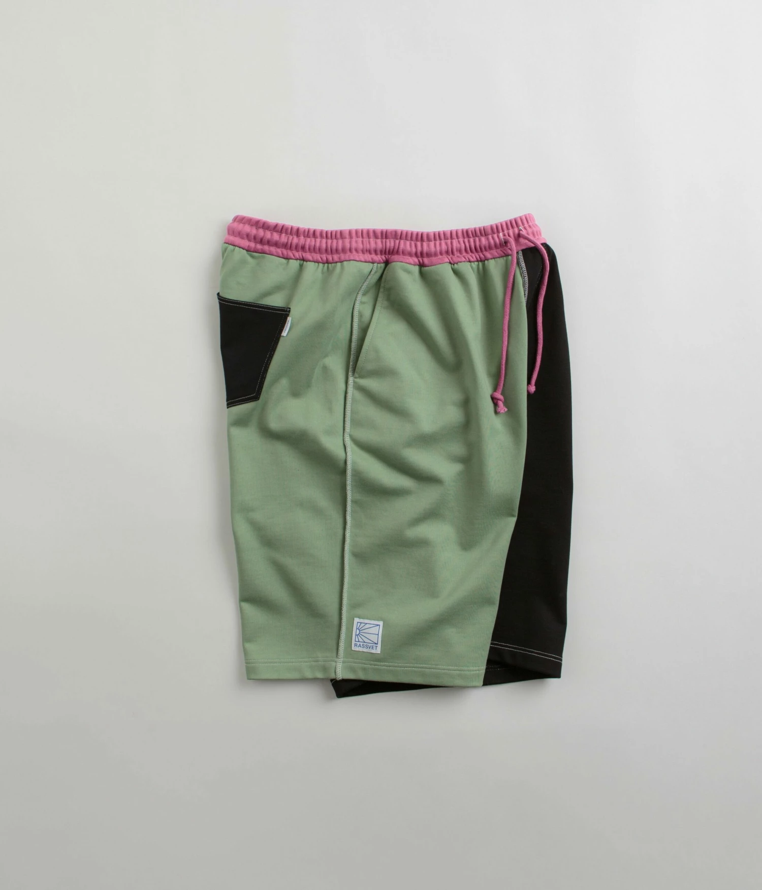 PACCBET Mix Sweat Shorts in Khaki. Regular fitting and designed with contrasting leg panels, these PACCBET sweat shorts are made from 100% cotton. Featuring an elasticated drawstring waist, two side pockets and rear pockets, these khaki PACCBET shorts are cut to knee length and are finished with an embroidered patch graphic.