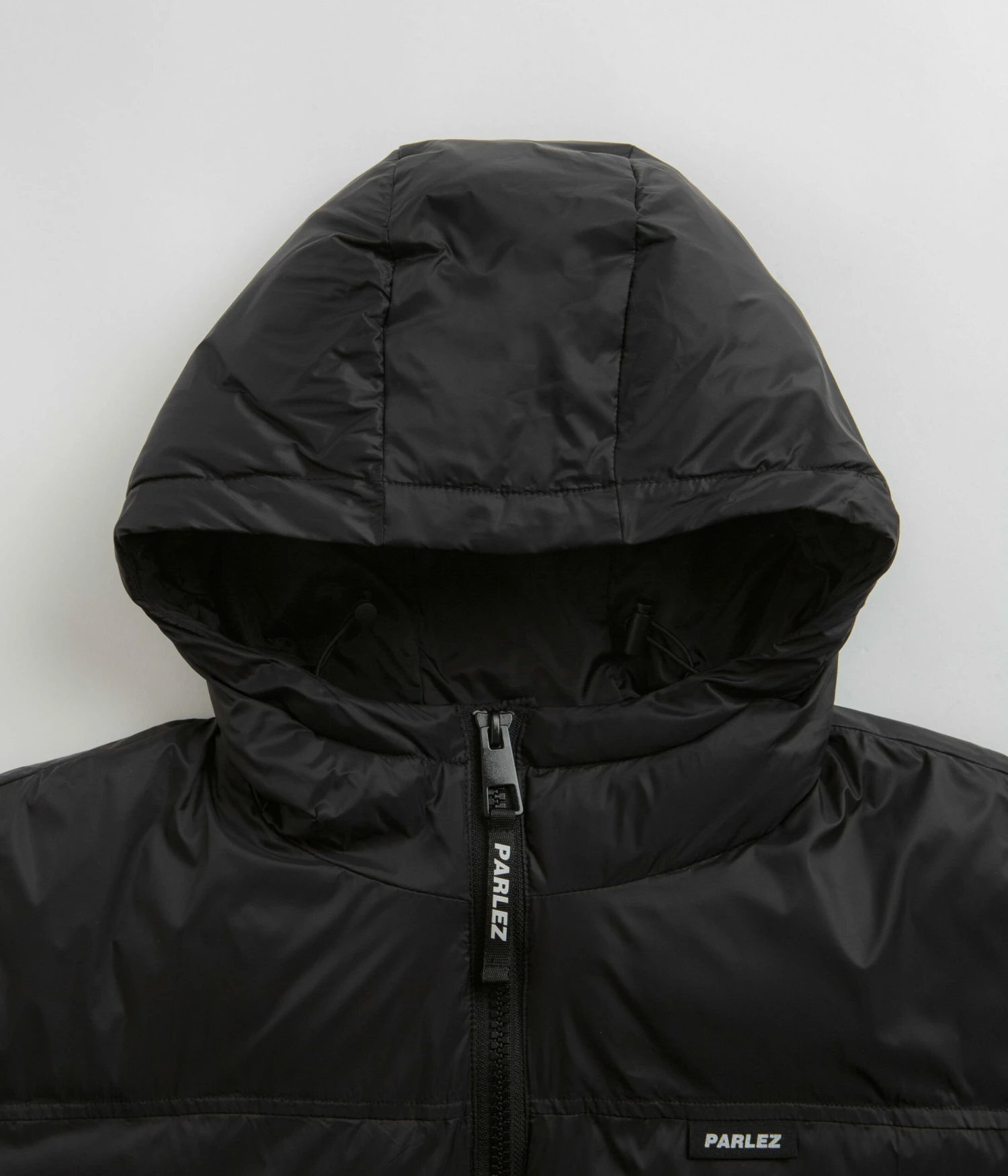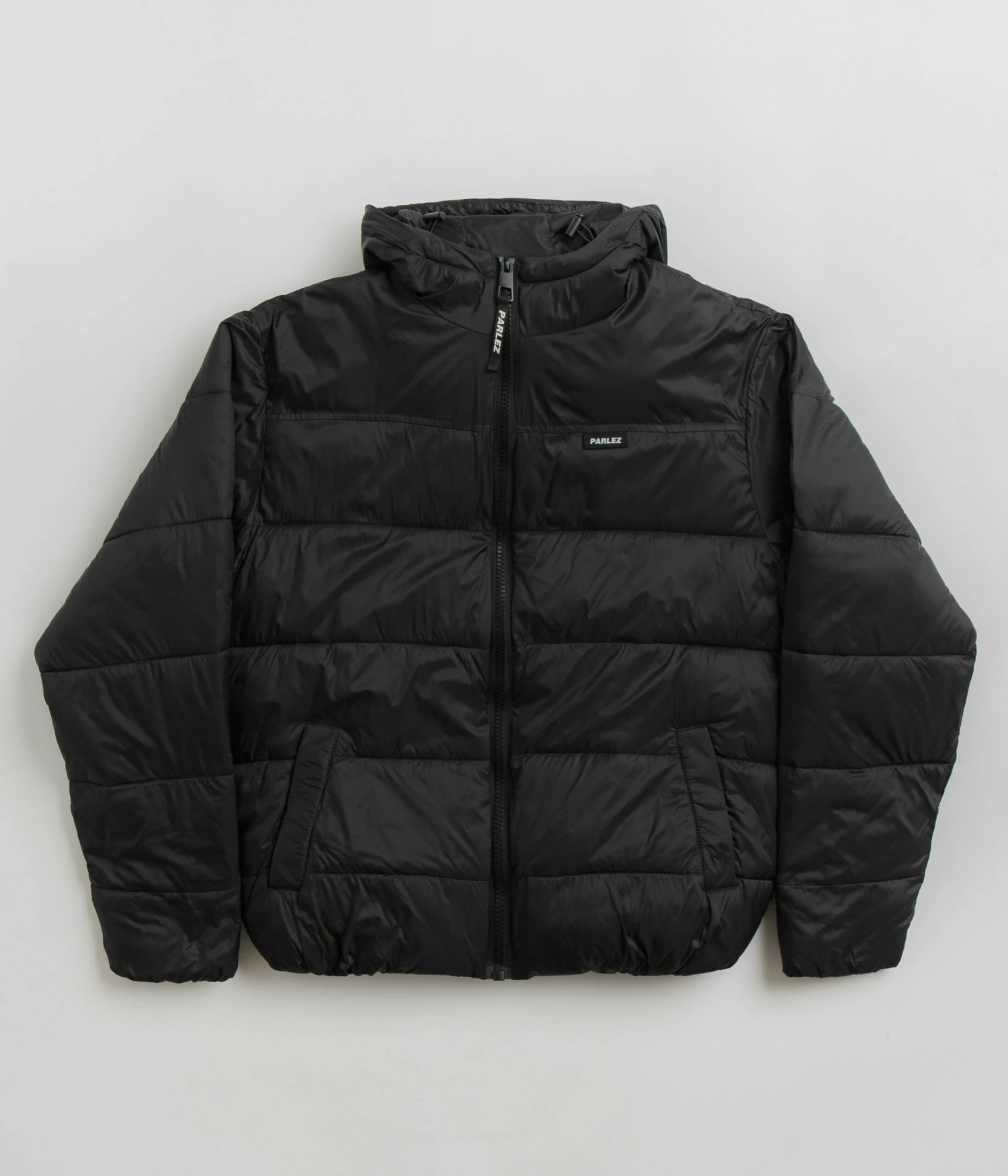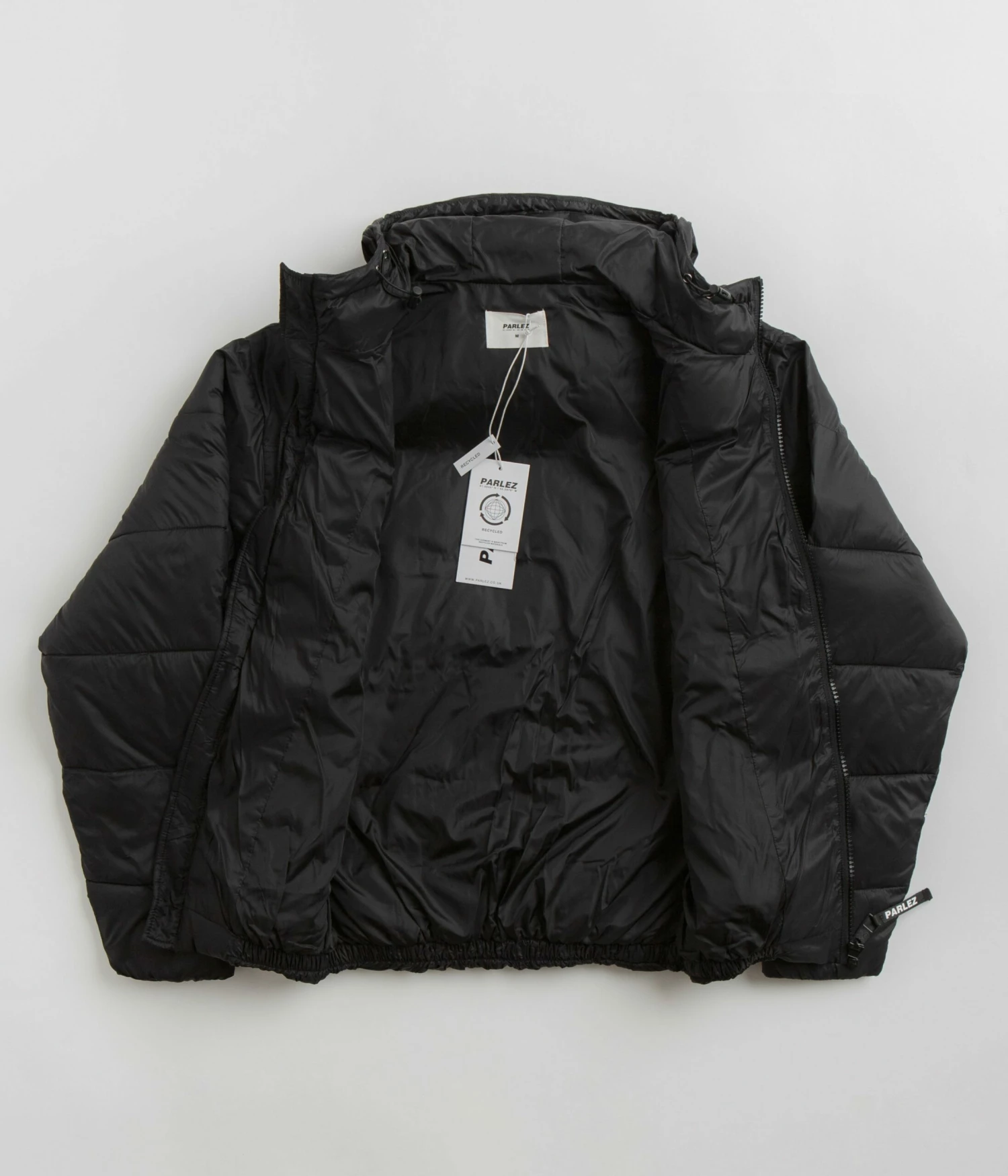 Parlez Caly Puffer Jacket in Black. Made from 100% recycled nylon with 300g recycled insulation, this regular fitting Parlez jacket is designed with a recycled polyester taffeta lining. Featuring a full length Vislon zipper, an elasticated hood, elasticated cuffs and a woven elastic hem, this black Parlez jacket is finished with two waist pockets, a rubber sleeve patch and a branded flag label.