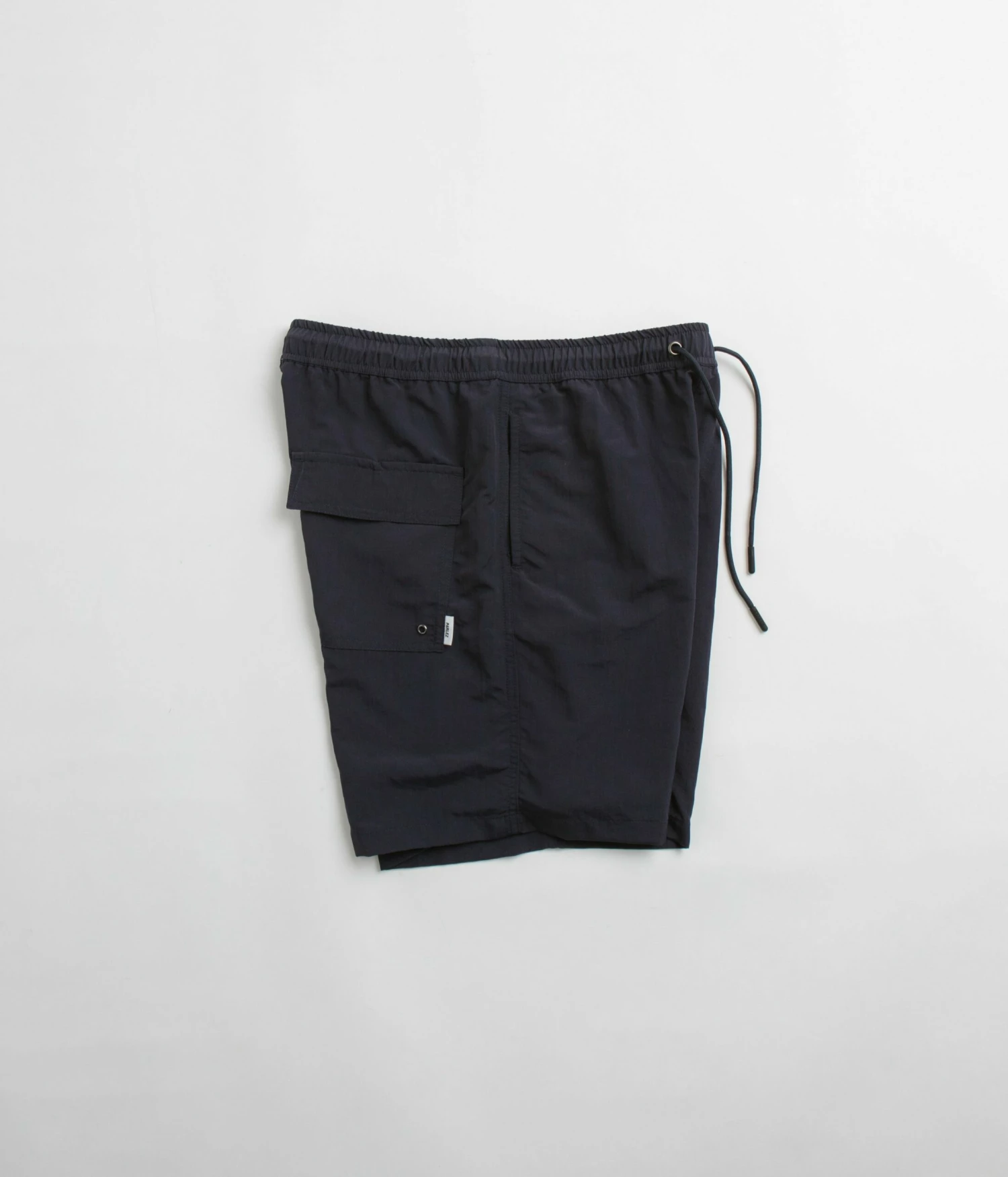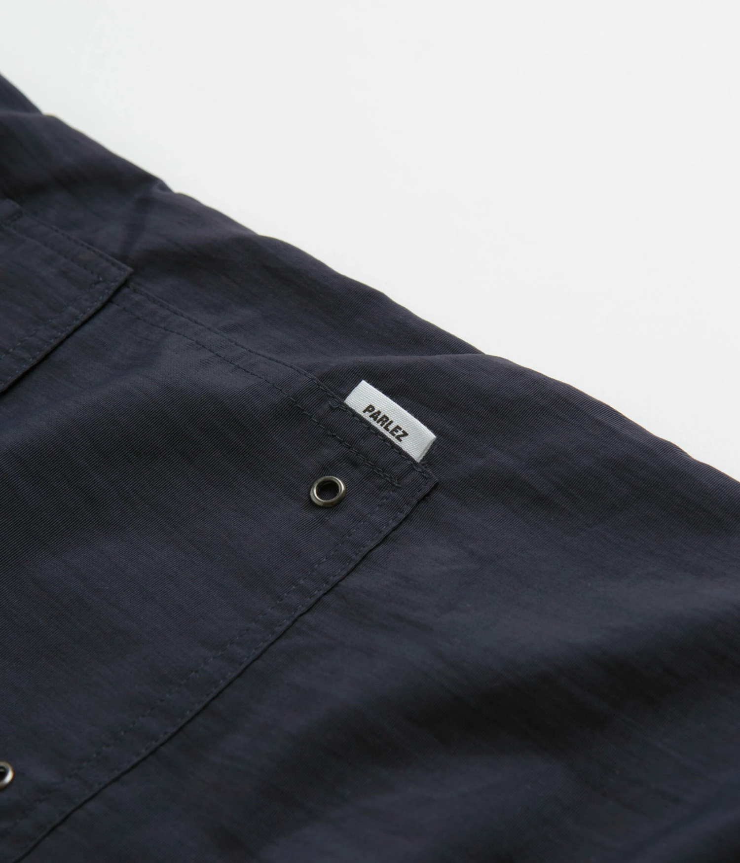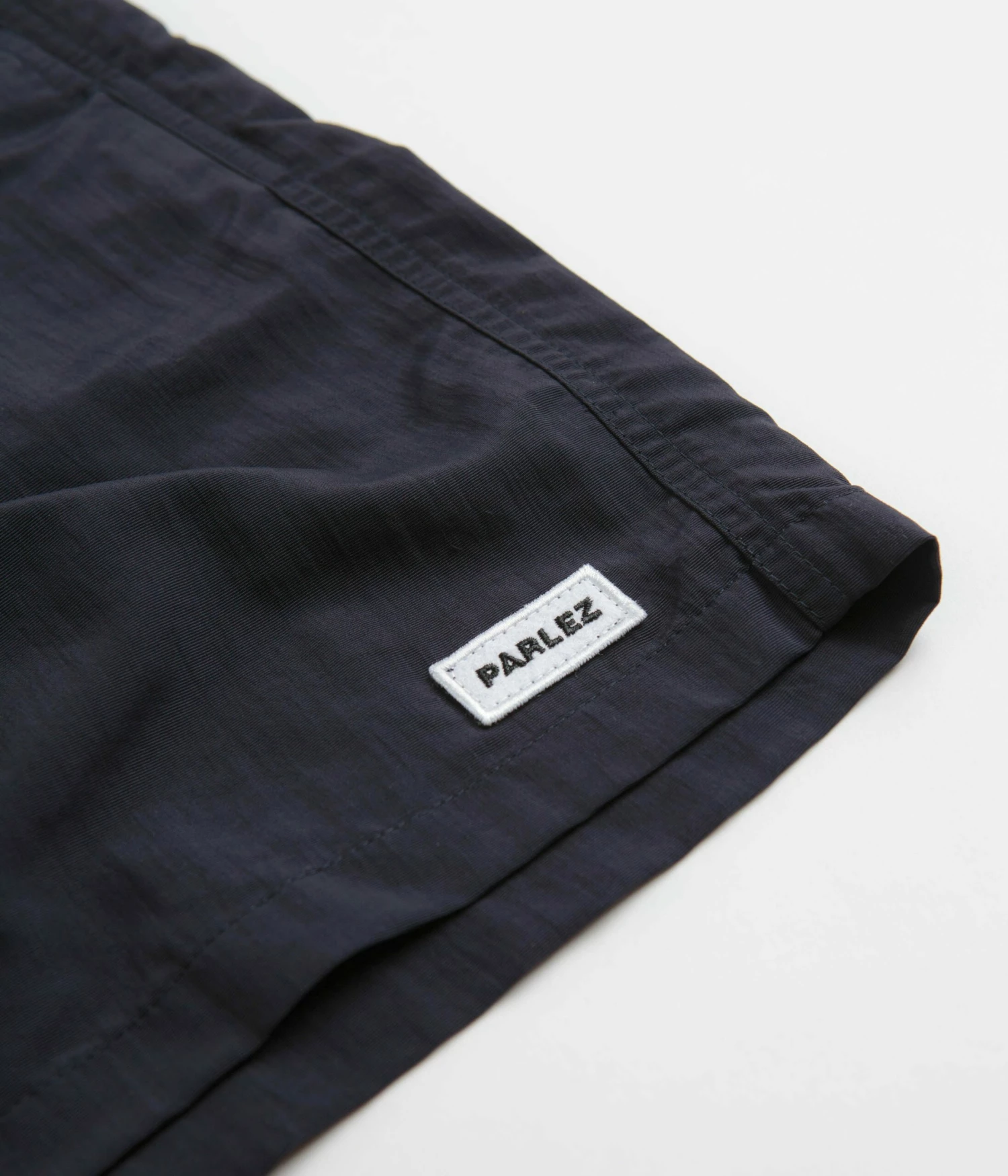 Parlez Rival Swim Shorts in Navy. A colour block staple from the brand’s latest collection, these quick drying Parlez swim shorts are tailored to a relaxed fitting from 100% recycled nylon. Cut to an above-knee fit with a woven elastic waist, these navy coloured shorts also feature drawcord fastenings and a breathable mesh lined interior. Finished with two side pockets with a key loop attachment and with an embroidered ‘Parlez’ brand patch above the left cuff.