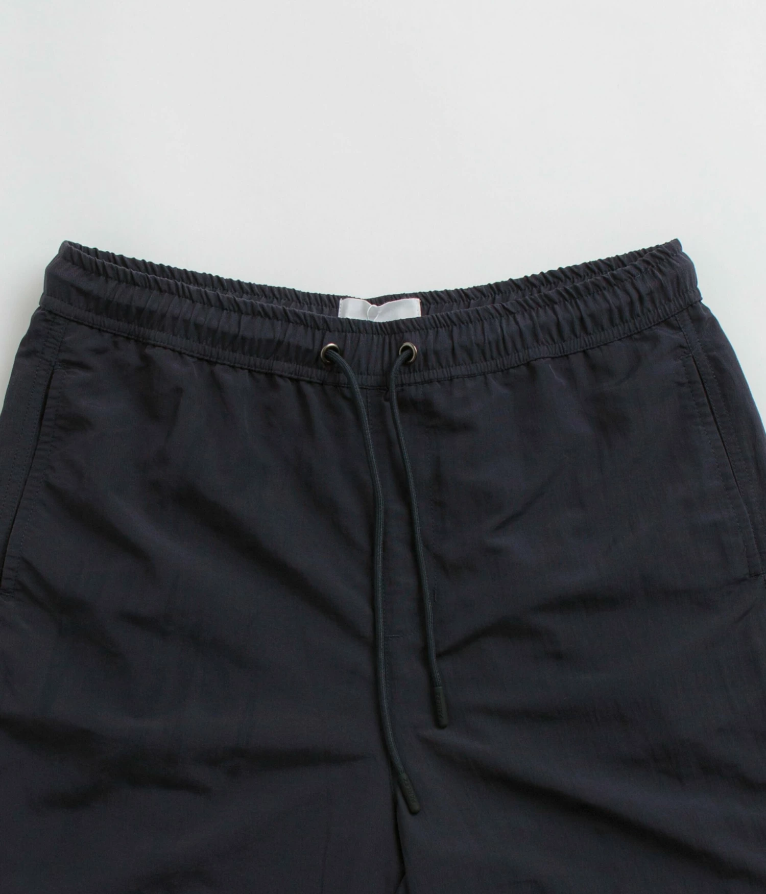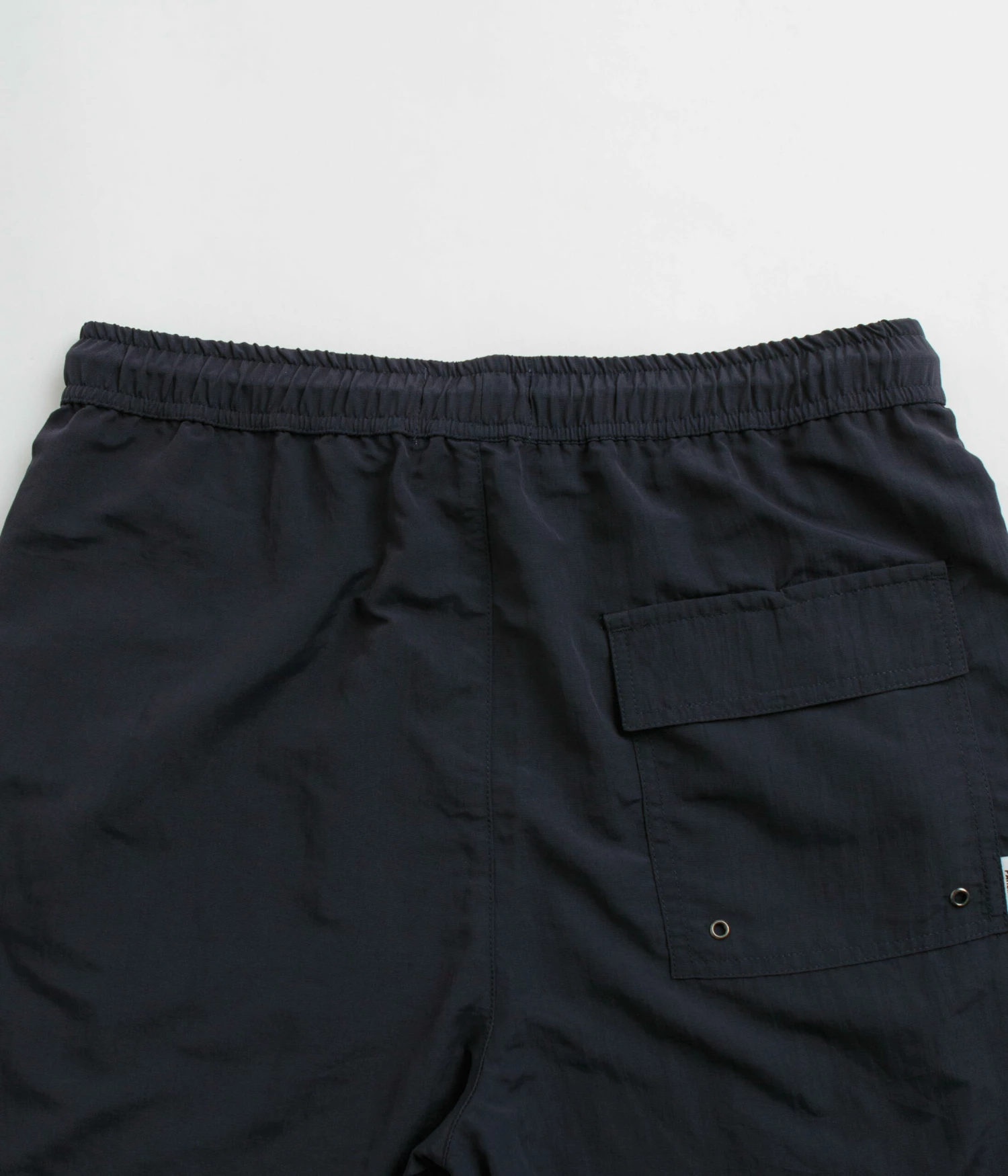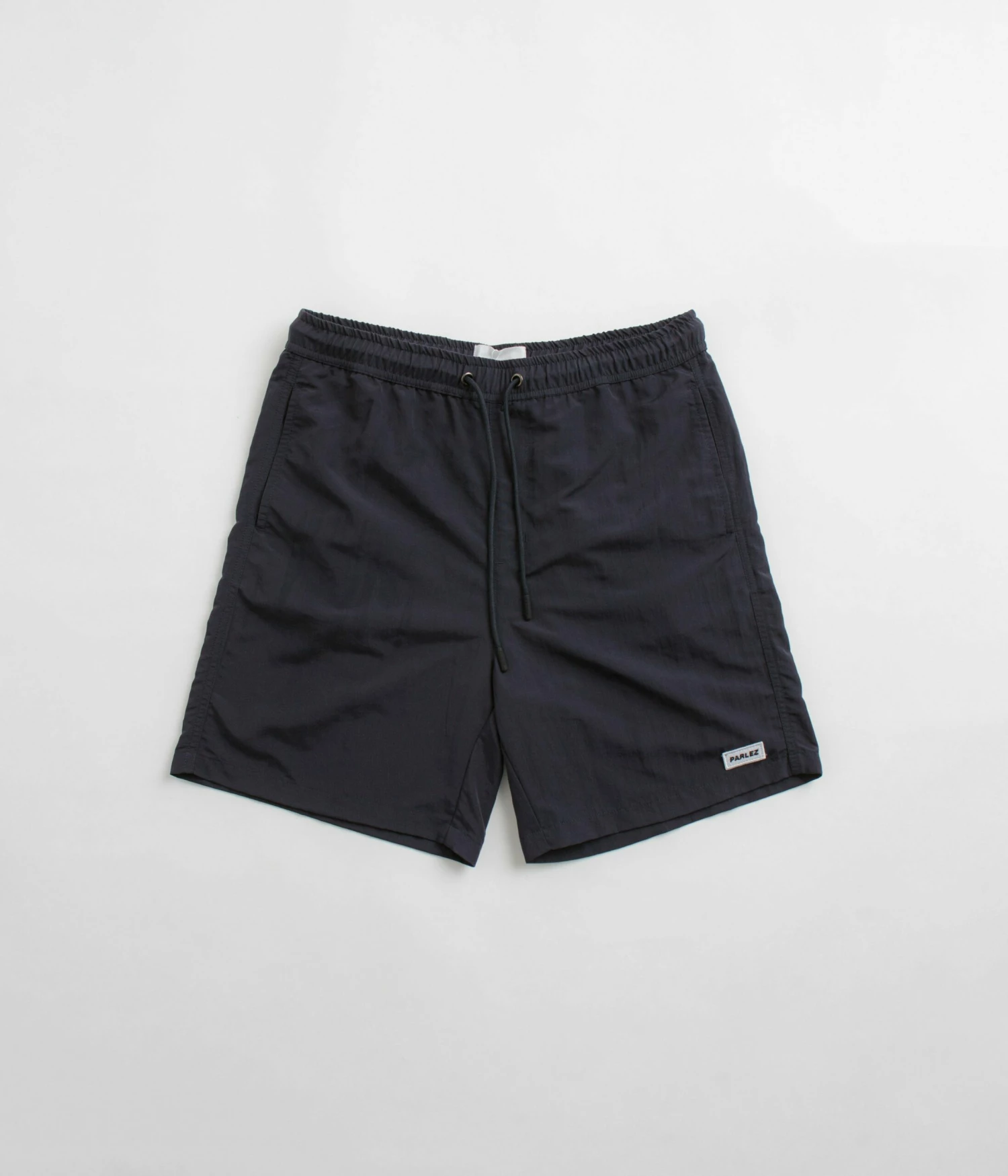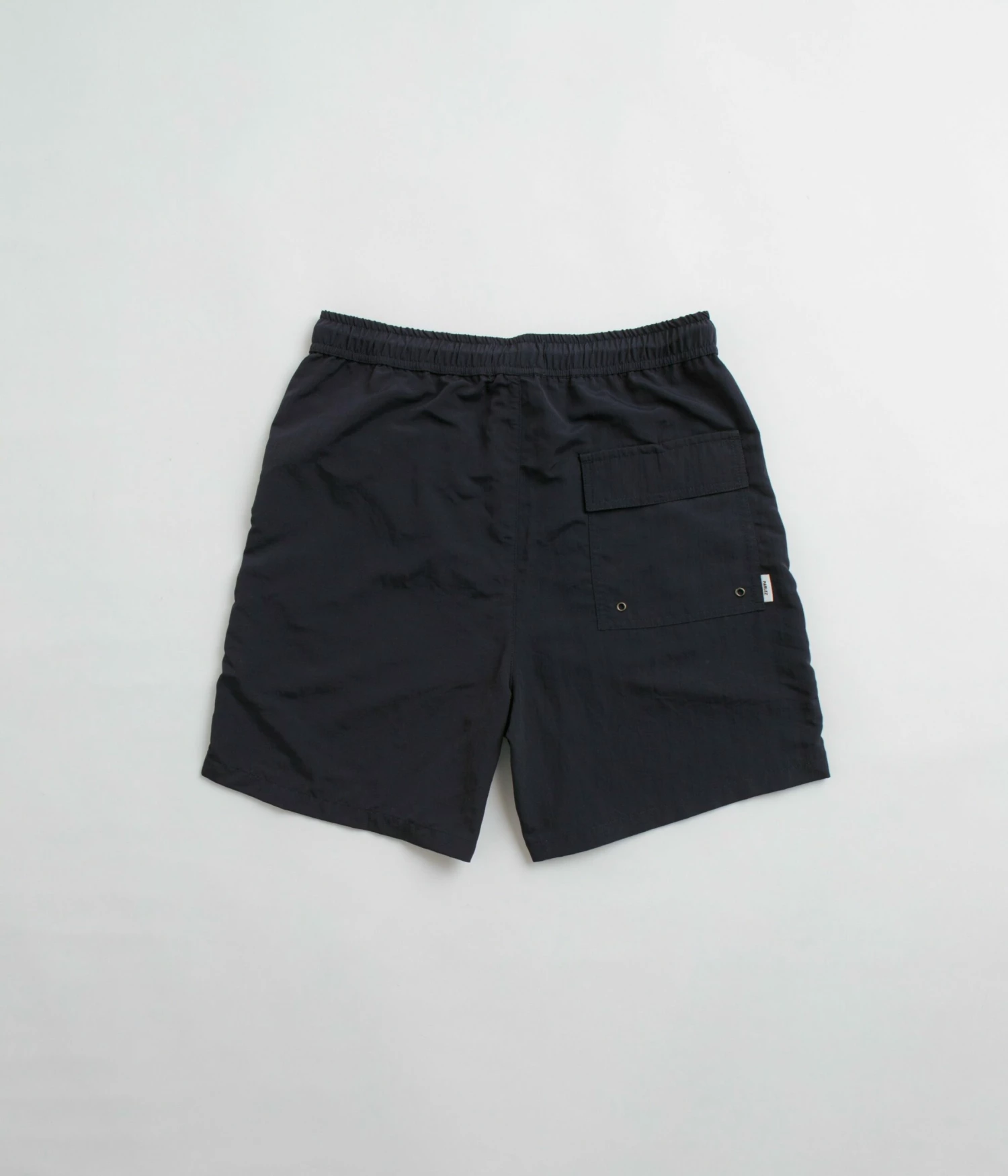 Parlez Rival Swim Shorts in Navy. A colour block staple from the brand’s latest collection, these quick drying Parlez swim shorts are tailored to a relaxed fitting from 100% recycled nylon. Cut to an above-knee fit with a woven elastic waist, these navy coloured shorts also feature drawcord fastenings and a breathable mesh lined interior. Finished with two side pockets with a key loop attachment and with an embroidered ‘Parlez’ brand patch above the left cuff.