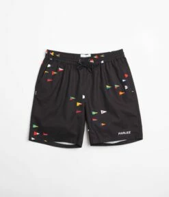 Parlez Topaz Shorts in Navy. Made from 100% cotton with an all-over nautical flag print, these above-knee Parlez shorts arrive as part of the brand’s latest collection. Featuring a woven elastic waistband, an adjustable drawstring tie and tonal stitched seams, these navy Parlez shorts are finished with two side pockets and with embroidered Parlez branding sewn above the left cuff.