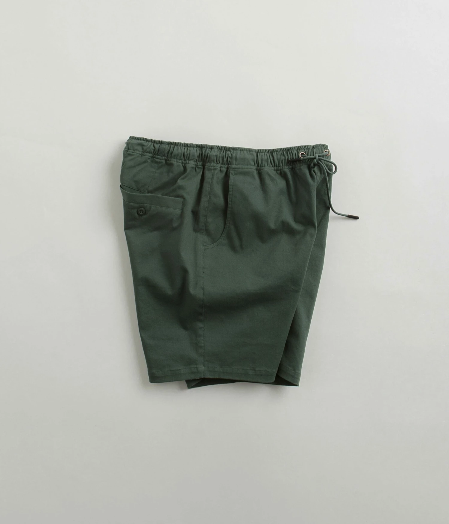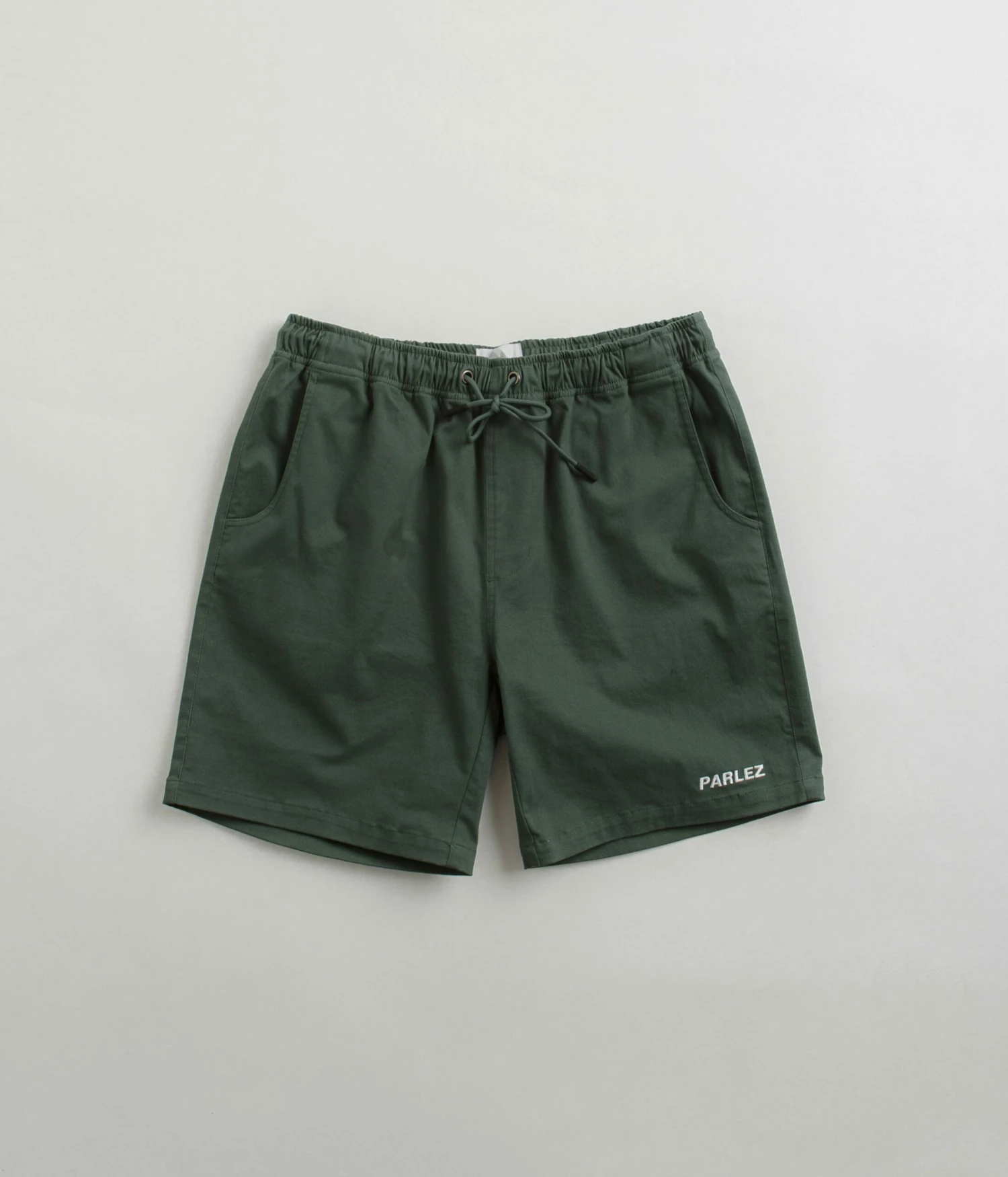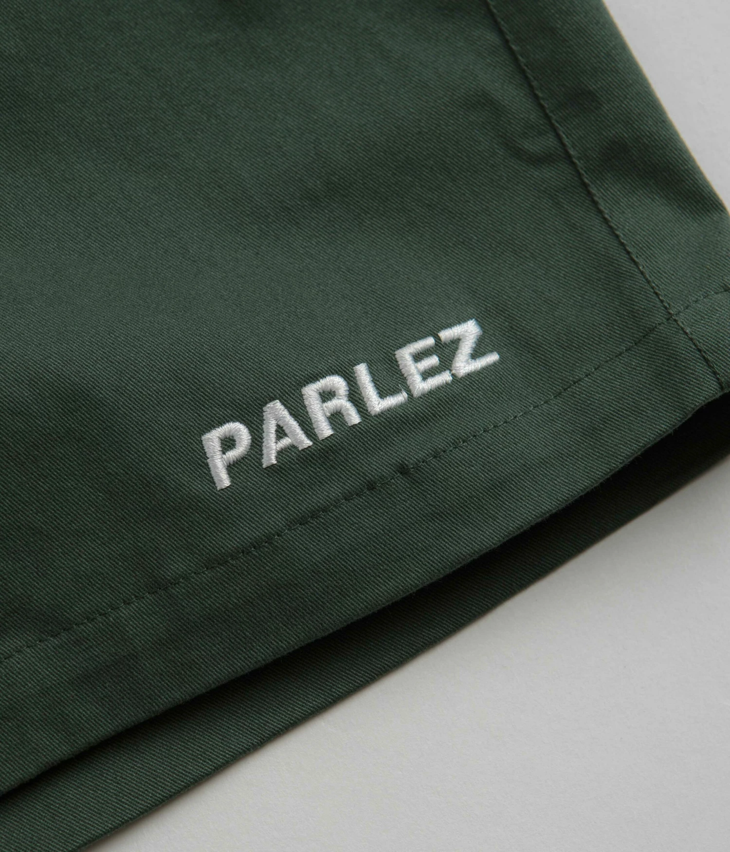 Parlez Vandra Shorts in Deep Teal. Regular fitting with an elasticated waistband, these Parlez shorts are made from a cotton-spandex blend. Featuring a woven elastic waistband with branded metal aglets, these teal green Parlez shorts are finished with two front pockets, a rear pocket and embroidered logo branding.