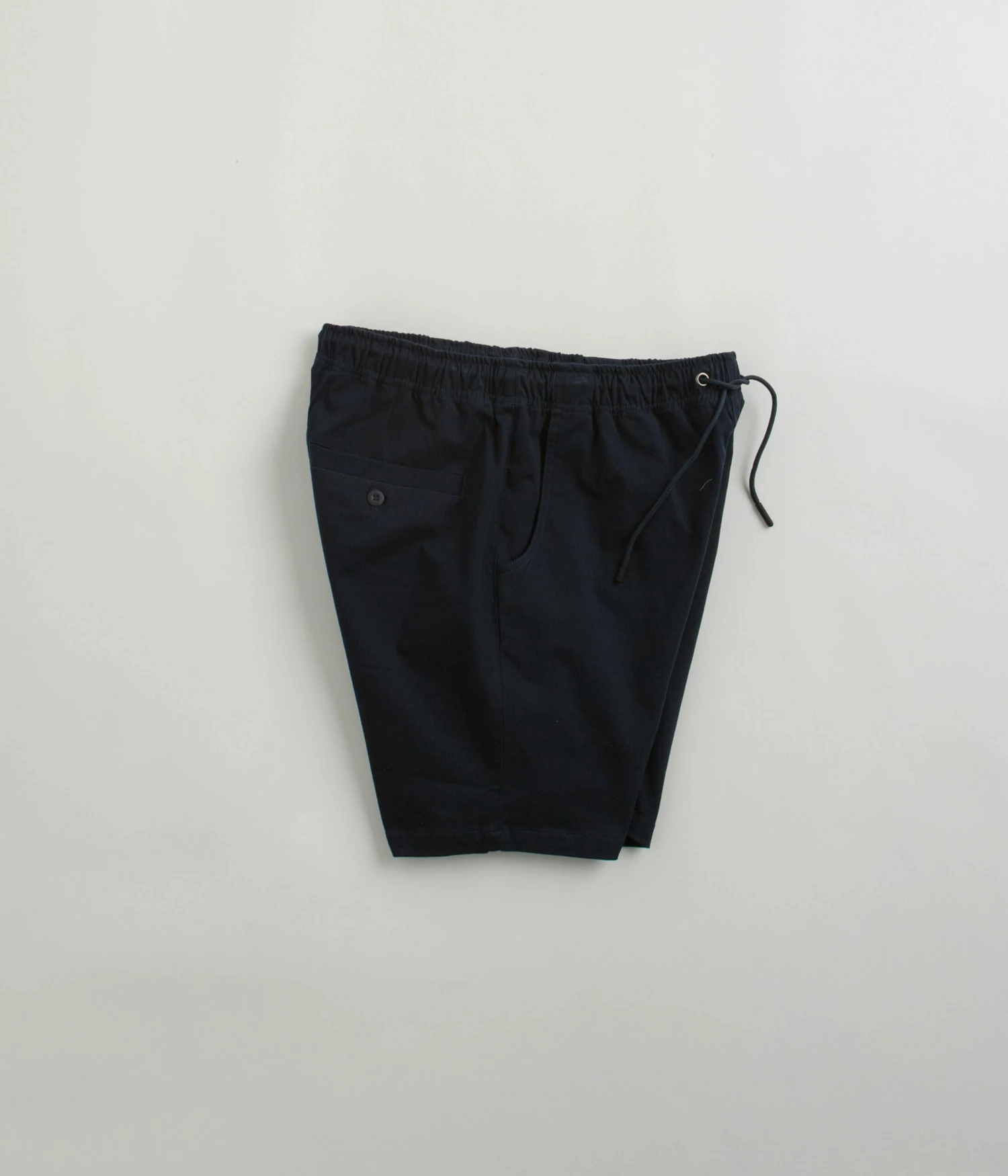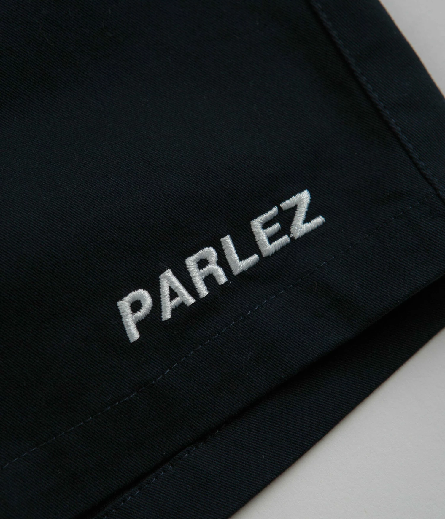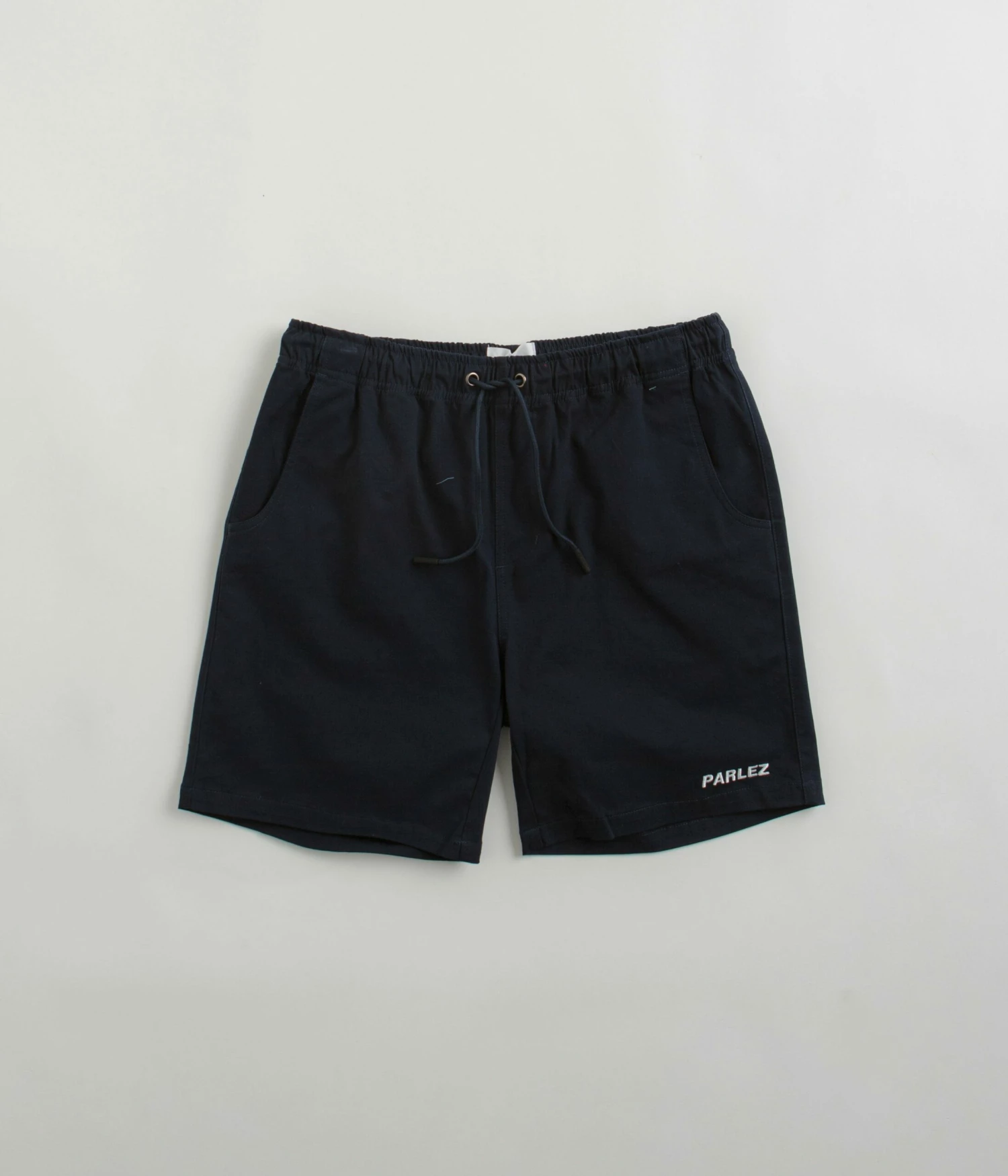 Parlez Vandra Shorts in Navy and Black. Made from a cotton-elastane blend with metal lace aglets, these above-knee Parlez shorts are tailored to a regular fitting. Featuring an elasticated waist and tonal stitched seams, these navy Parlez shorts are finished with two side pockets, a single rear pocket and with embroidered logo branding.