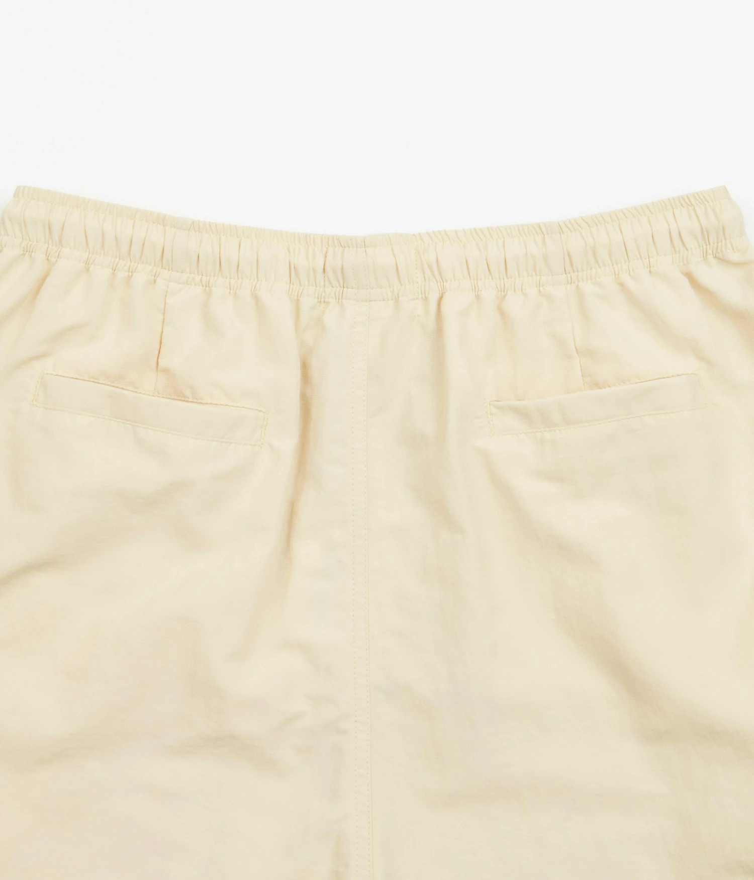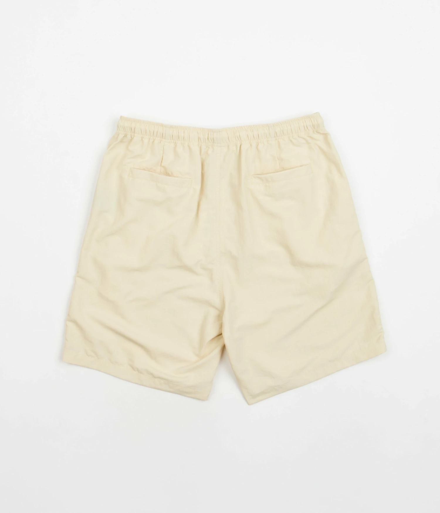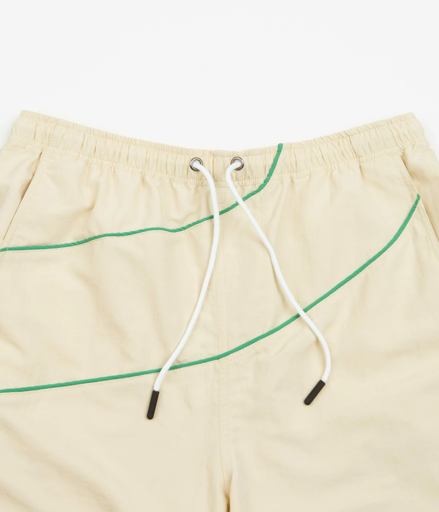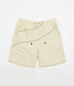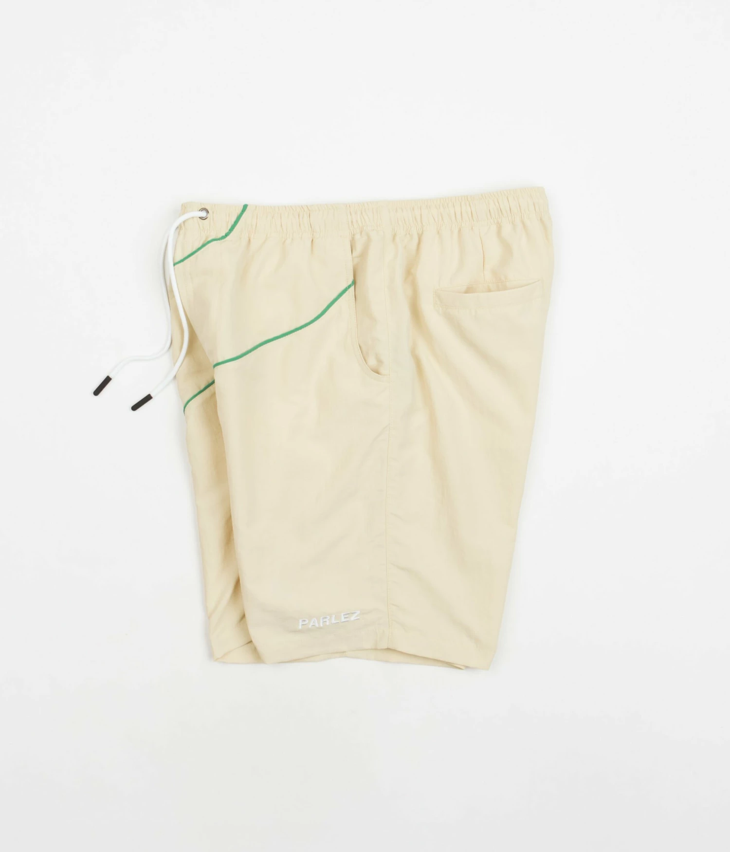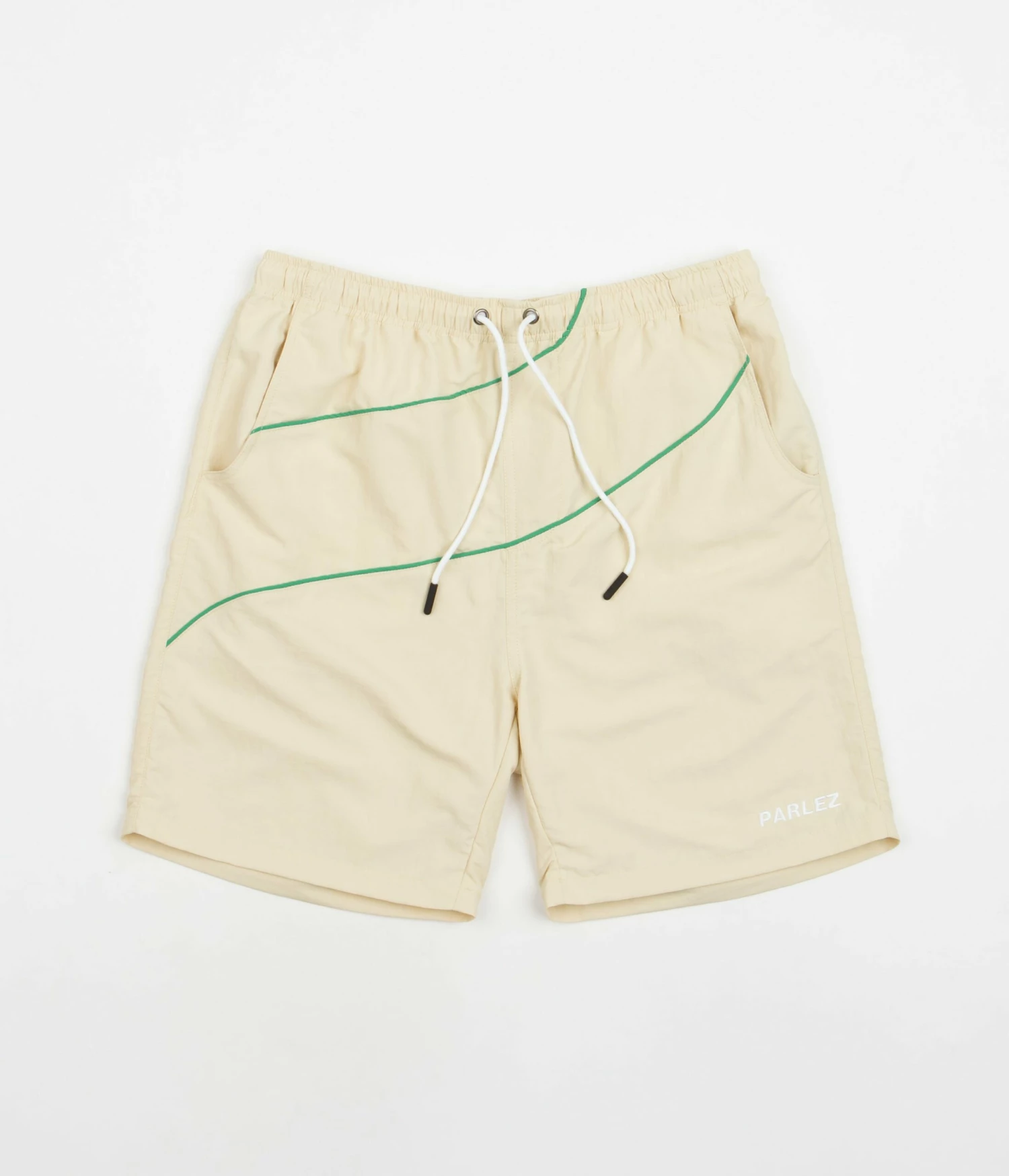 Parlez Venice Shorts in Ecru. Made from 100% recycled nylon and tailored to a regular fitting, these above-knee Parlez shorts are styled with a drawstring waist and a polyester mesh lining. Featuring contrast piping, these ecru Parlez shorts are fully water-resistant and are finished with embroidered ‘Parlez’ branding sewn above the left cuff.