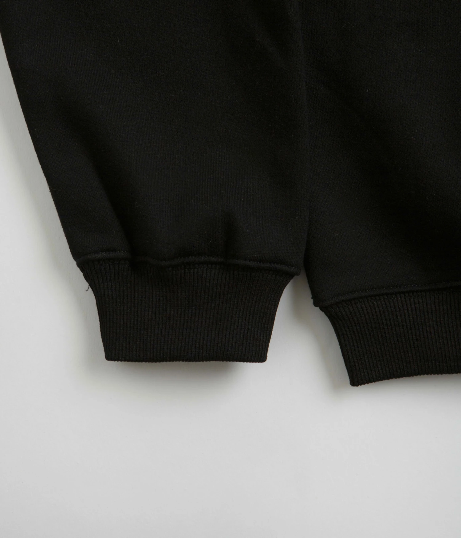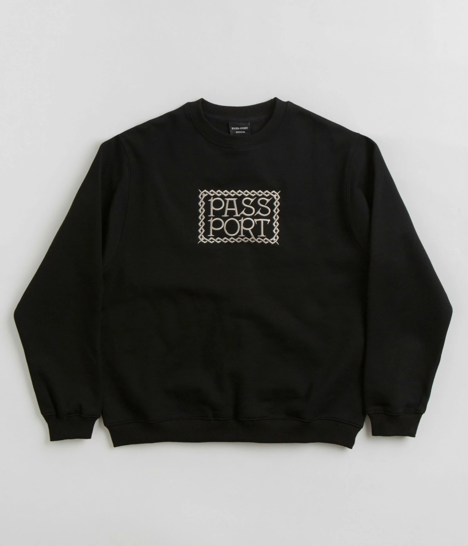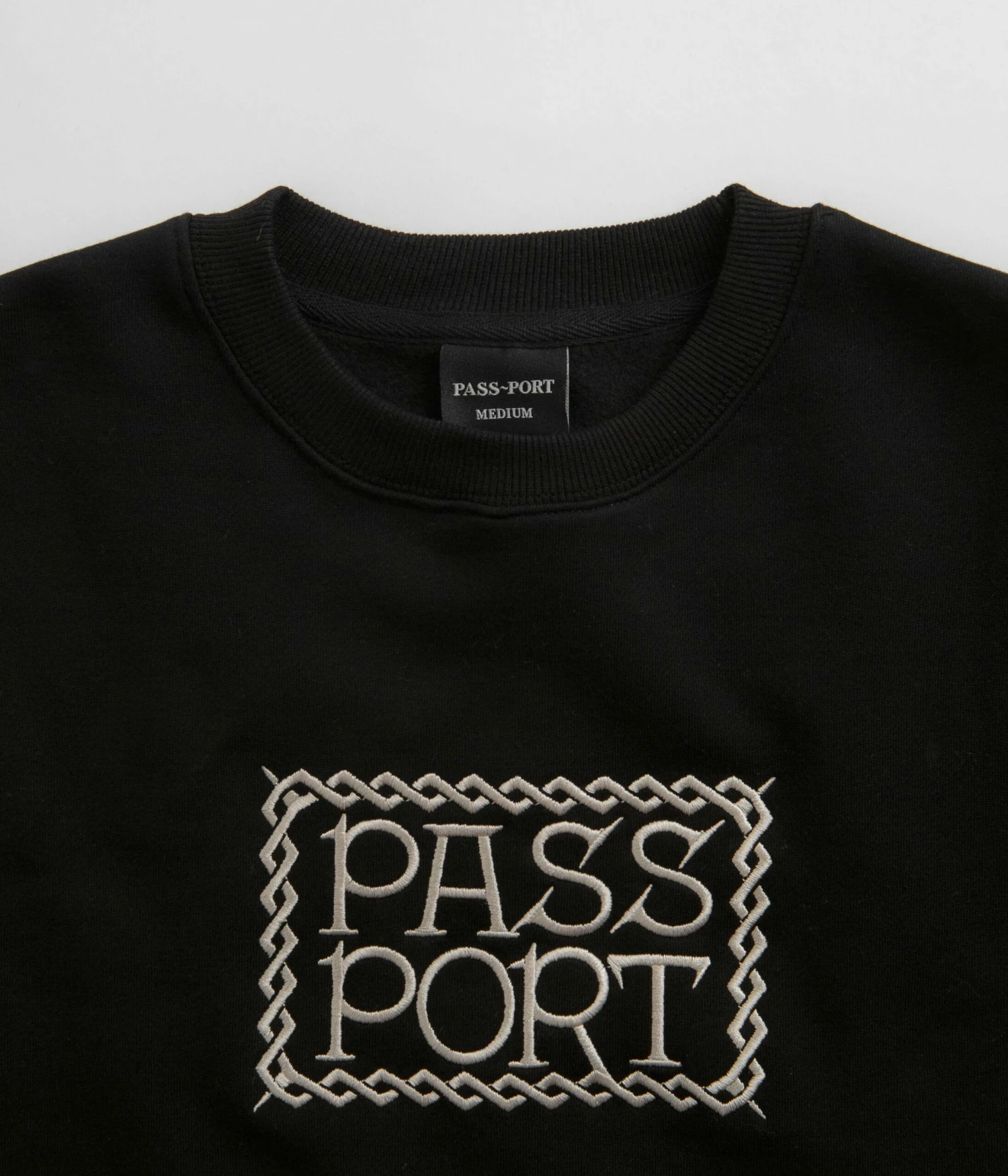 Pass Port Invasive Embroidered Crewneck Sweatshirt in Black. Made from a polyester-cotton blend, this block tone Pass Port sweatshirt is tailored to a regular fitting. Featuring a flexible rib knit collar, ribbed cuffs and a woven elastic hem, this black Pass Port sweater is finished with an embroidered centre chest logo.