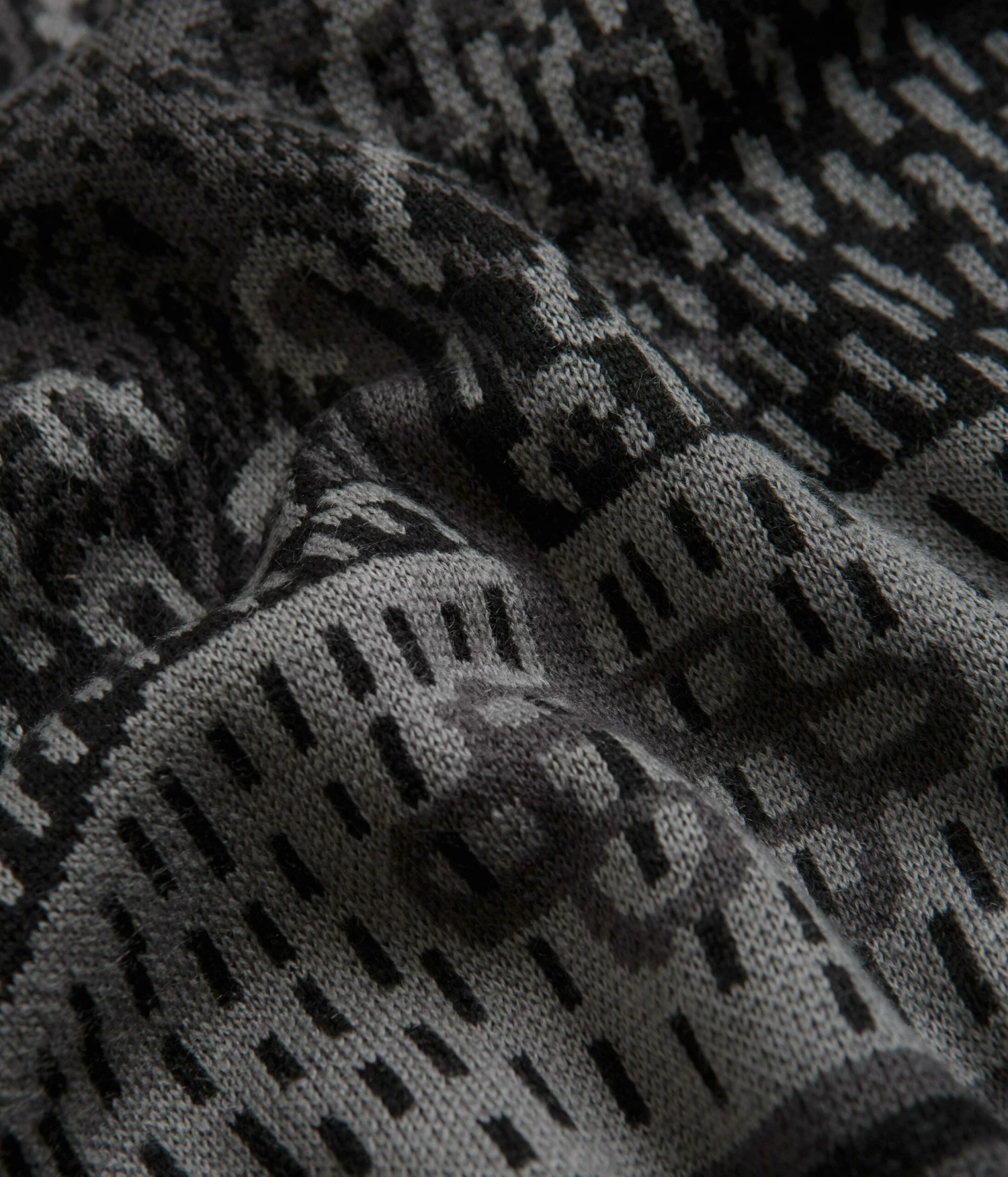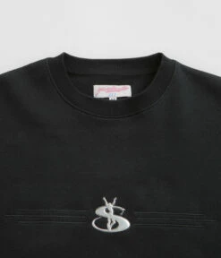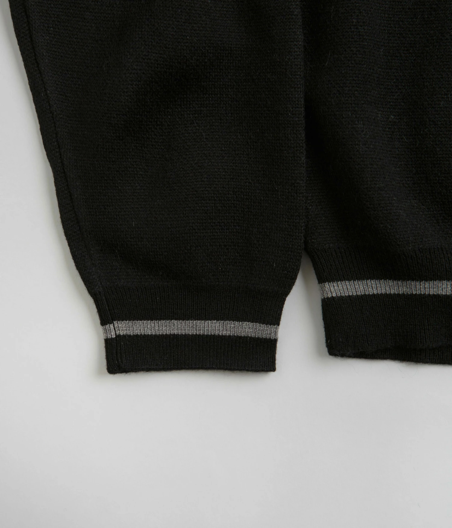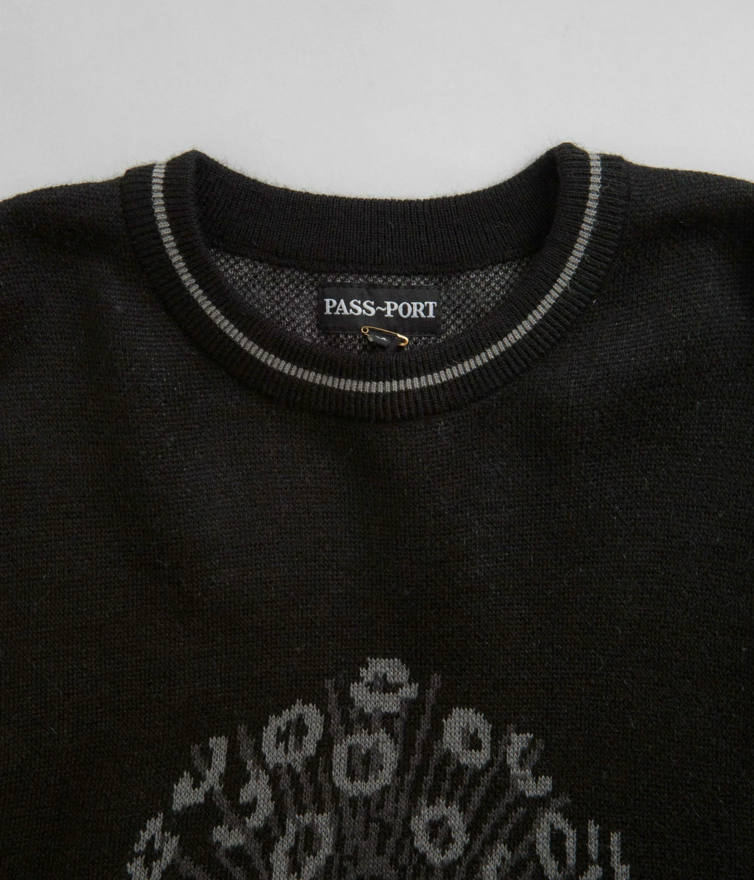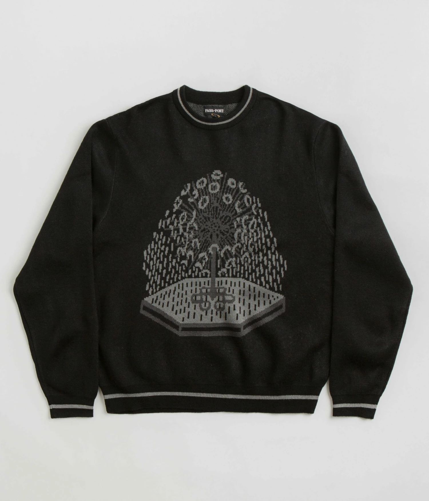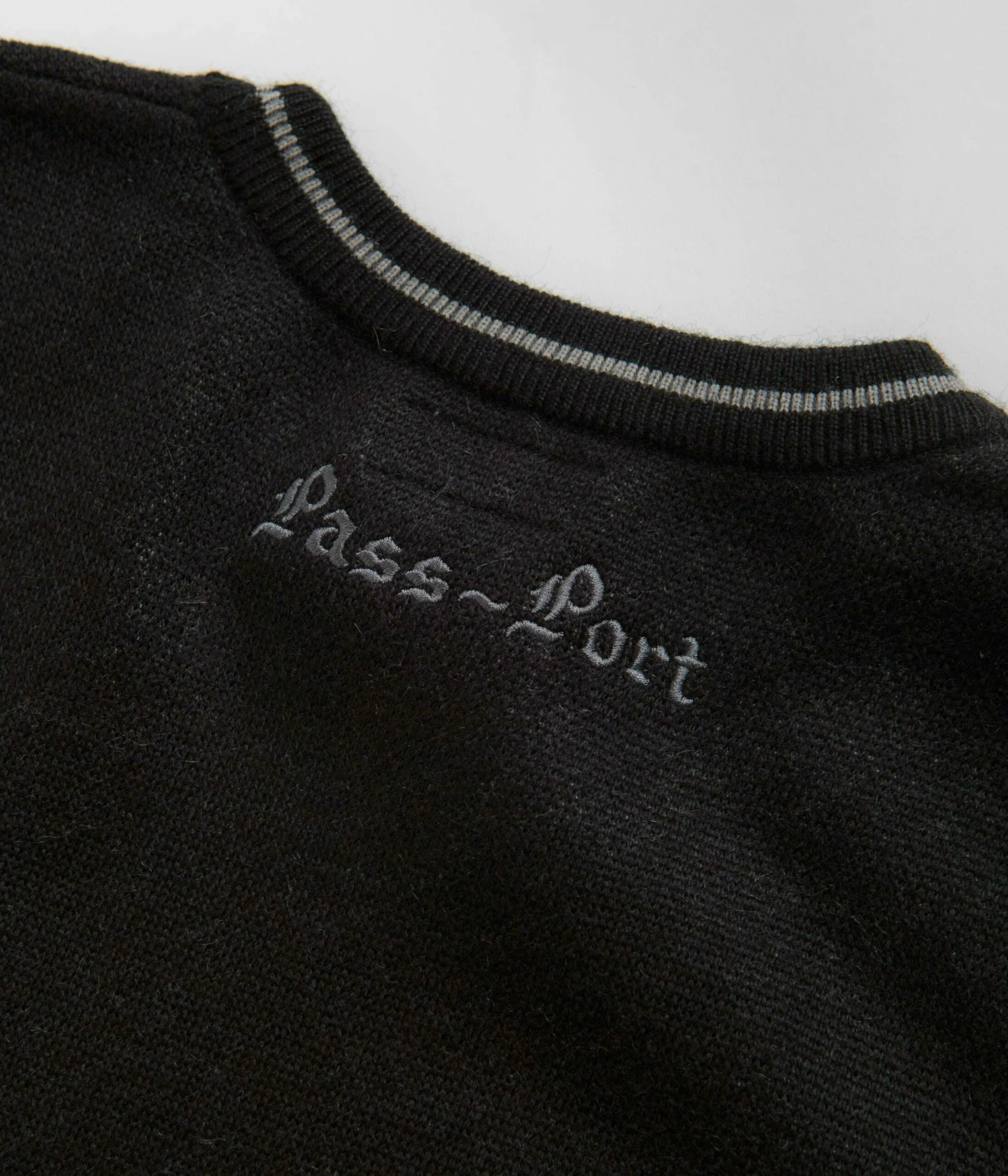 Pass Port Kings X Fountain Mohair Knitted Sweatshirt in Black. Inspired by Sydney’s El Alamein Memorial Fountain, this regular fitting Pass Port sweatshirt is made from 100% mohair with a jacquard striped crew collar and rib knit cuffs. Tailored to a regular fitting, this black Pass Port sweater is finished in a shade of black with a jacquard chest graphic and with embroidered rear neckline branding.