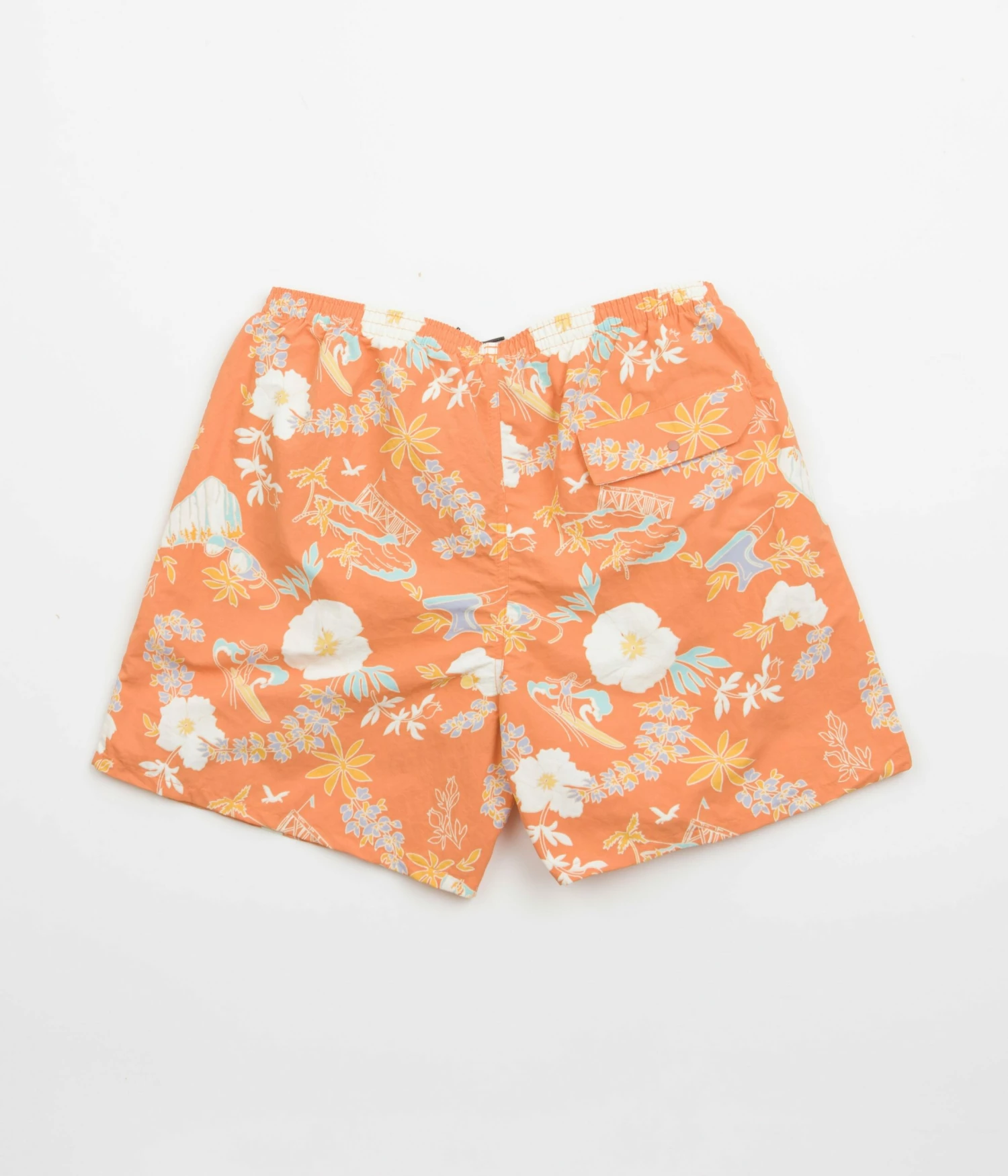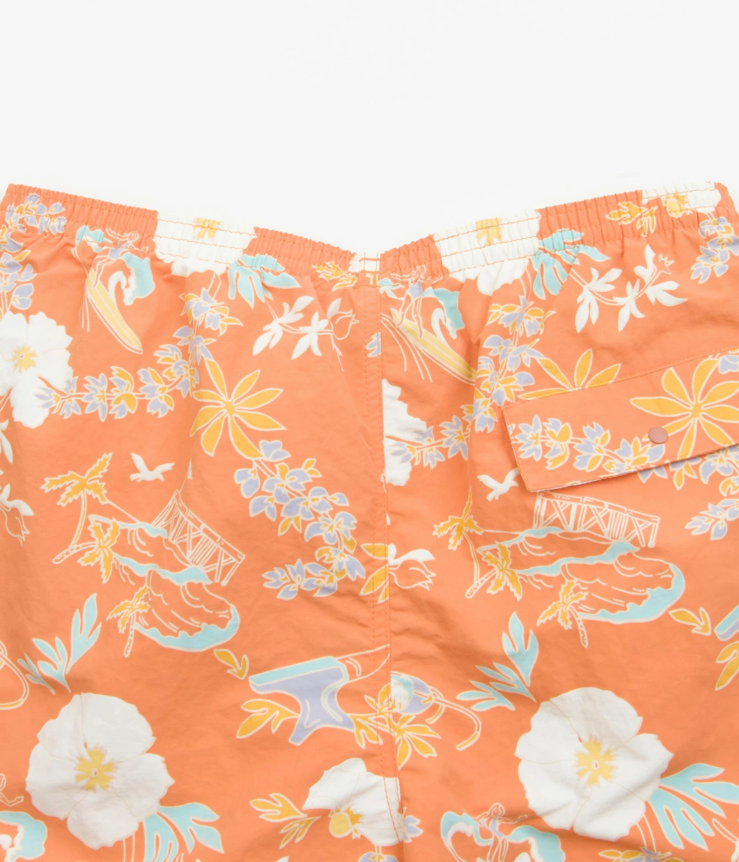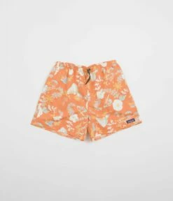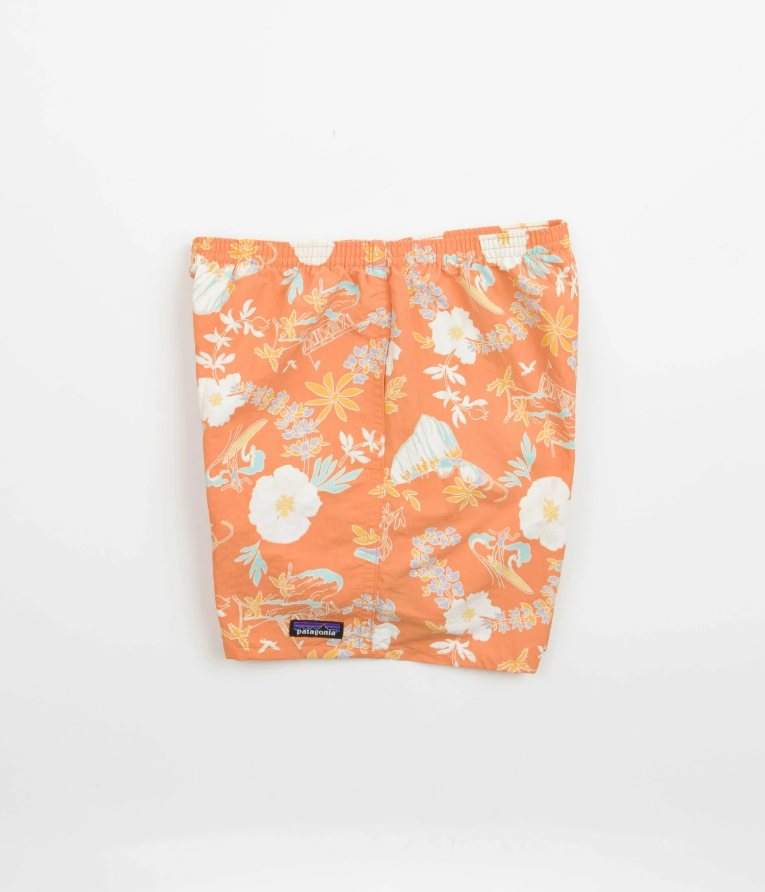 Patagonia Baggies 5″ Shorts in Climb Hike Surf: Tigerlily Orange. Fair Trade Certified sewn from NetPlus® 100% post consumer recycled nylon faille, these above-knee Patagonia shorts are tailored to a regular fitting with a 5” inseam. Featuring an elasticated waistband, a quick drying internal mesh lining and an adjustable drawstring, these orange Patagonia baggies shorts are finished with two vertical side pockets, a rear patch pocket and with an embroidered P-6 flag label sewn above the left leg hem.