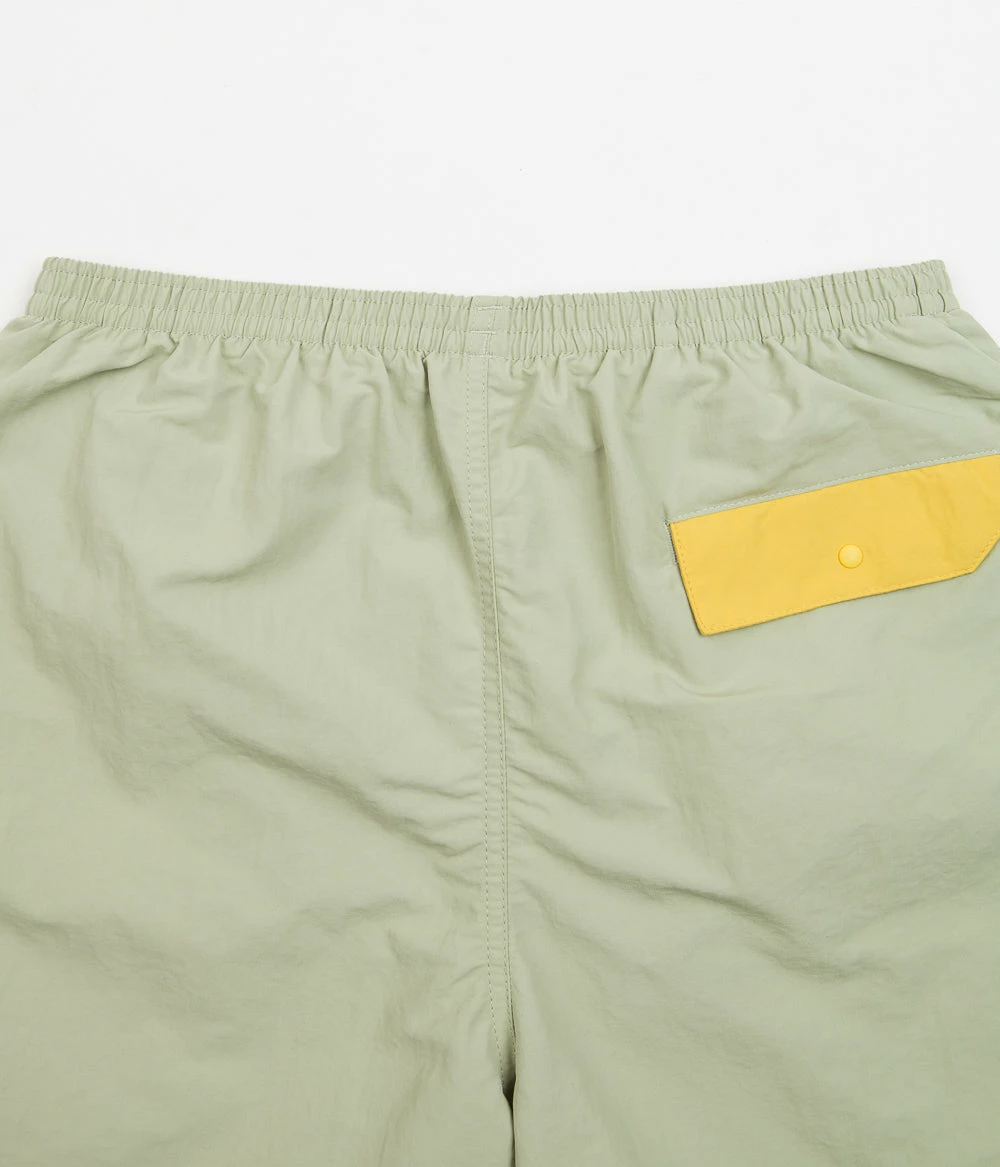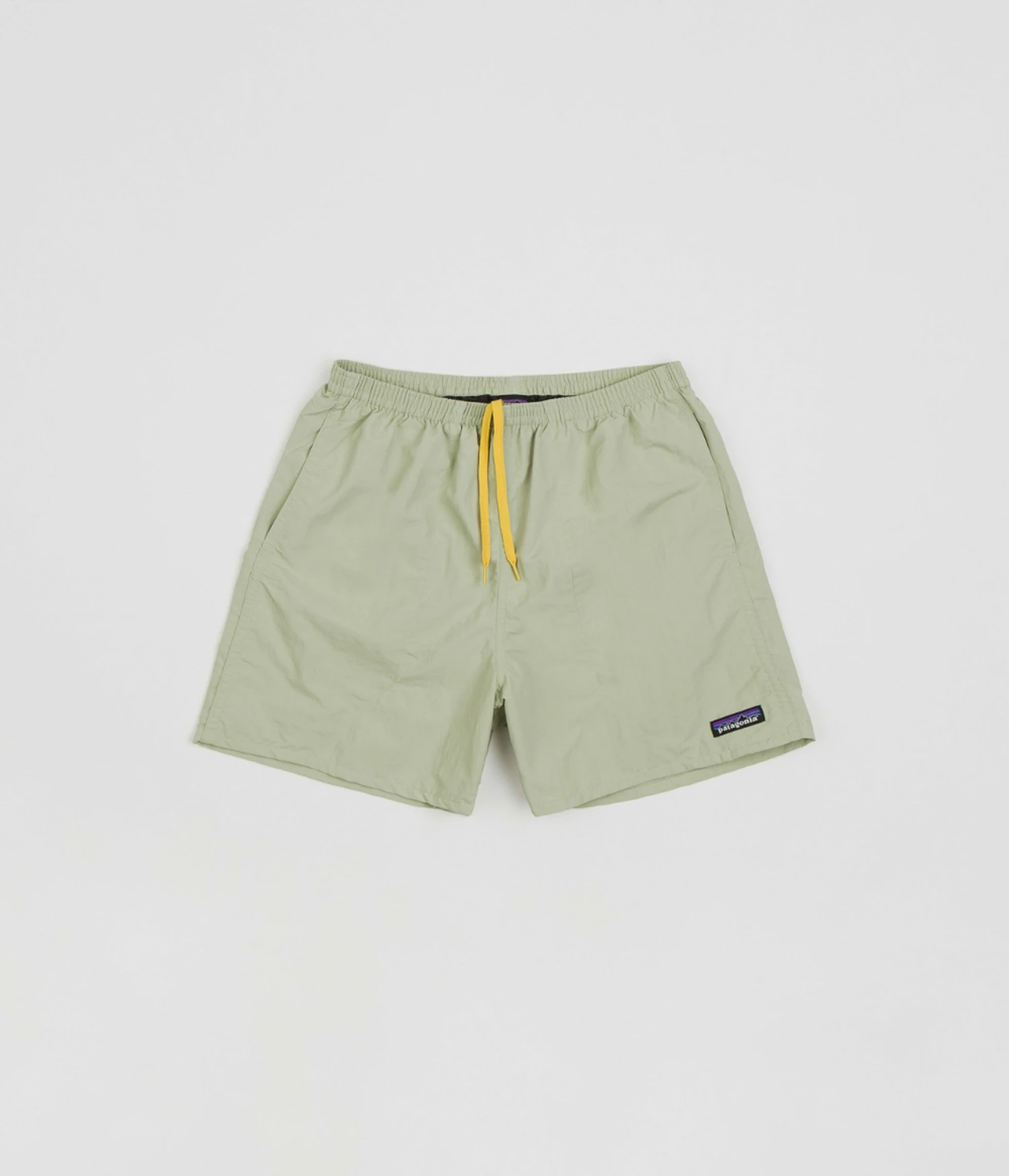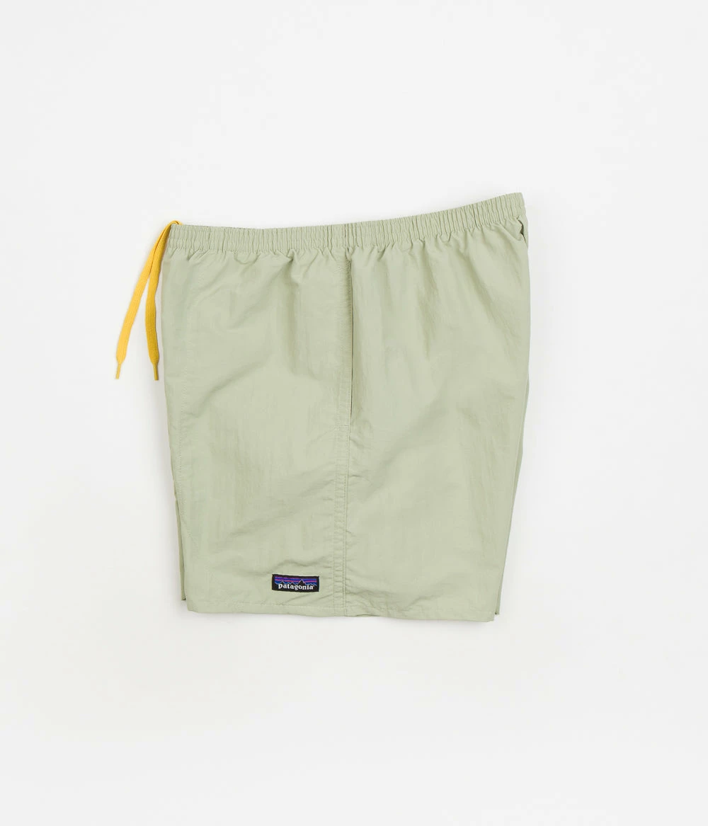 Patagonia Baggies 5″ Shorts in Salvia Green. Seen here in a classic colourway, these above-knee Patagonia shorts are tailored to a relaxed fitting from 100% recycled nylon. Featuring a DWR coated exterior and a polyester mesh lining, these olive green Patagonia shorts also feature a woven elasticated waistband and an inner drawstring adjuster. Finished with two side pockets, a single rear pocket and with an embroidered P-6 flag label sewn above the left cuff.