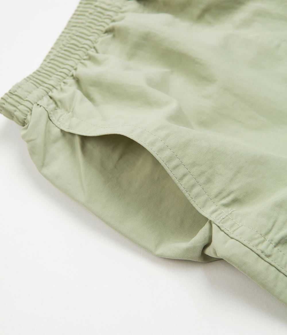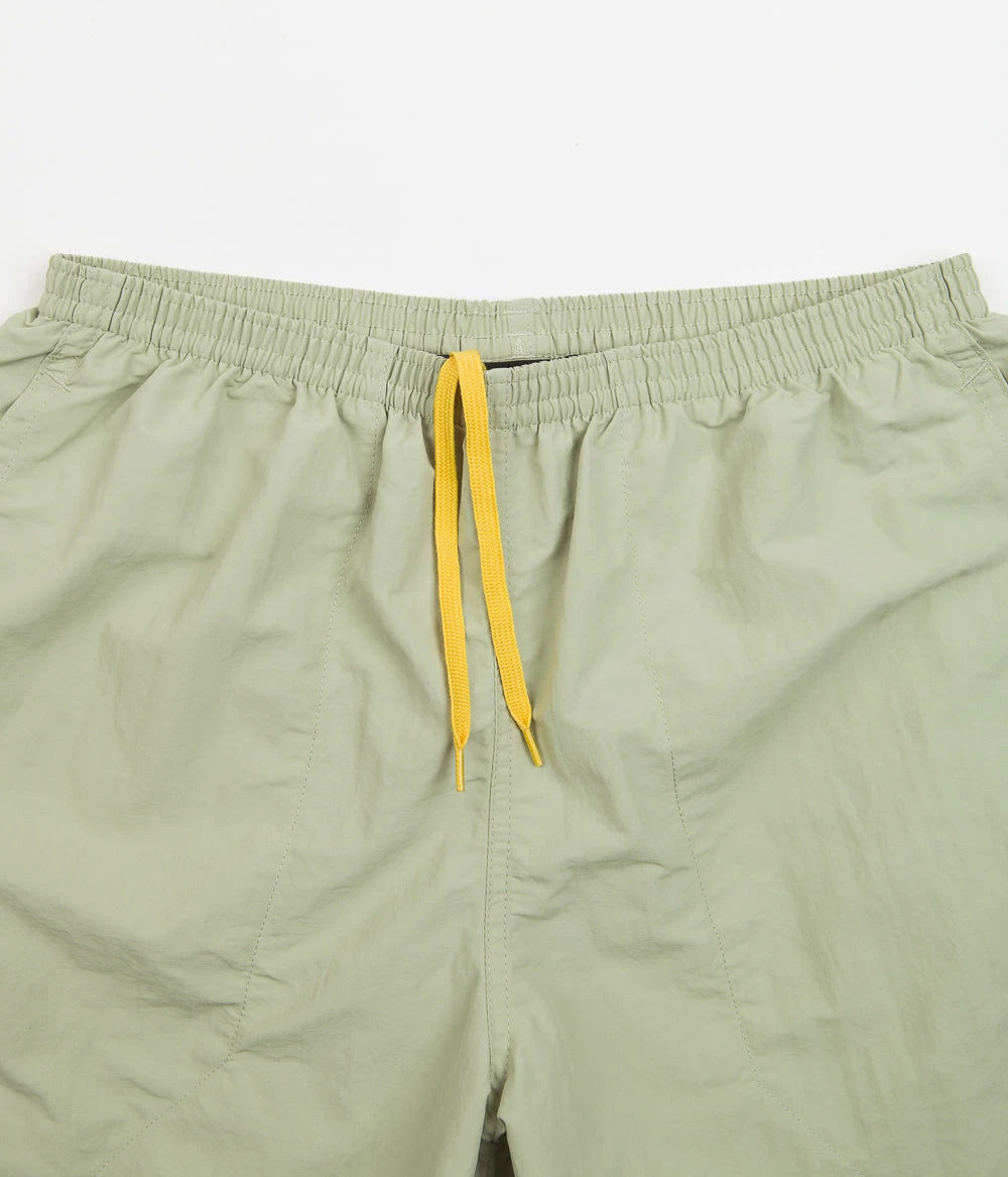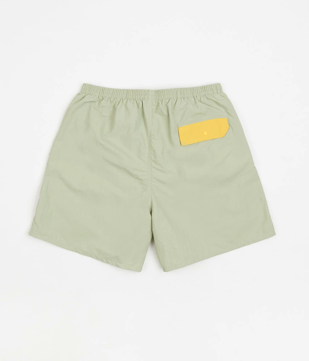 Patagonia Baggies 5″ Shorts in Salvia Green. Seen here in a classic colourway, these above-knee Patagonia shorts are tailored to a relaxed fitting from 100% recycled nylon. Featuring a DWR coated exterior and a polyester mesh lining, these olive green Patagonia shorts also feature a woven elasticated waistband and an inner drawstring adjuster. Finished with two side pockets, a single rear pocket and with an embroidered P-6 flag label sewn above the left cuff.