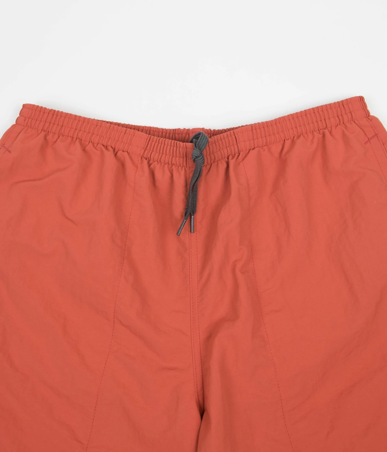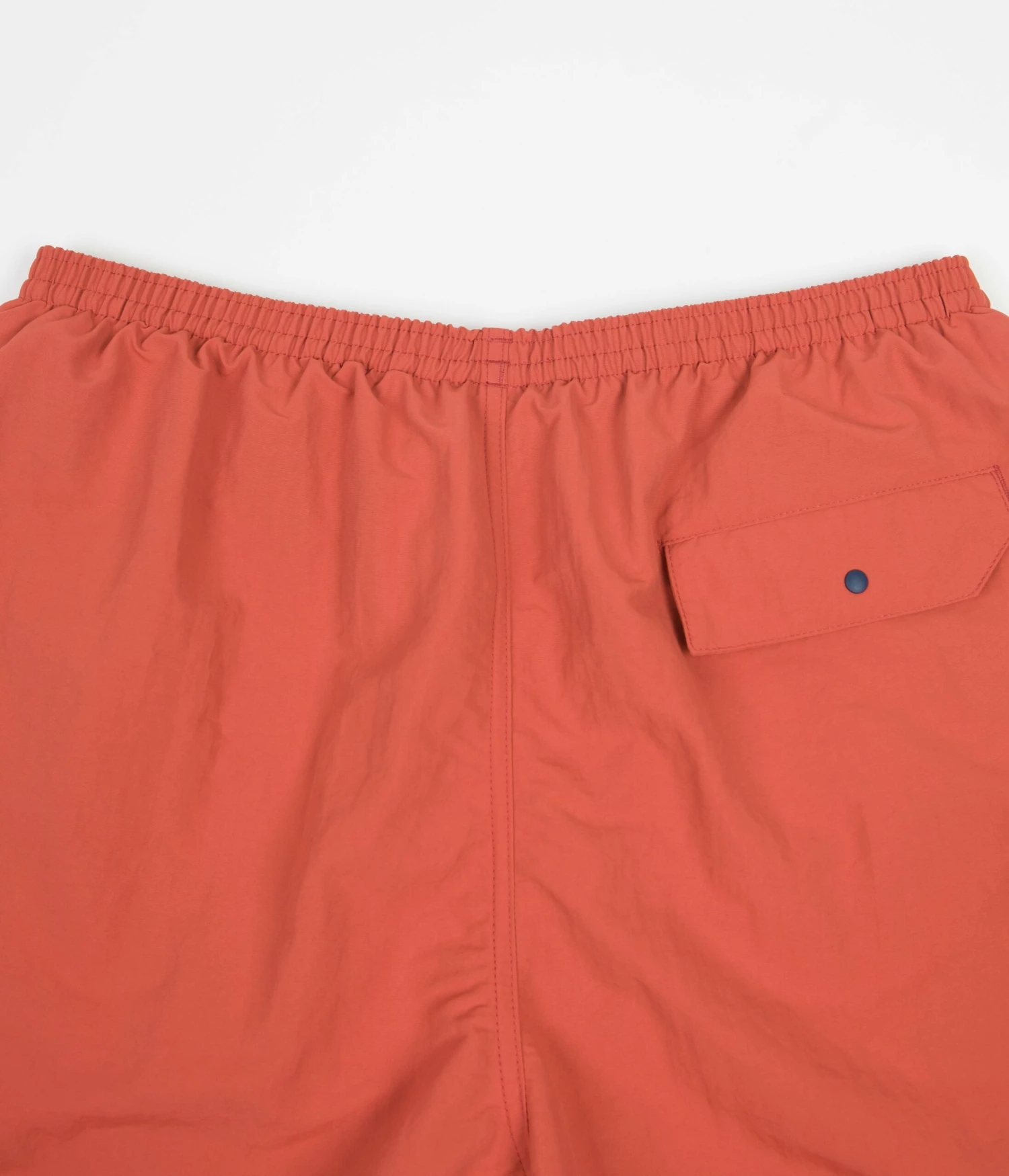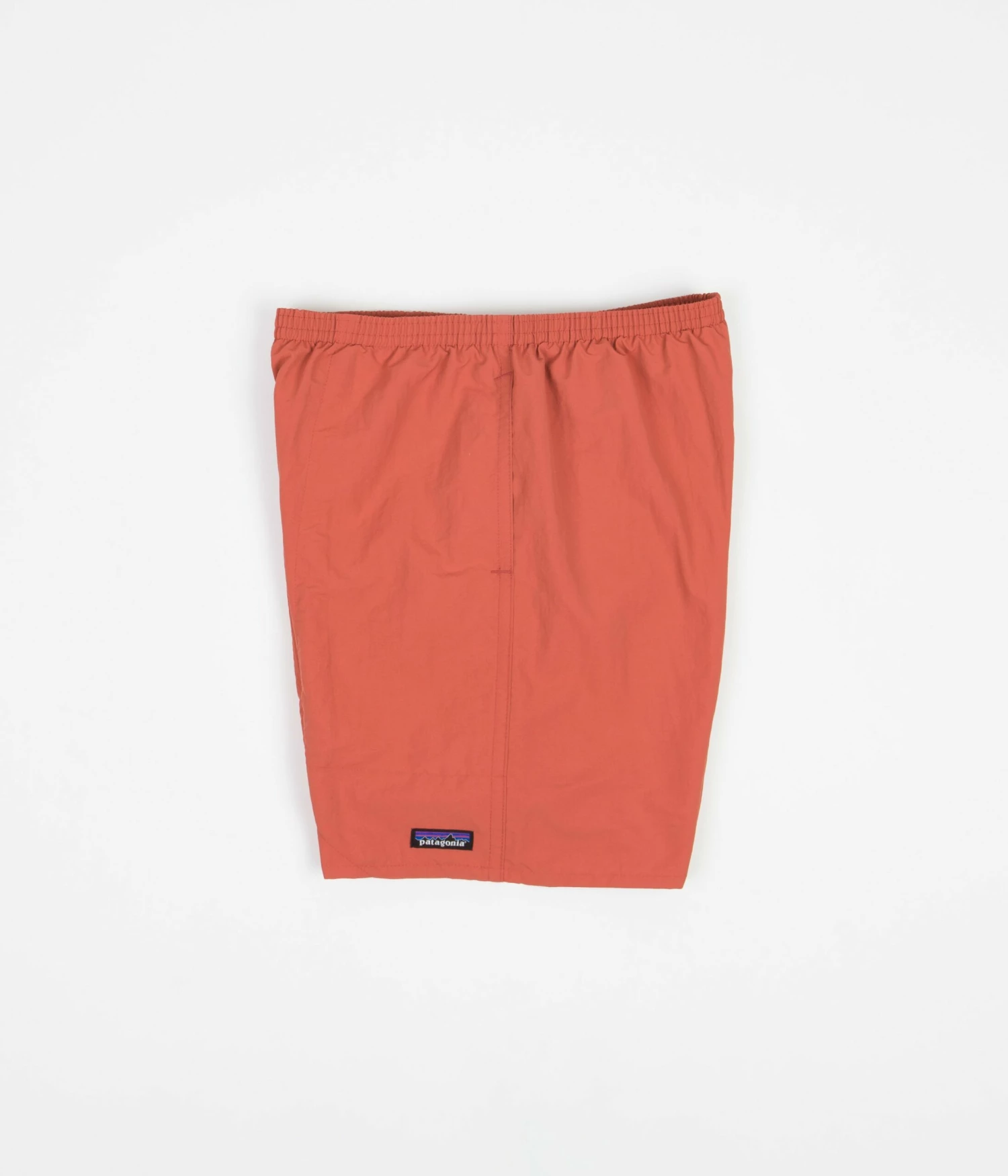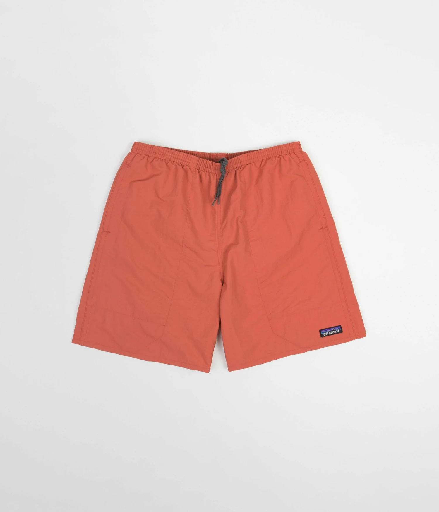 Patagonia Baggies Longs 7″ Shorts in Sumac Red. Fair Trade Certified sewn from NetPlus® 100% postconsumer recycled nylon faille with a DWR coated exterior, these above-knee Patagonia shorts are tailored to a relaxed fitting with a fast-drying finish. Featuring a woven elastic waistband, an internal drawstring adjuster and a breathable inner mesh lining, these Patagonia baggies shorts are finished with two drain-and-dry mesh pockets, a single snap secured rear pocket and with Patagonia’s iconic P-6 flag label woven above the left cuff.