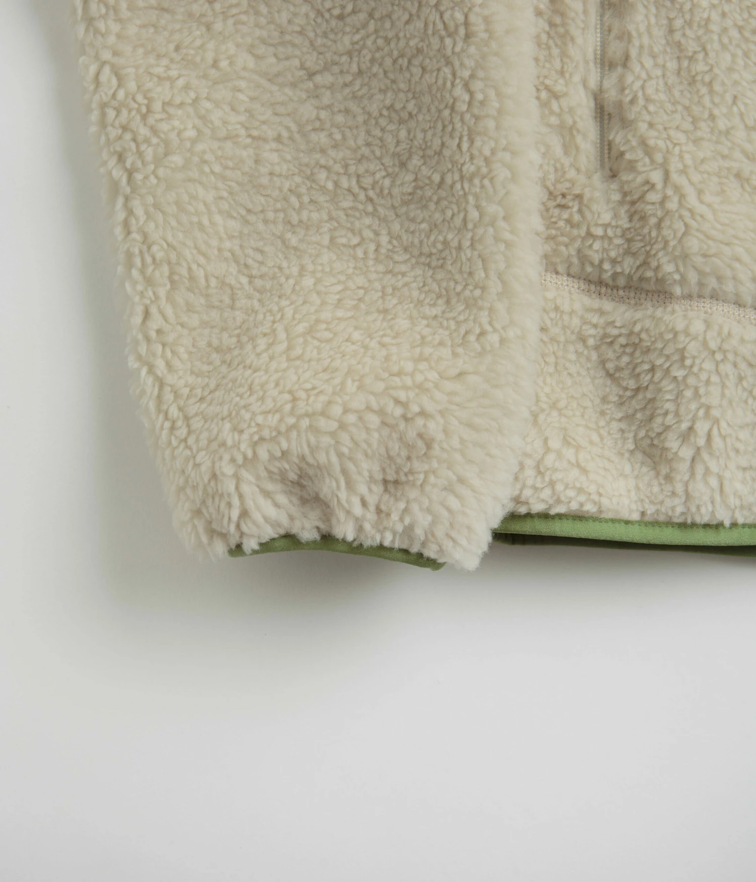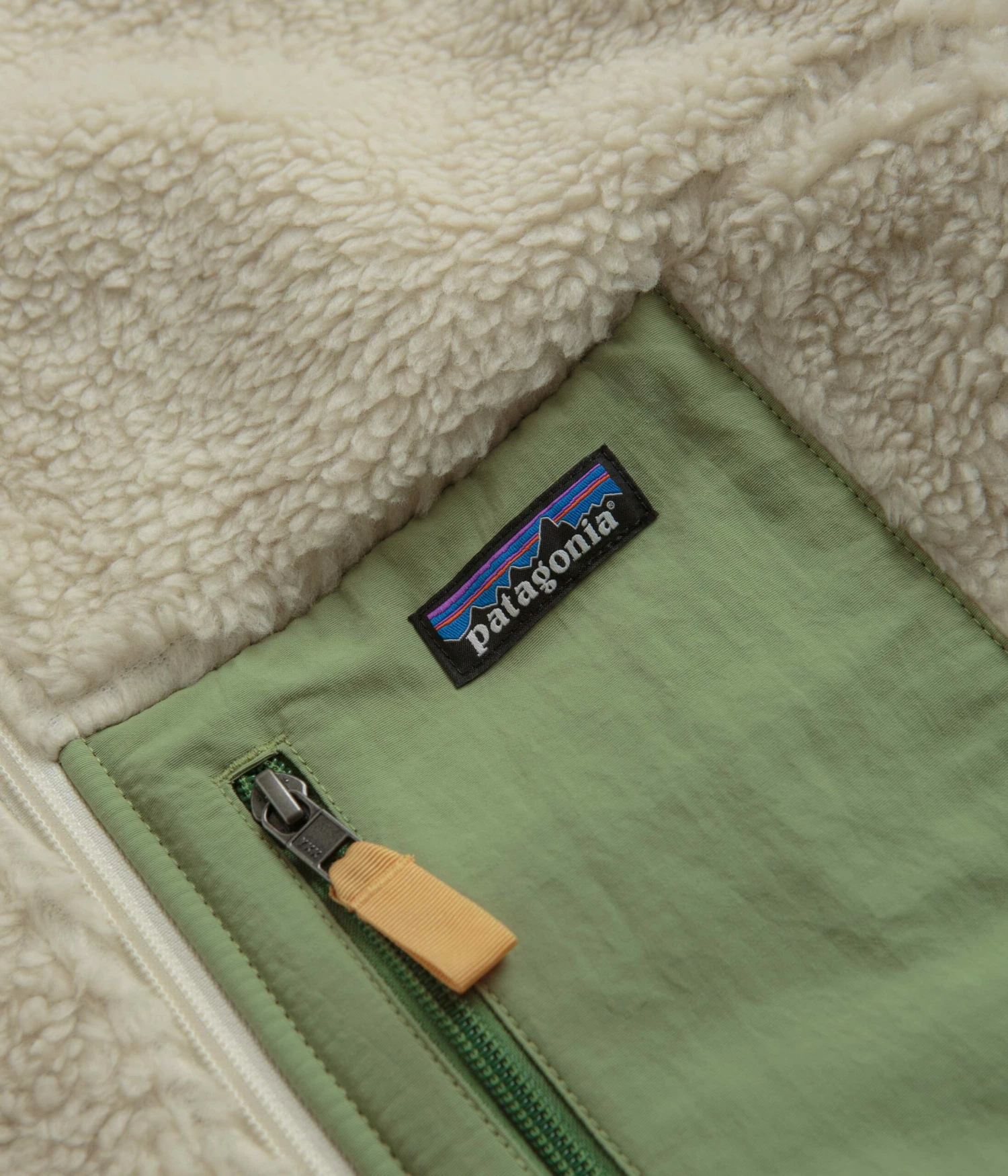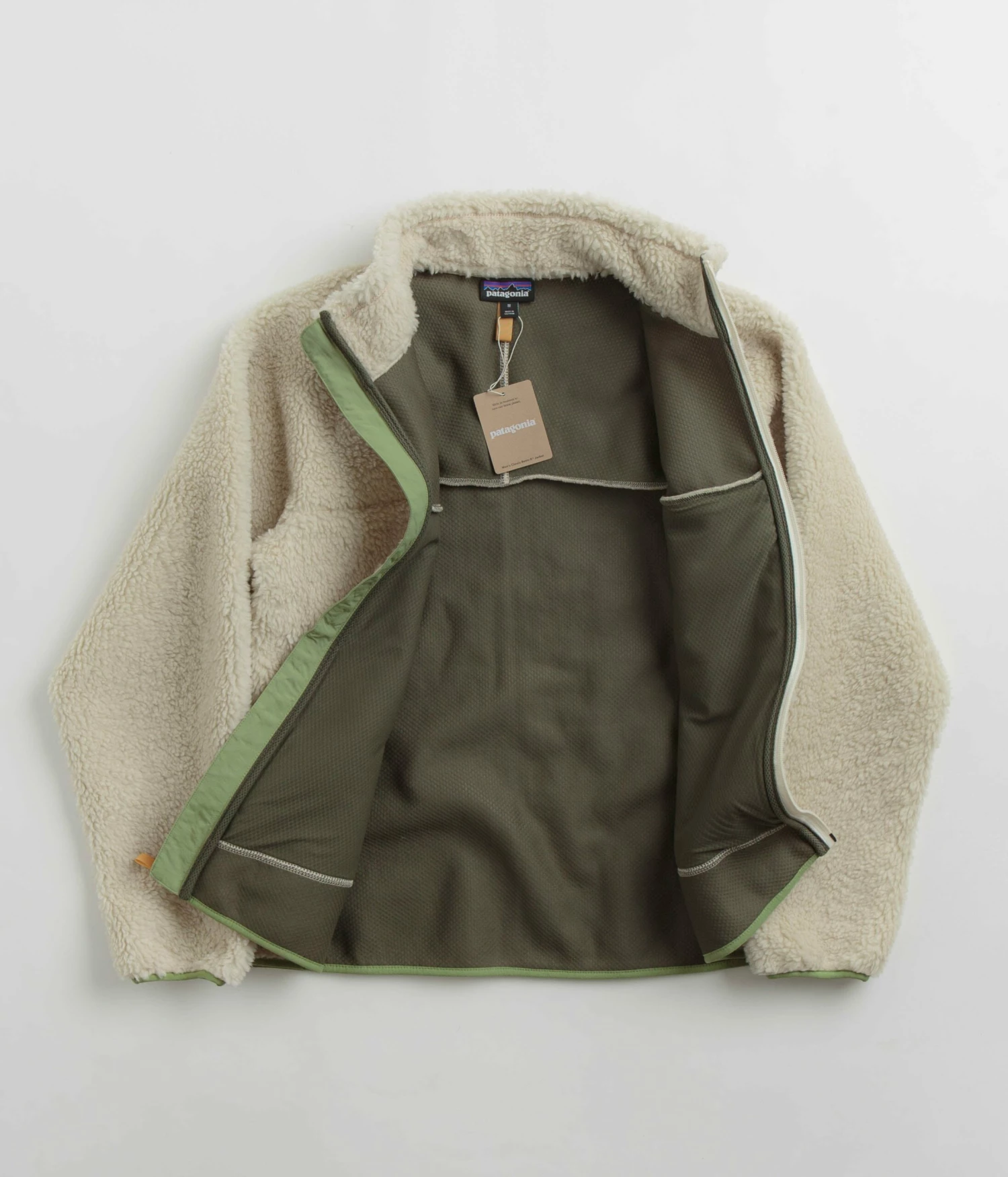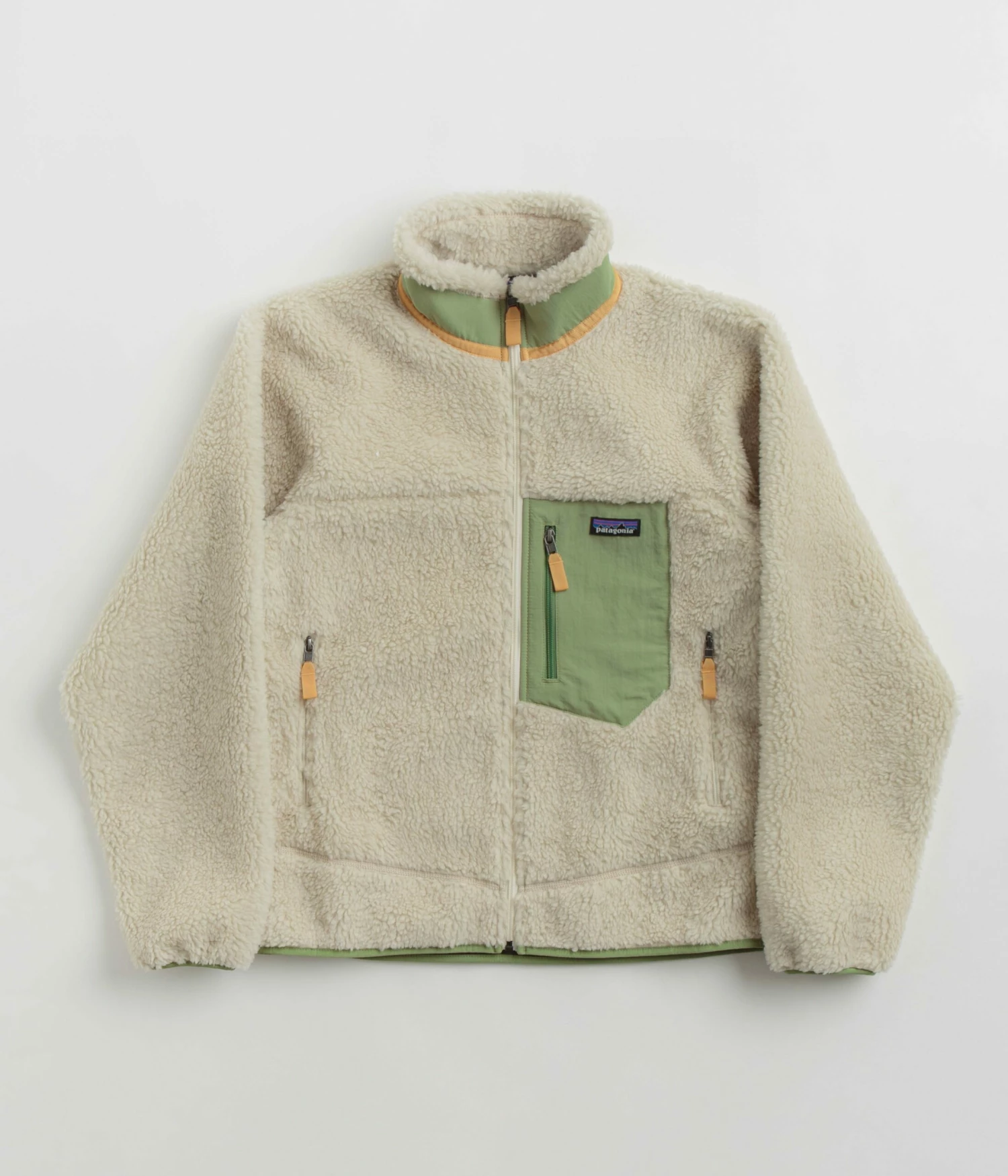 Patagonia Classic Retro-X Jacket in Dark Natural and Buckhorn Green. Regular fitting and made from 100% polyester bonded fleece, this Fair Trade Certified™ Patagonia jacket is designed with a DWR finish and an internal windproof membrane. Featuring a high-rise collar, a full length zipper fastening, Y-joint sleeves and elasticated cuffs, this dark khaki Patagonia jacket is finished with two waist pockets, a zippered chest pocket and with woven flag label branding.