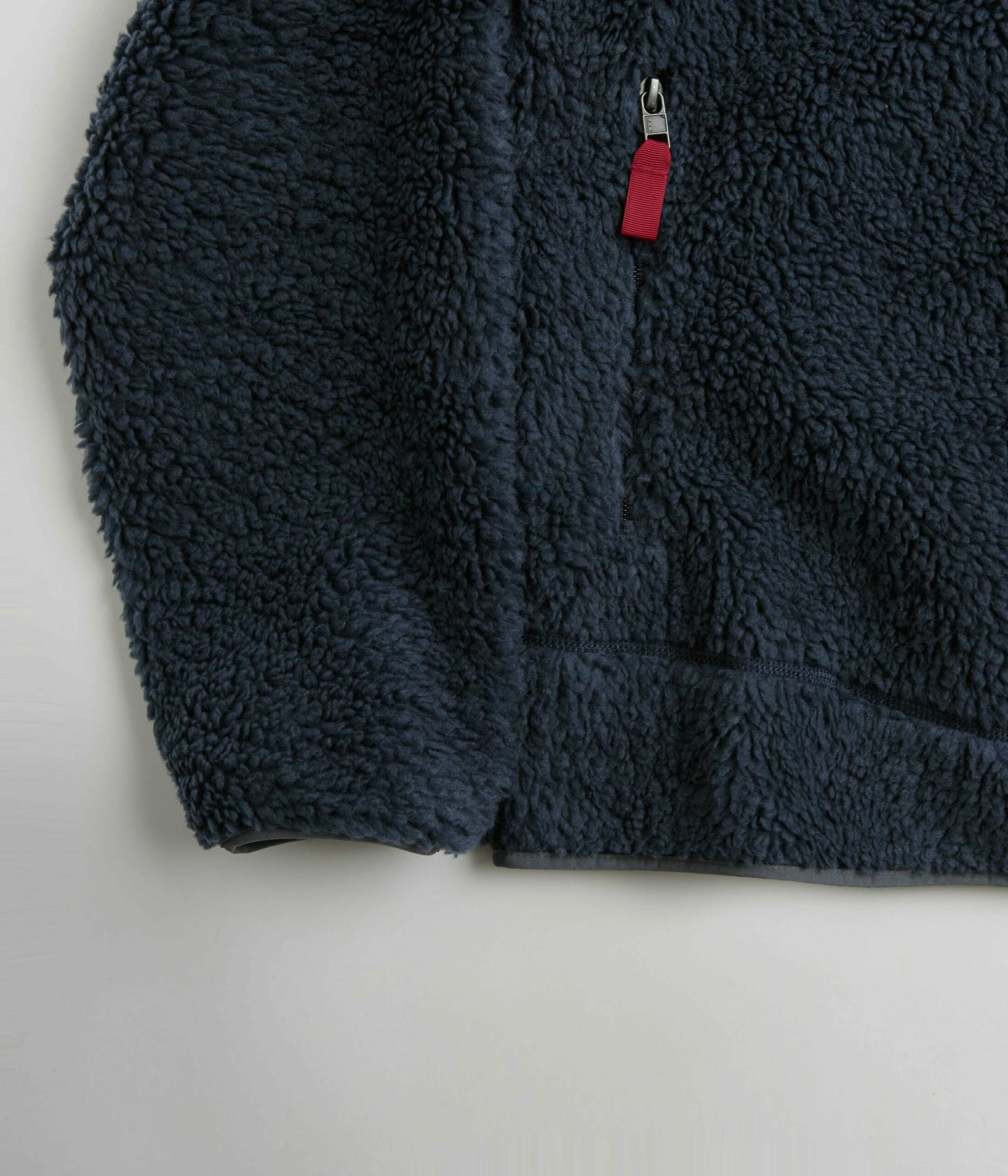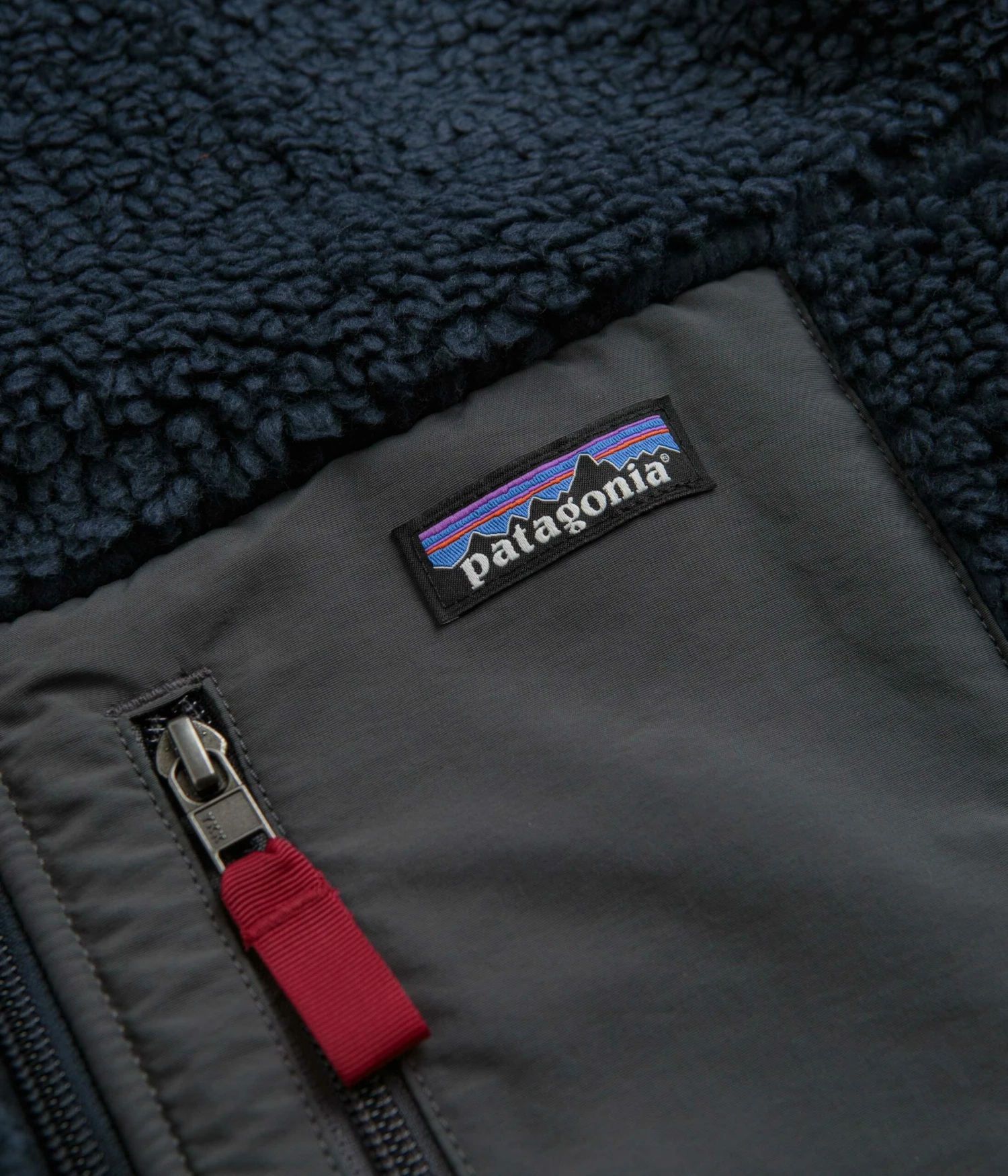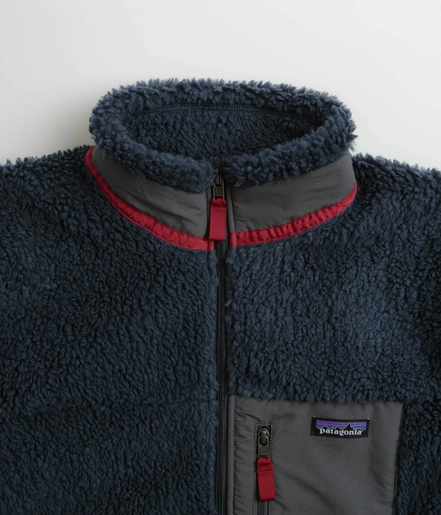 Patagonia Classic Retro-X Jacket in New Navy and Wax Red. Made from semi-recycled polyester bonded ¼ pile fleece with a warp-knit mesh lining and HeiQ® Pure odor control, this Fair Trade Certified Patagonia jacket is tailored to a regular fitting. Vintage inspired with a full length YKK zipper, Y-joint sleeves, elasticated cuffs and a woven elastic hemline, this navy Patagonia jacket is finished with exposed flat seam stitching, contrasting wax red accents, two zippered front pockets and with a contrasted P-6 embroidered chest panel with a single zippered pocket.