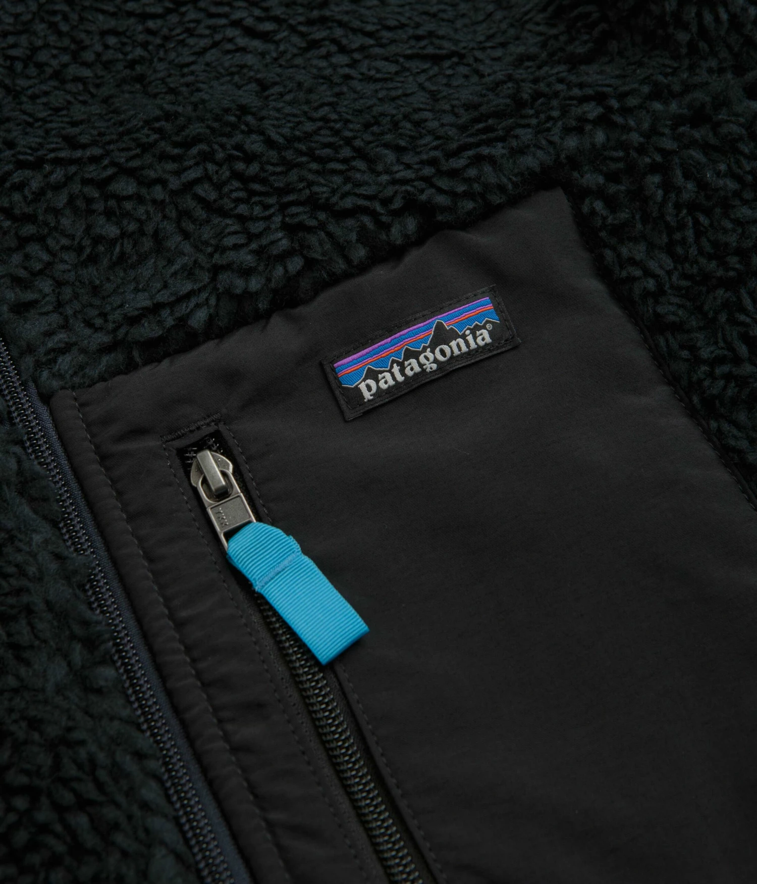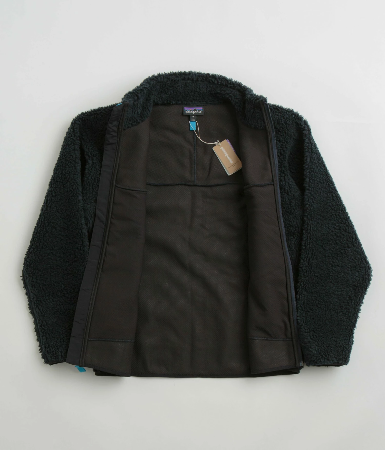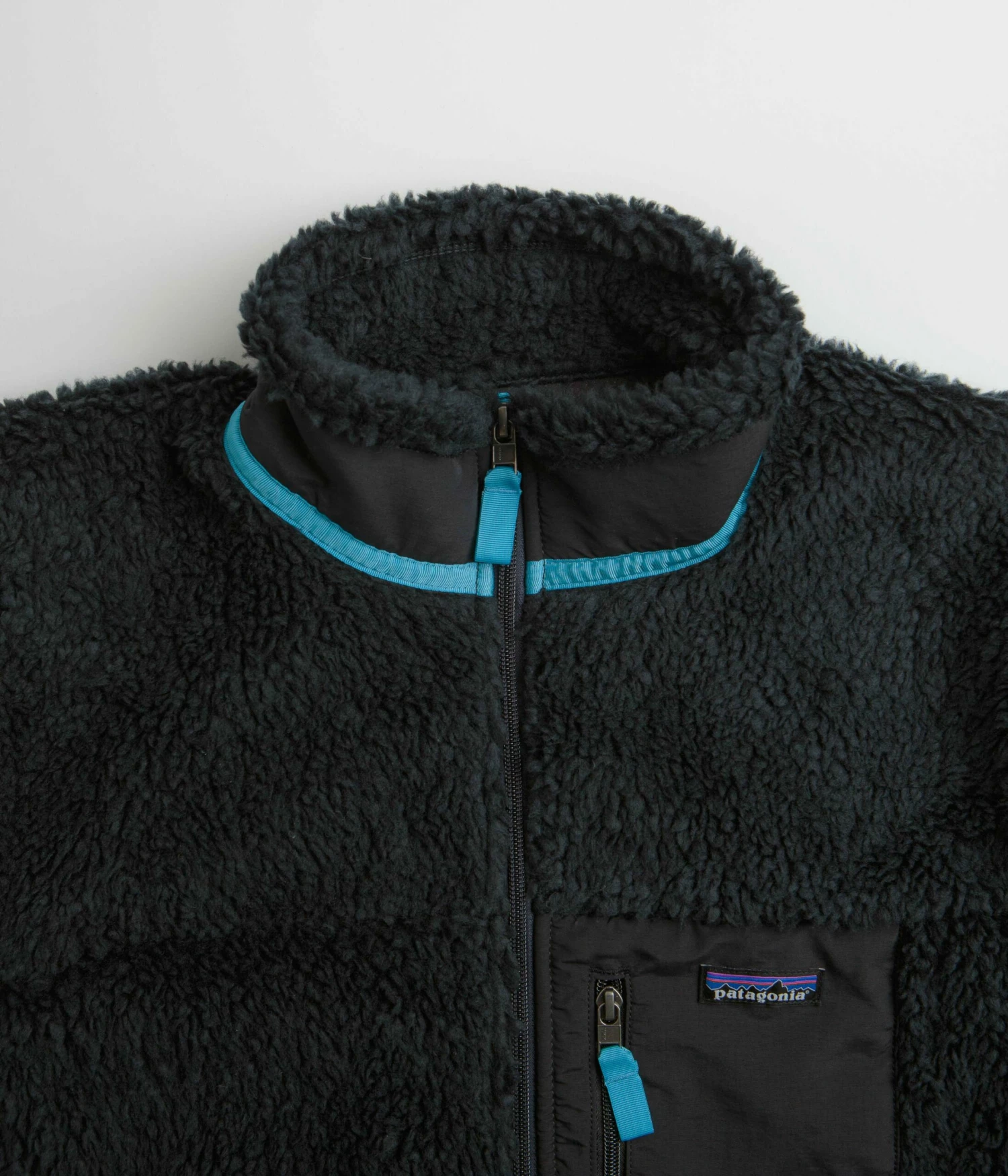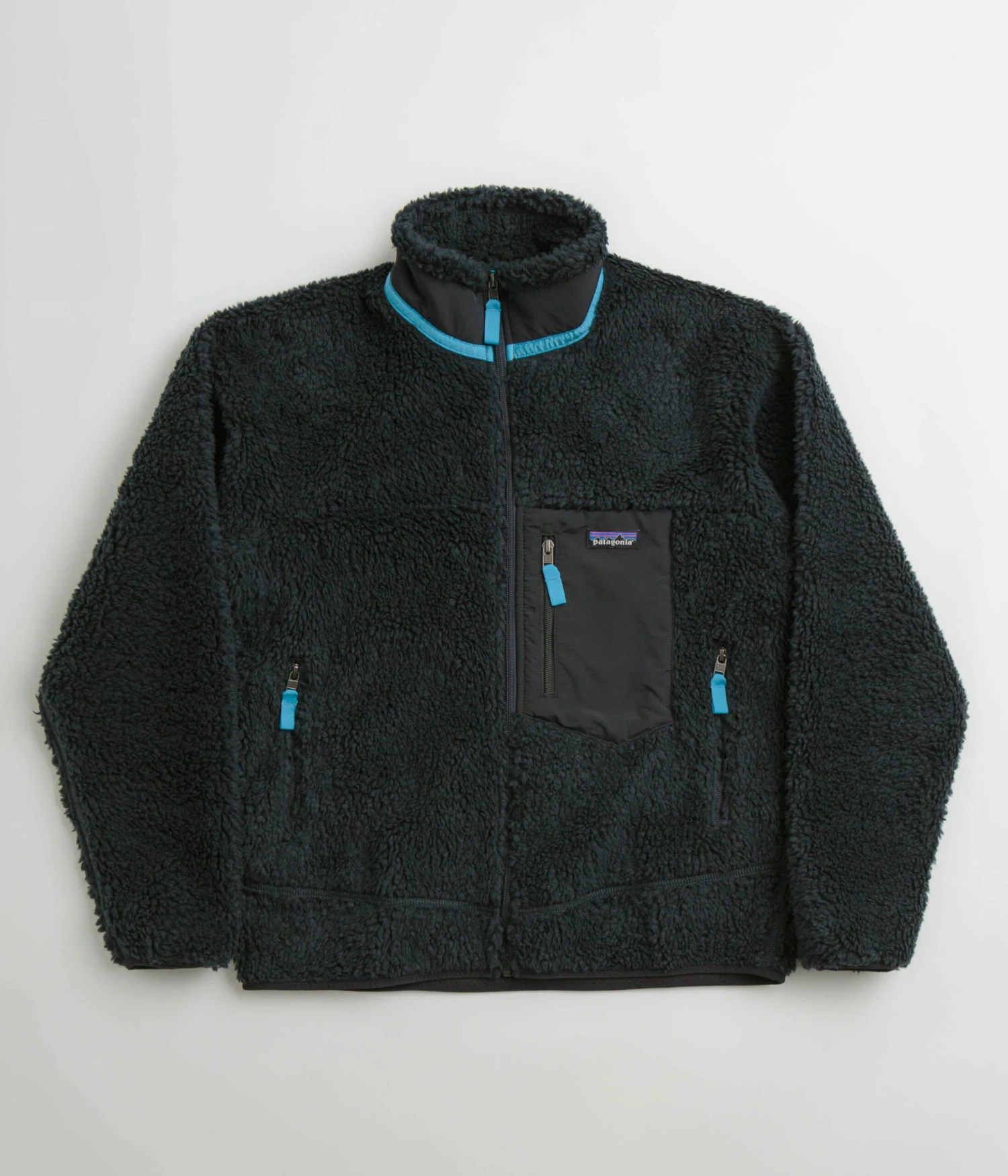 Patagonia Classic Retro-X Jacket in Pitch Blue. Fair Trade Certified and made from semi-recycled polyester bonded ¼ pile fleece, this regular fitting Patagonia jacket is a vintage inspired fleece styled with a warp-knit mesh lining and HeiQ® Pure odor control. Featuring contrasting light blue details, a full length YKK zipper, Y-joint sleeves, elasticated cuffs and a woven elastic hemline, this blue Patagonia jacket is finished with exposed flat seam stitching, two zippered front pockets, a contrasting nylon left chest patch, woven P-6 branding and an additional zippered chest pocket.