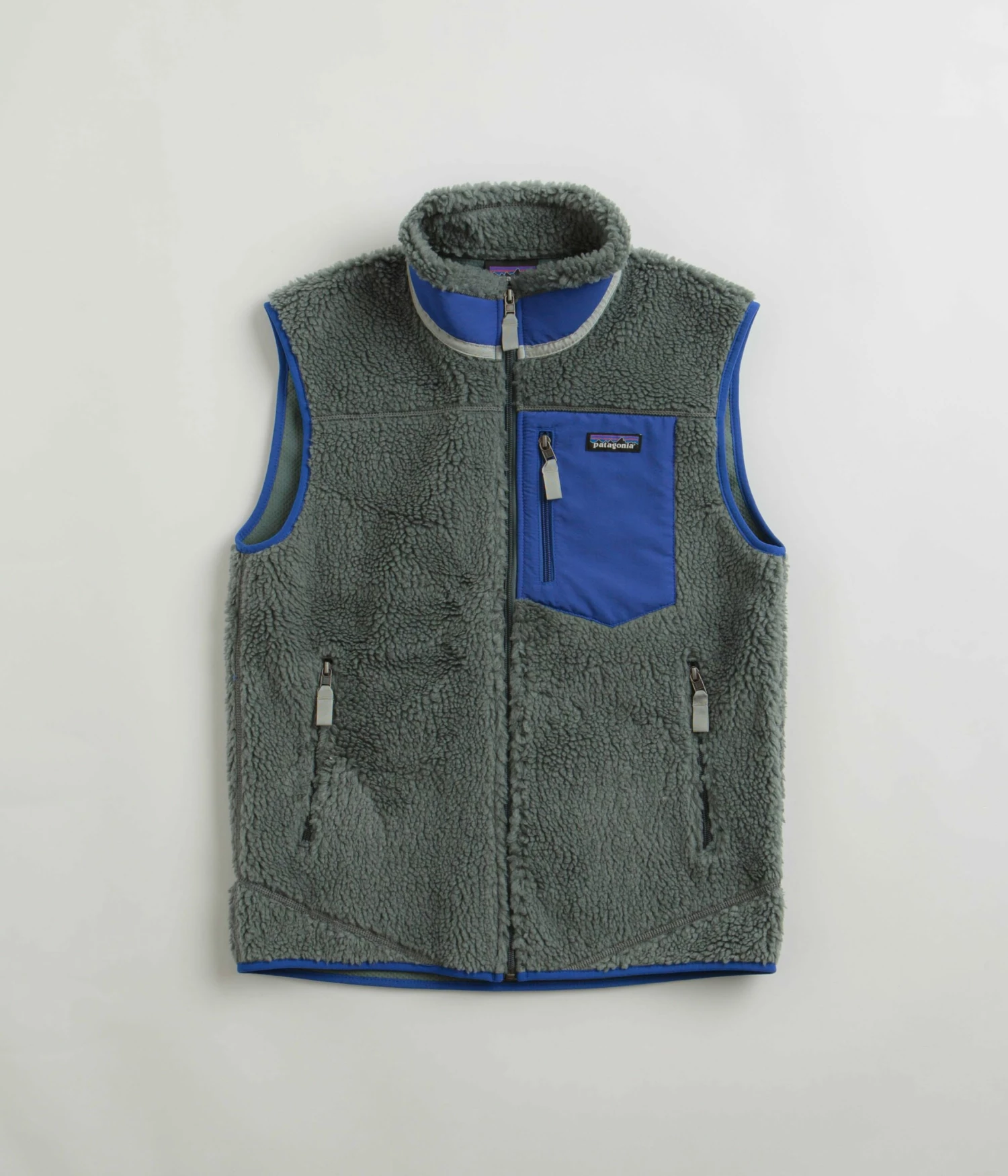 Patagonia Classic Retro-X Vest in Nouveau Green. Vintage inspired and tailored to a regular fitting, this Patagonia vest is made from 100% polyester fleece with a warp-knit mesh lining. Featuring a full length zipper fastening, a windproof barrier, contrasting taped seams and an elasticated hem, this green Patagonia vest is finished with two zippered waist pockets, a contrasting single chest pocket and woven P-6 flag label branding.