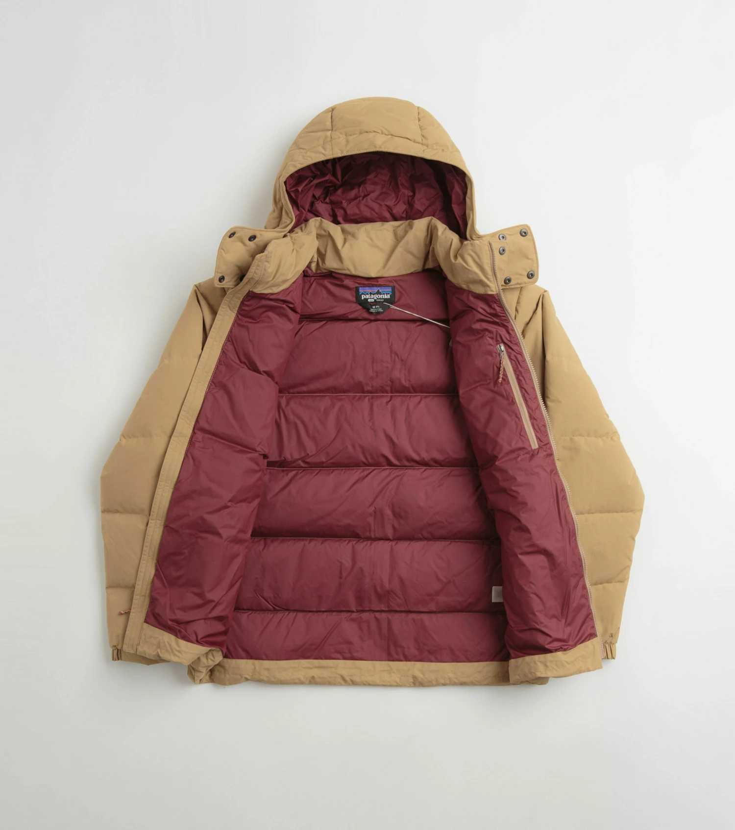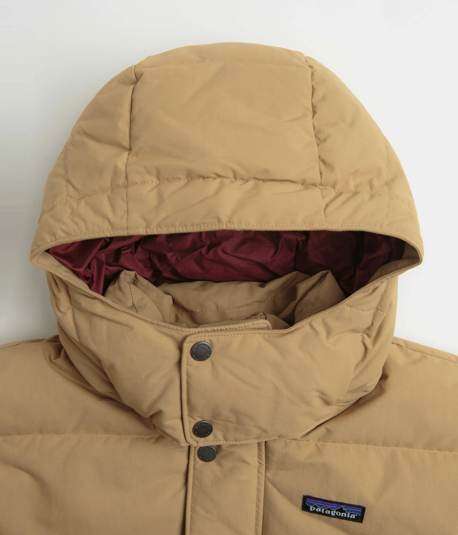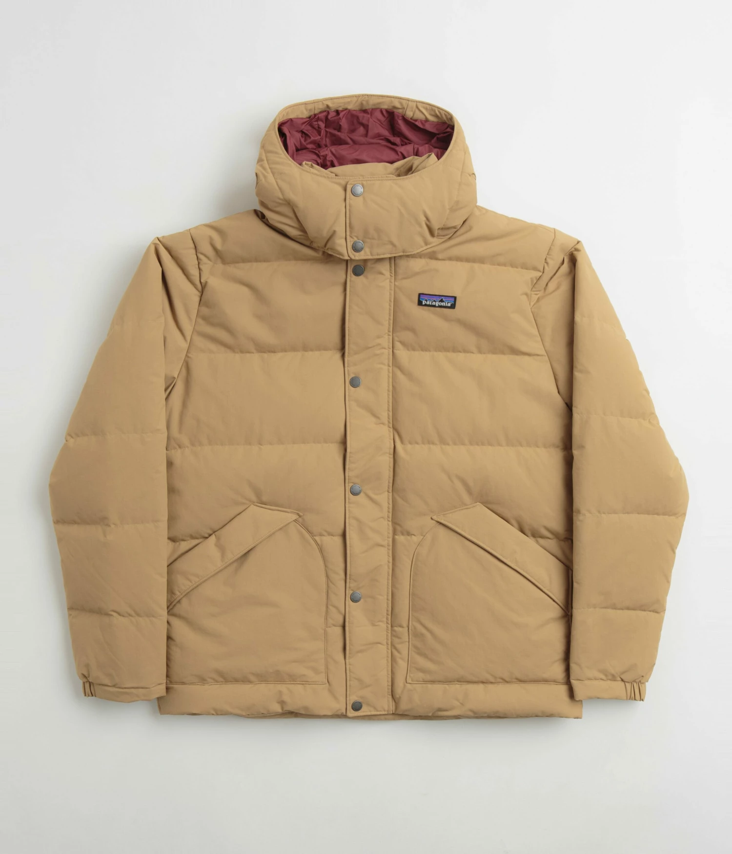 Patagonia Downdrift Jacket in Grayling Brown. Fair Trade Certified™ and tailored to a regular fitting, this Patagonia jacket is made from NetPlus® 100% postconsumer recycled nylon with a recycled 600-fill power insulation. Featuring a DWR coated exterior, a detachable hood, a full length snap placket fastening and a drawcord adjustable hem, this brown Patagonia jacket is finished with two waist pockets, an inner chest pocket and an embroidered P-6 flag label.
