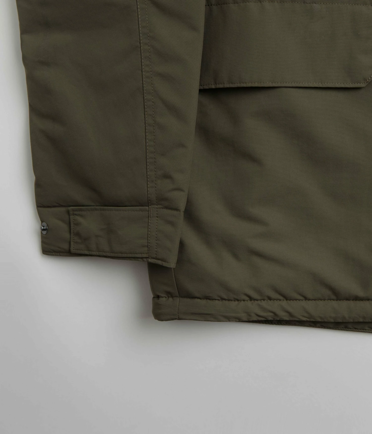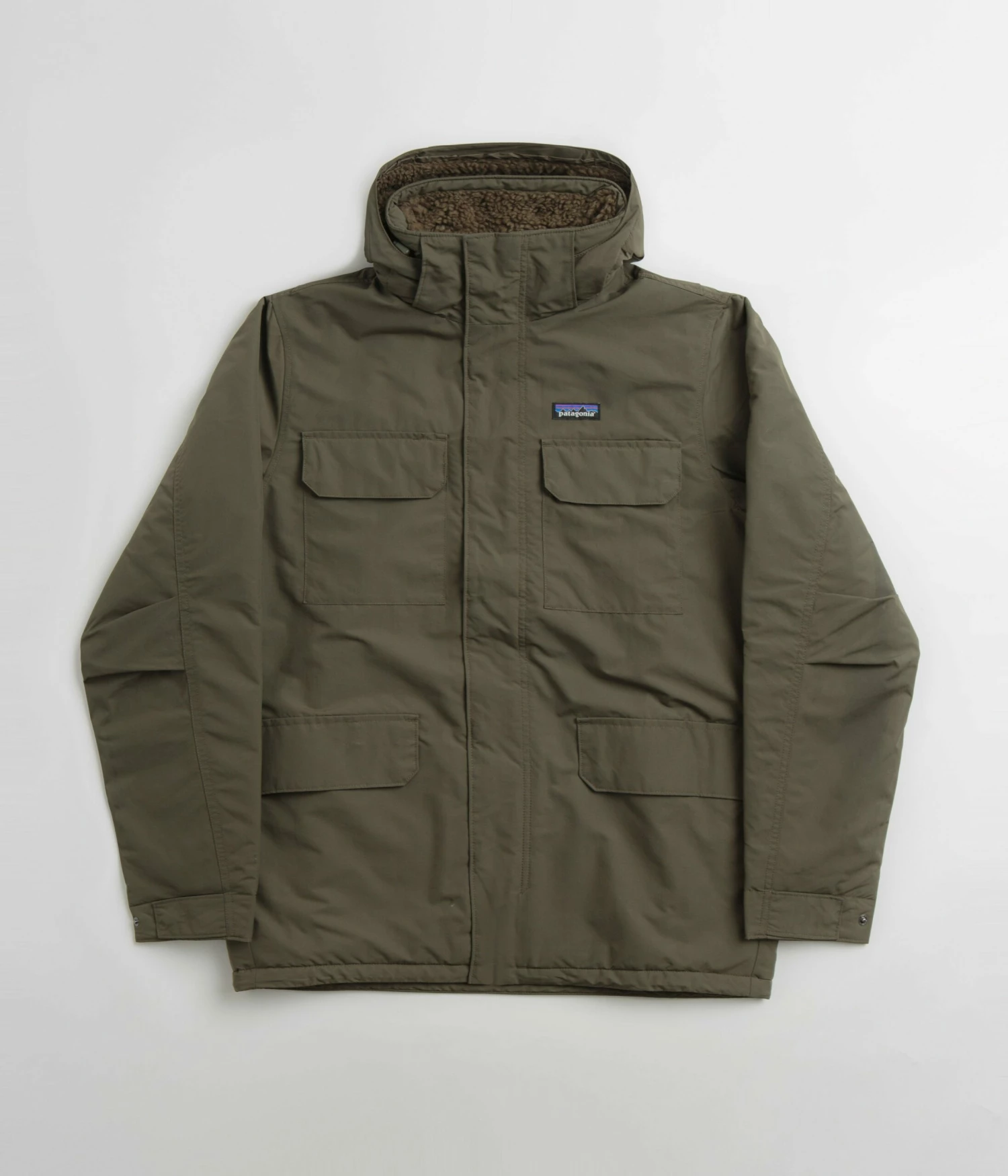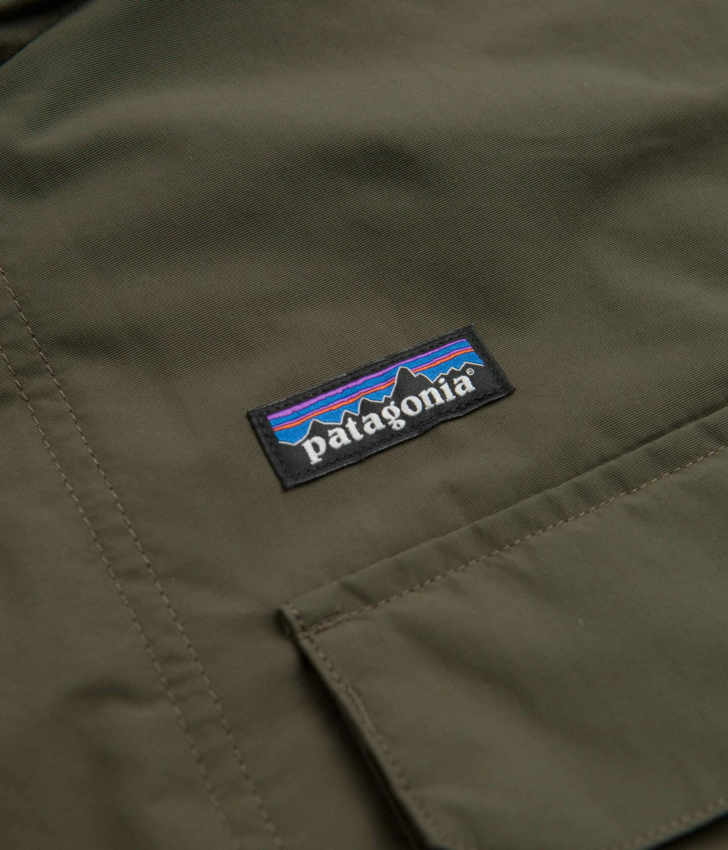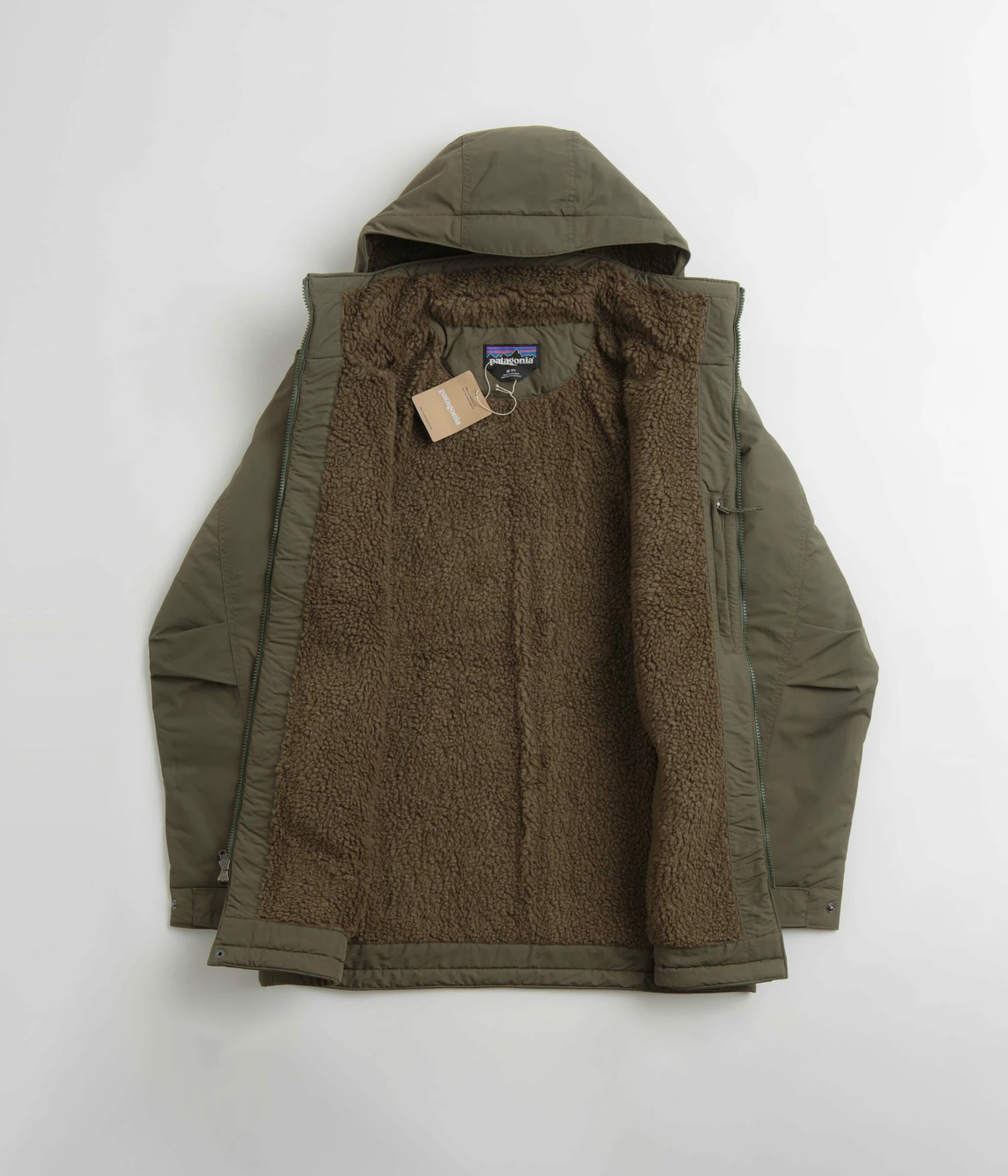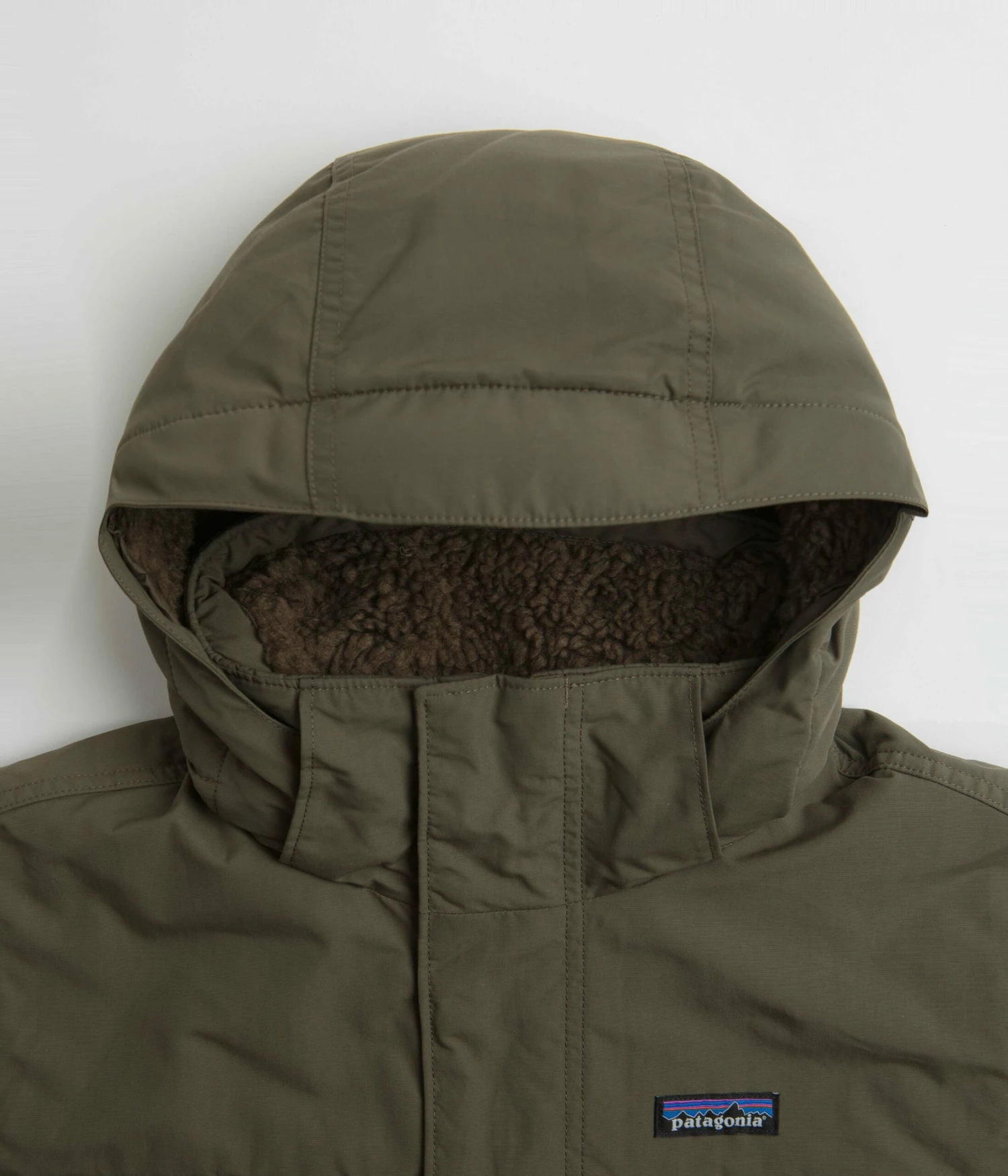 Patagonia Isthmus Parka in Basin Green. Tailored to a regular fitting with a 100% recycled nylon shell, this lined Patagonia parka is Fair Trade Certified™ with a DWR coating and a removable hood. Featuring a protective storm placket, a full length two-way YKK zipper and 60g Thermogreen™ insulation, this green Patagonia parka is finished with four front pouch pockets, concealed inner pockets and with an embroidered P-6 flag label.