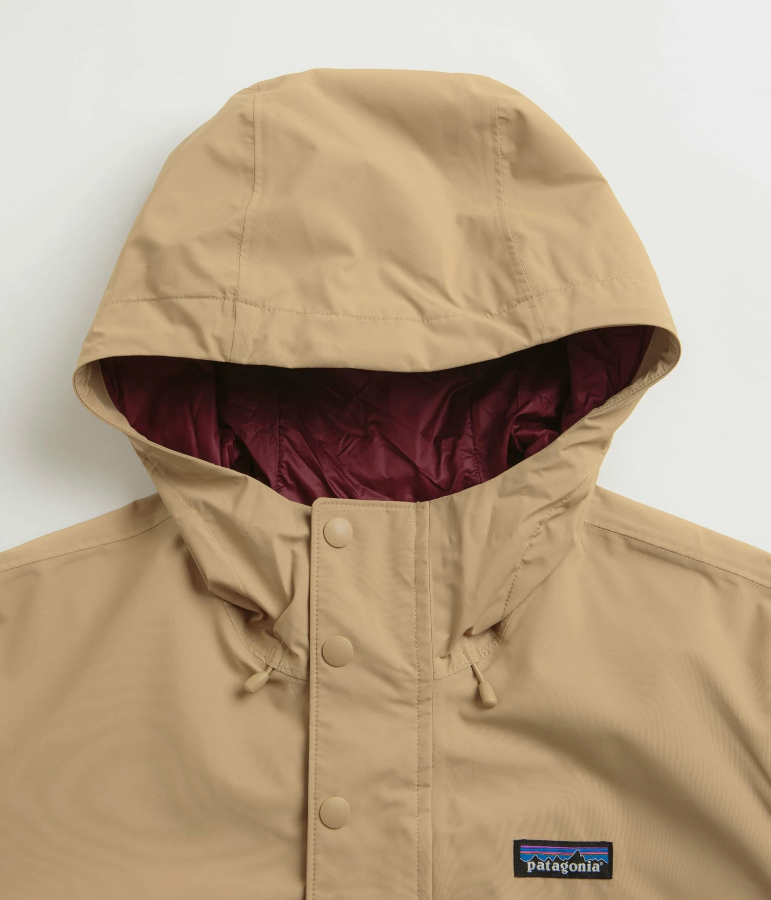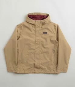 Patagonia Jackson Glacier Rain Jacket in Grayling Brown. Made from 100% recycled polyester plain weave with a H2No® Performance Standard shell, this regular fitting Patagonia jacket is designed with a ripstop lining and a DWR coated exterior. Featuring a two-way adjustable hood, a full length zipper fastening and a storm snap placket, this brown Patagonia jacket is finished with adjustable cuffs, two waist pockets, a concealed inner pocket and with woven P-6 flag label branding.