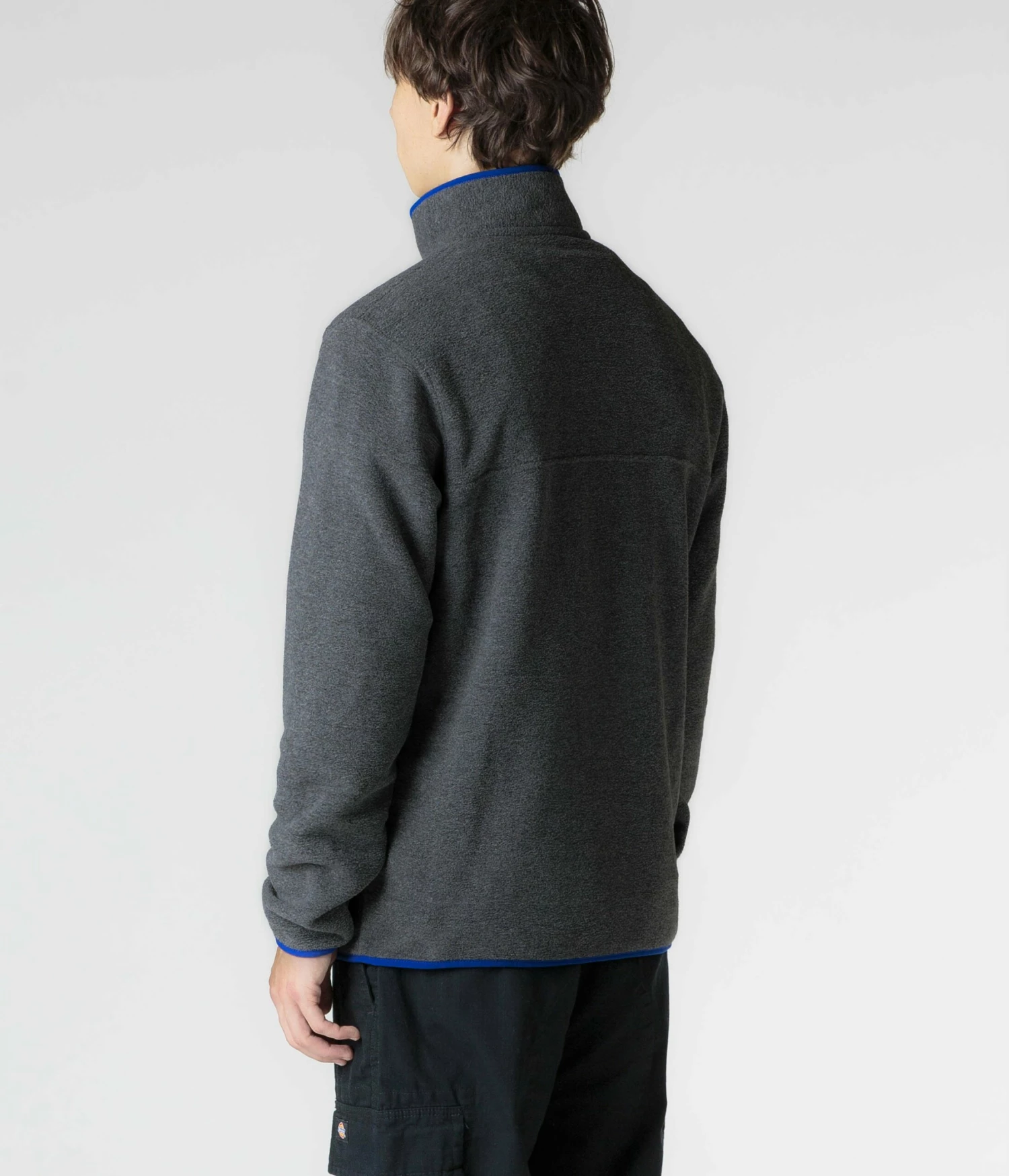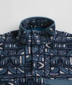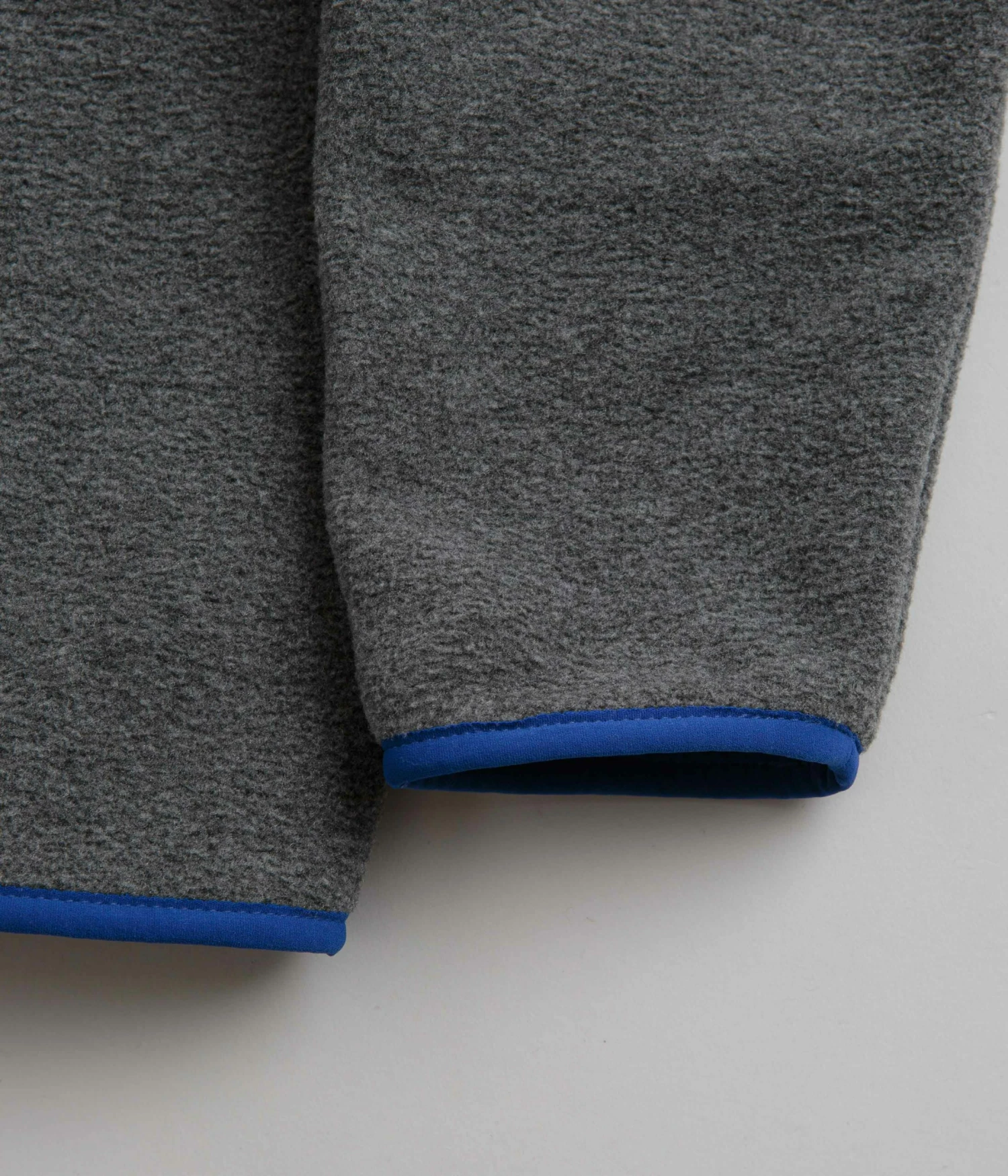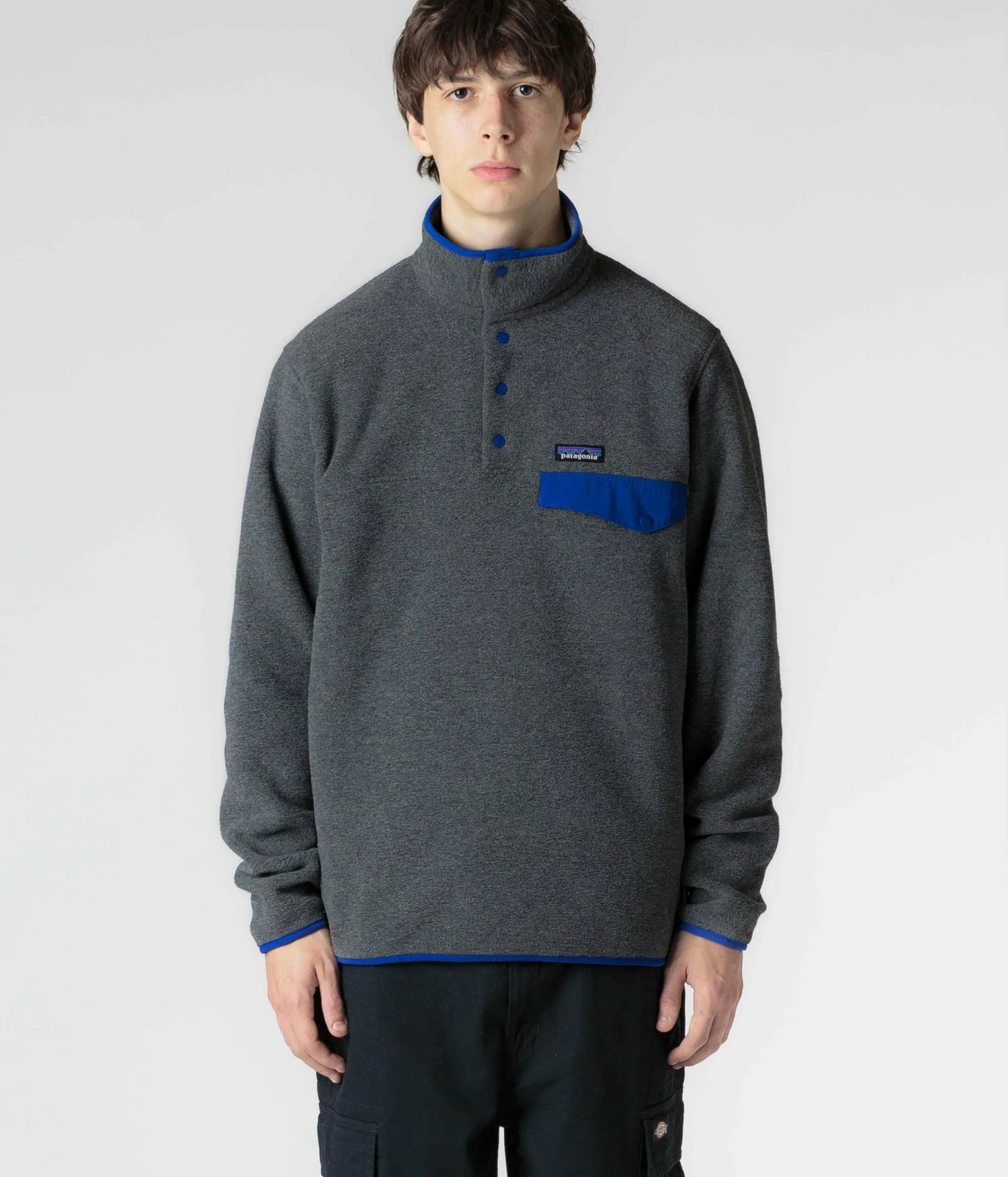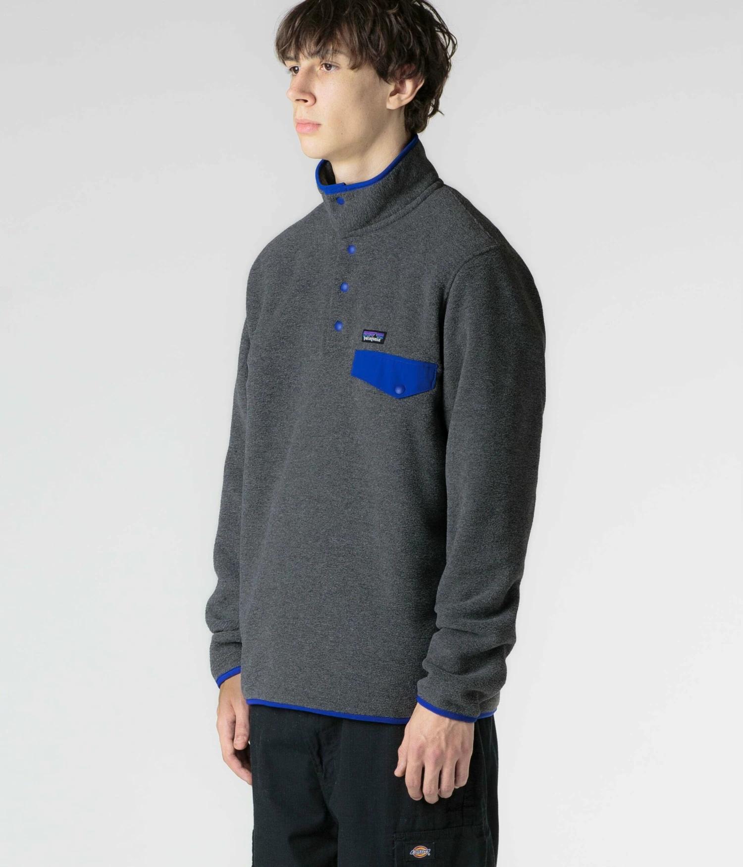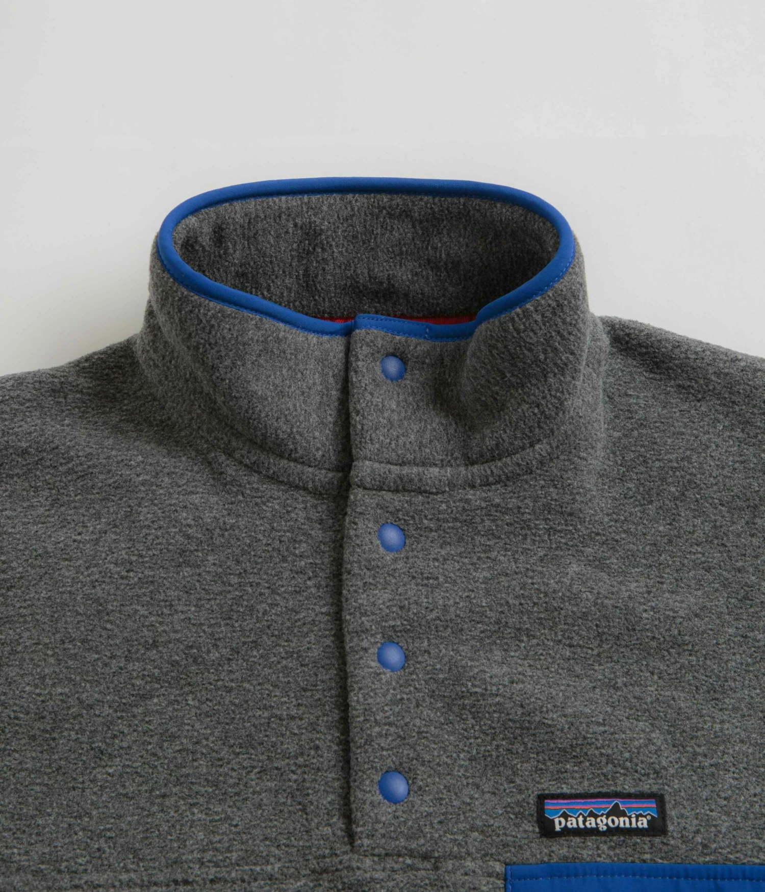 Patagonia Lightweight Synchilla Snap-T Fleece in Nickel and Passage Blue. Made from recycled polyester double-sided fleece, this regular fitting Patagonia fleece is designed with contrasting plain-weave collar and chest detailing. Featuring a four snap placket, Y-joint sleeves and elasticated cuffs, this grey blue Patagonia fleece is finished with a woven elastic hem, a single chest pocket and with an embroidered P-6 flag label.