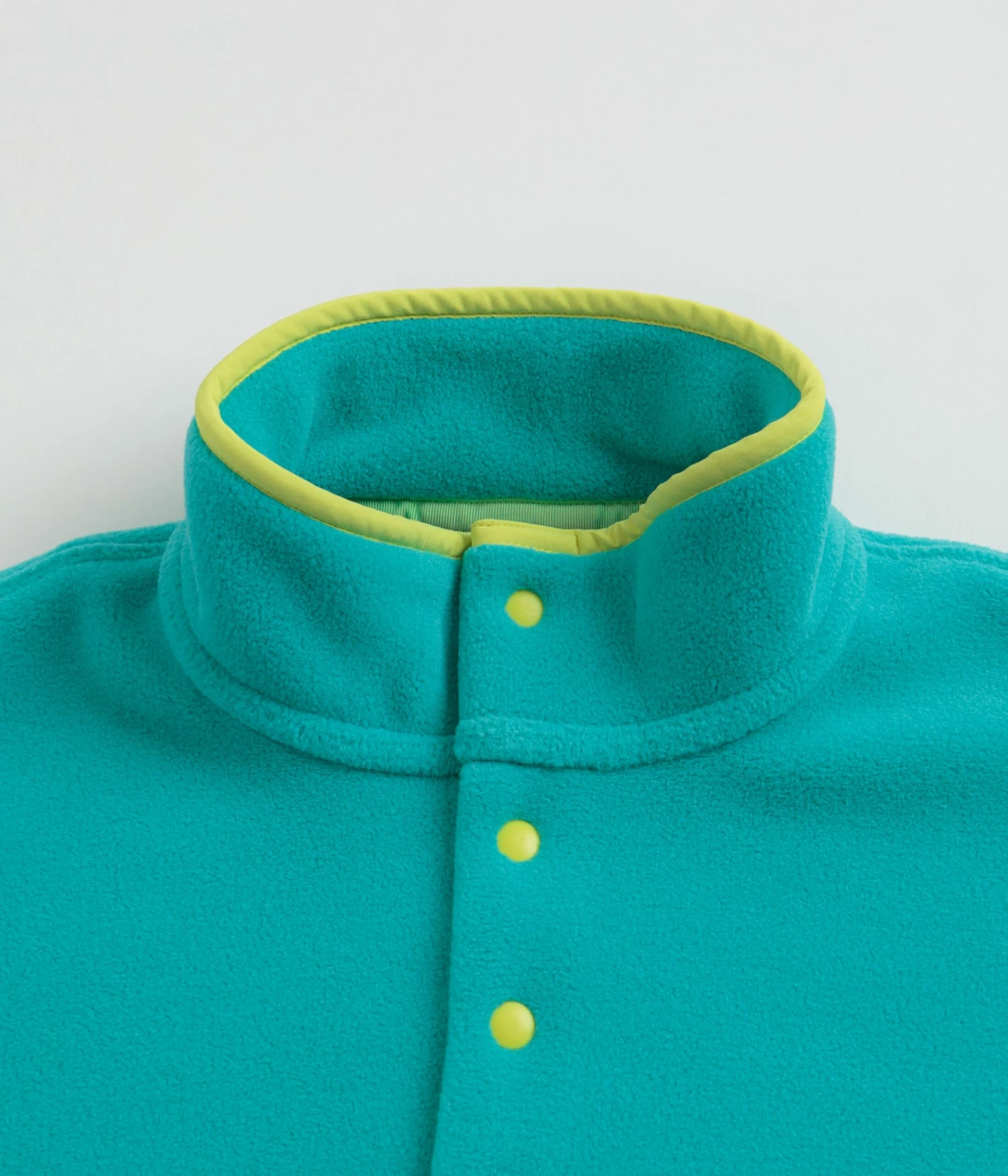 Patagonia Lightweight Synchilla Snap-T Fleece in Vessel Blue. Regular fitting and made from 100% recycled polyester double-sided fleece, this two tone Patagonia fleece is designed with Y-joint sleeves and a snap placket fastening. Featuring neon green spandex trims and a panelled chest, this teal blue Patagonia fleece is finished with a nylon plain-weave chest pocket and with woven P-6 flag label branding.