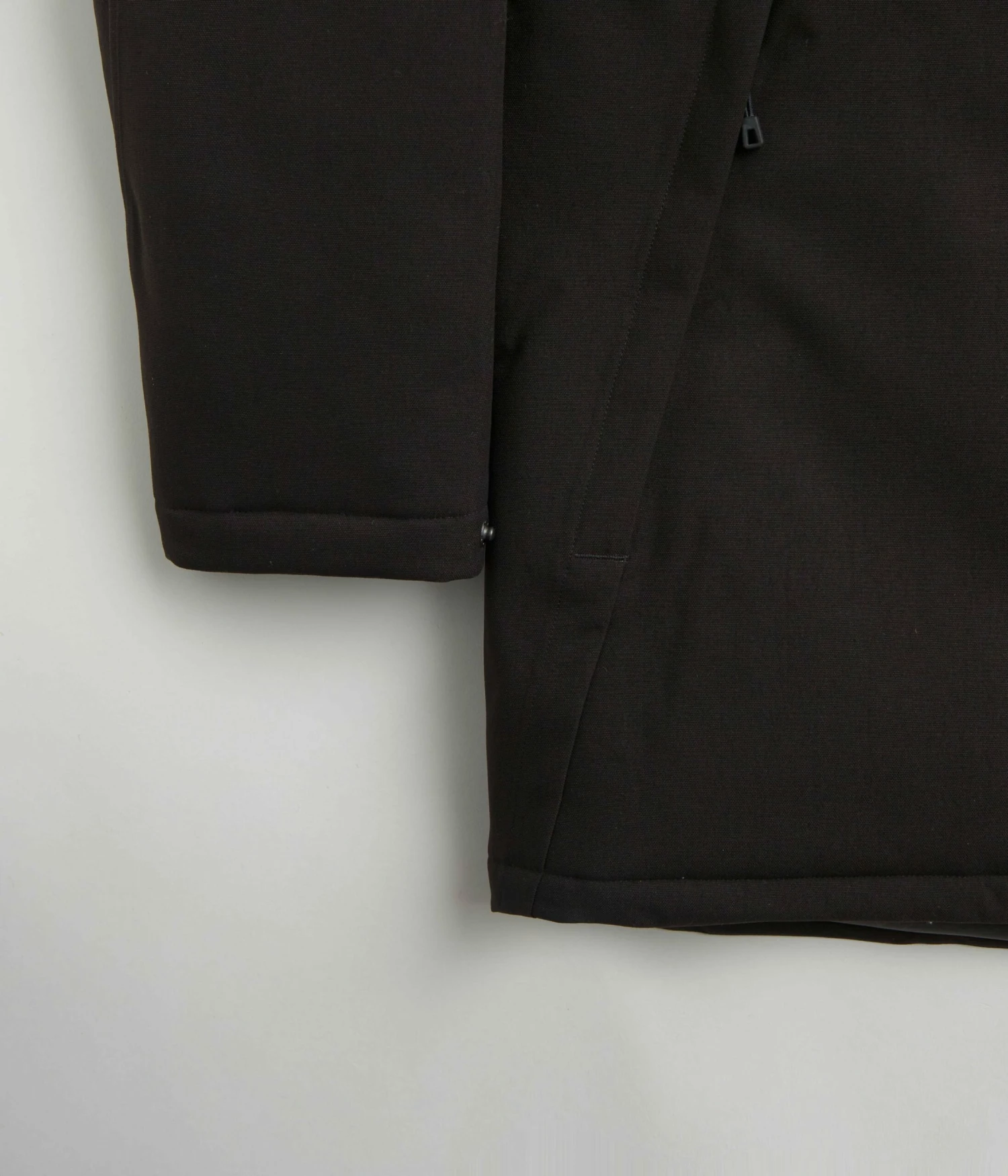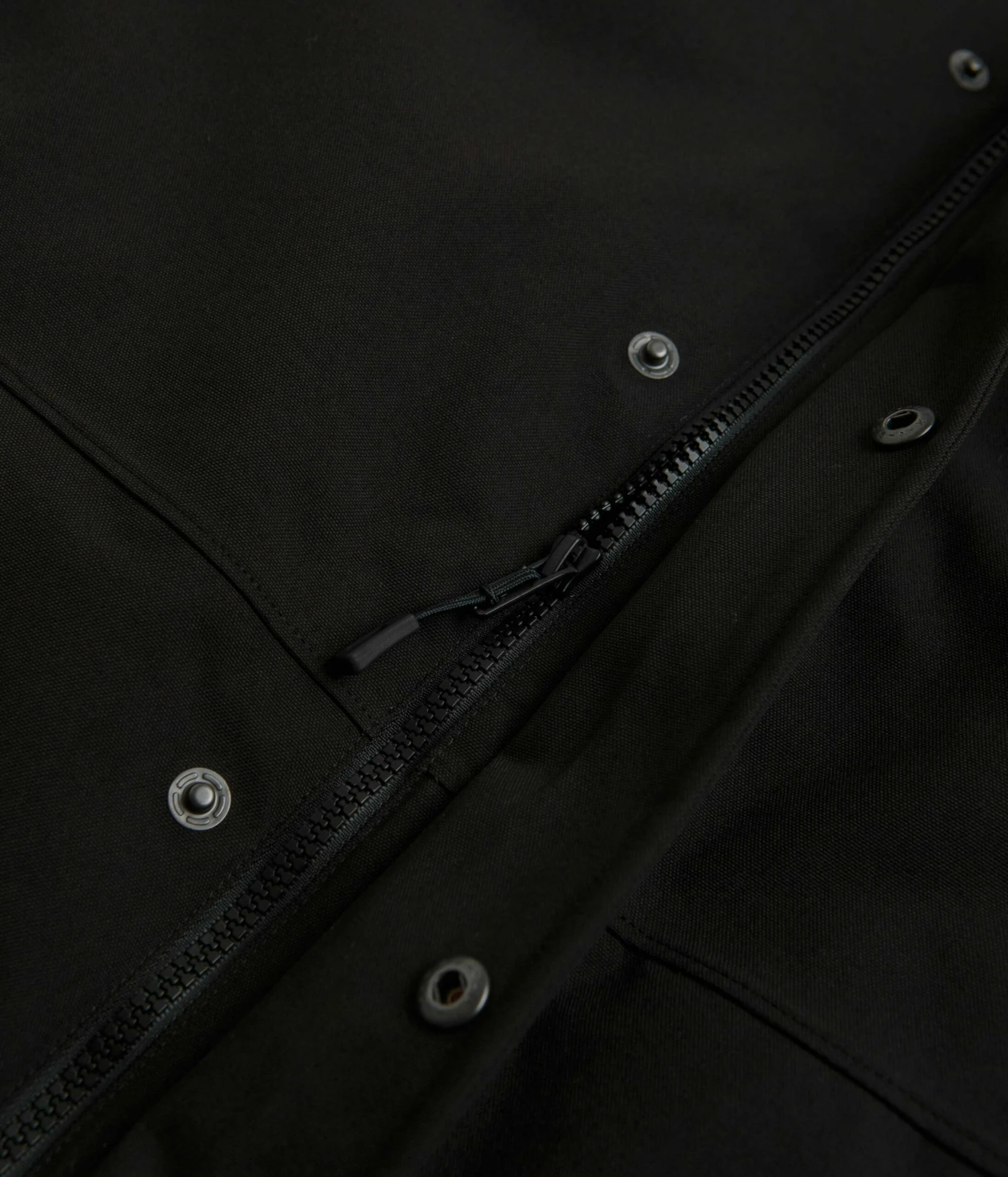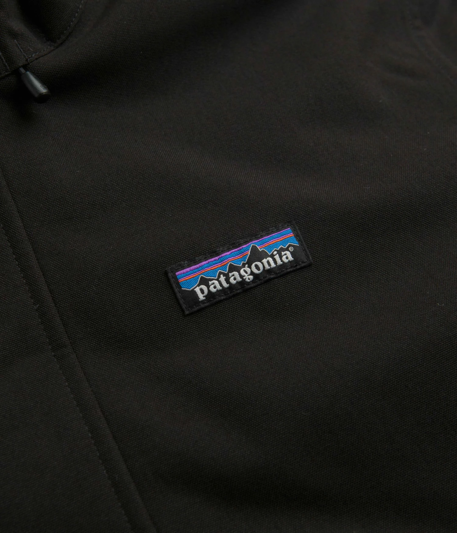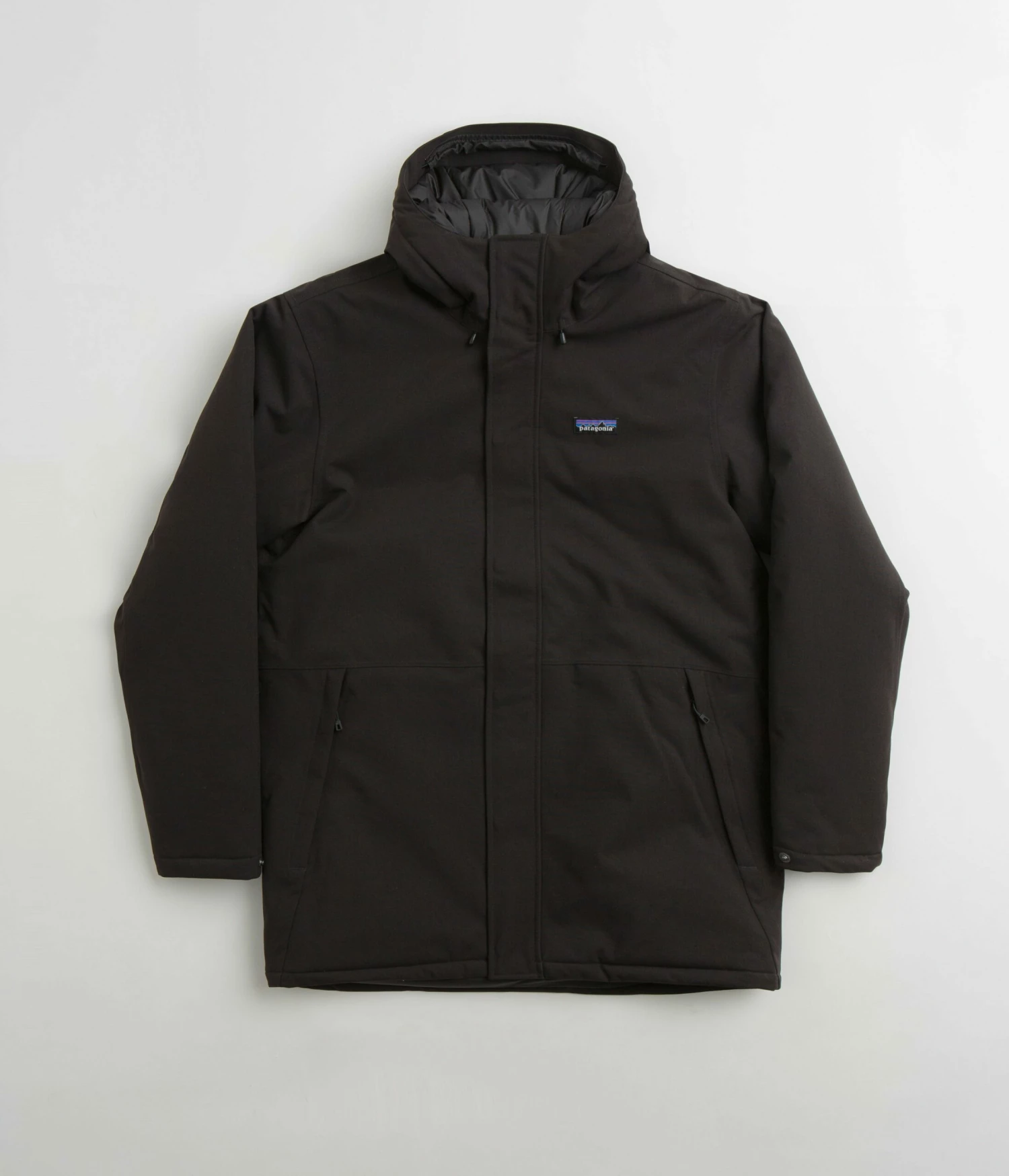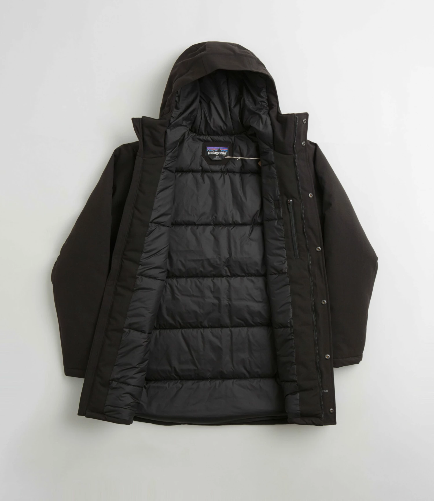 Patagonia Lone Mountain Parka in Black. Styled with a streamlined silhouette in mind, this all-black Patagonia jacket is a warm, versatile jacket well-suited to any urbanised wardrobe. Fair Trade Certified sewn using H2No Performance Standard 2-layer 100% nylon with a DWR finish and a 100% recycled polyester taffeta lining, this long sleeve jacket is styled to a below-waist length with snap-tab adjustable cuffs, a non-intrusive hemline and a fixed, two-way adjustable hood for increased cold-weather protection. 200-g Thermolite Eco92 insulation lightly pads the jacket to help boost heat retention, whilst the two-way front zipper that flows the immediate centre of the chest is pre-designed with a built-in storm flap to block wind and unwanted moisture. Two spacious handwarmer pockets can be found across each side-seam and are lined with soft microfleece, whilst the internal zippered pocket hosts media-compatible functionality and marks the perfect spot for storing smaller essentials in. A classic embroidered P-6 logo decorates the left-chest for a sleek and effortless sign off.