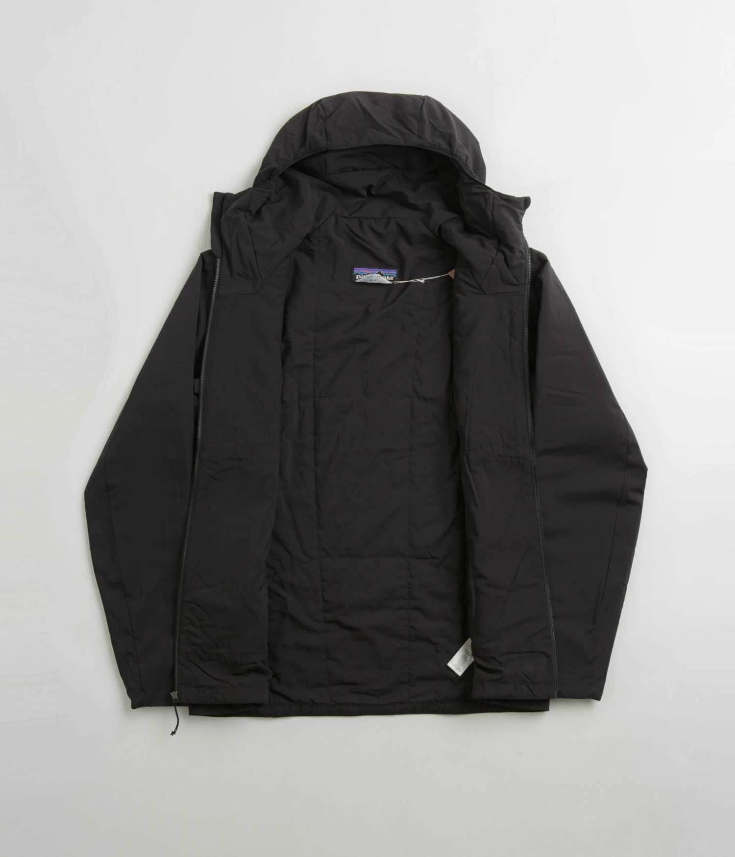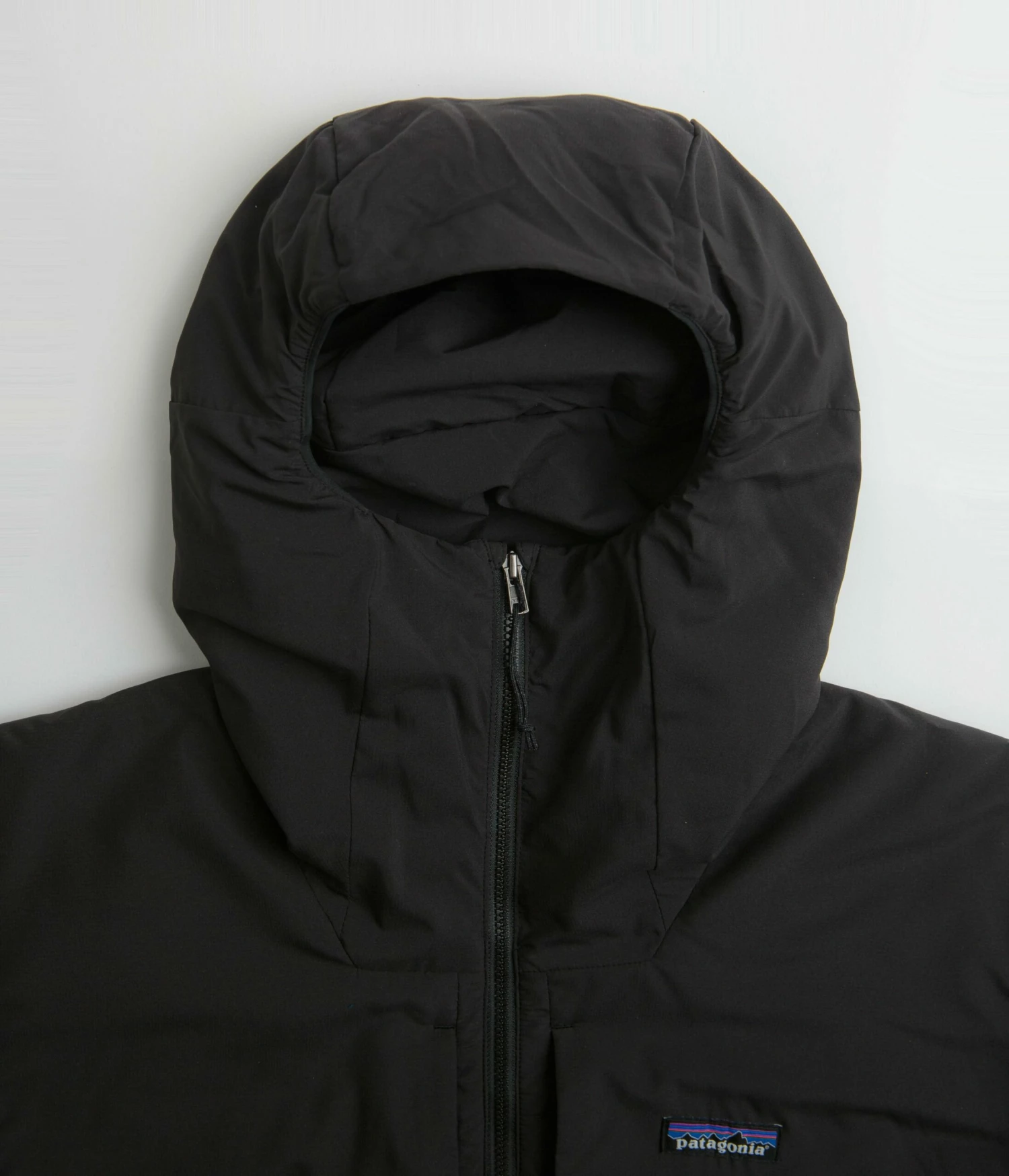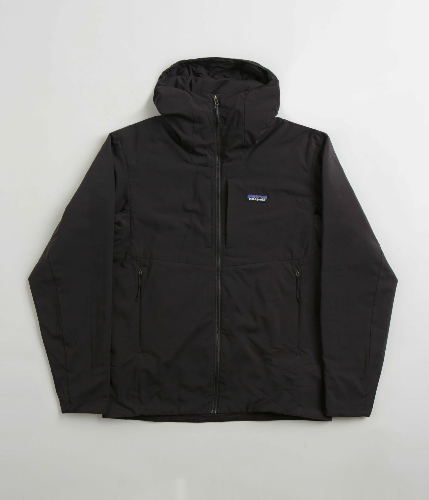 Patagonia Nano-Air Hooded Jacket in Black. Fair Trade Certified™ with an air-permeable shadow stretch shell made from 100% recycled polyester, this Patagonia jacket is designed with 60g FullRange® insulation with a full length zipper fastening. Featuring a stretchy hood, elasticated cuffs and a reinforced hem, this black Patagonia jacket is finished with two waist pockets, two chest pockets, self-storing functionality and with an embroidered P-6 flag label sewn across the left chest.