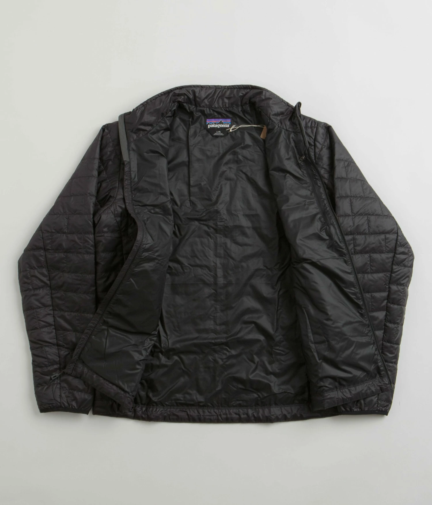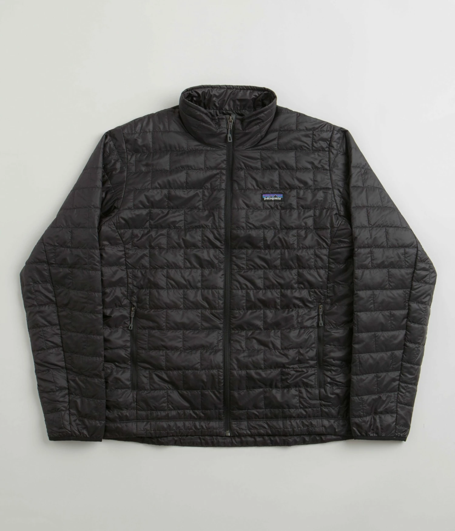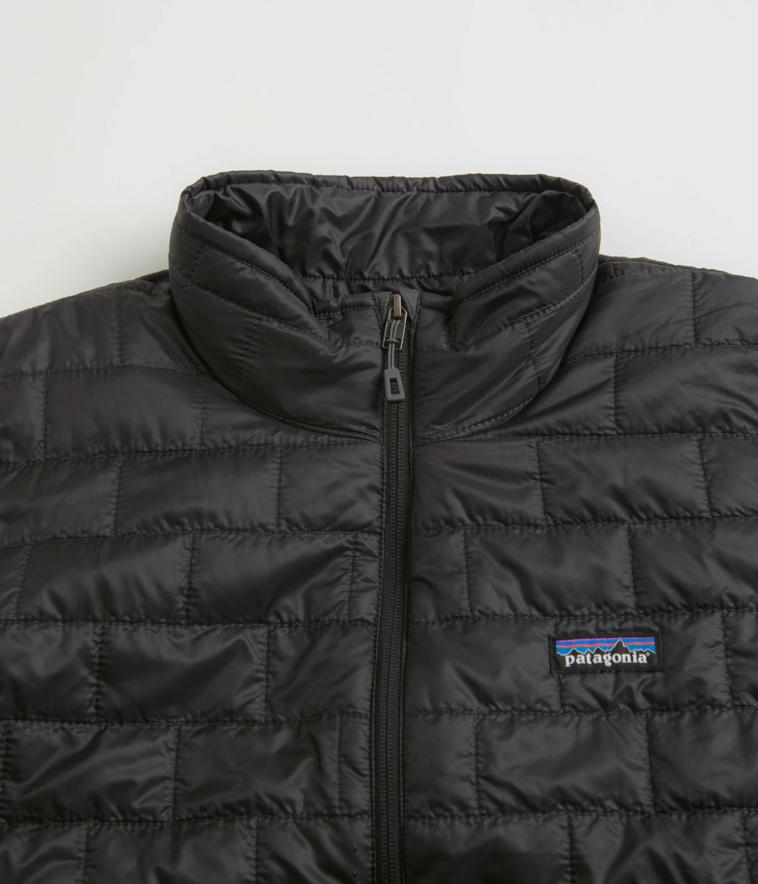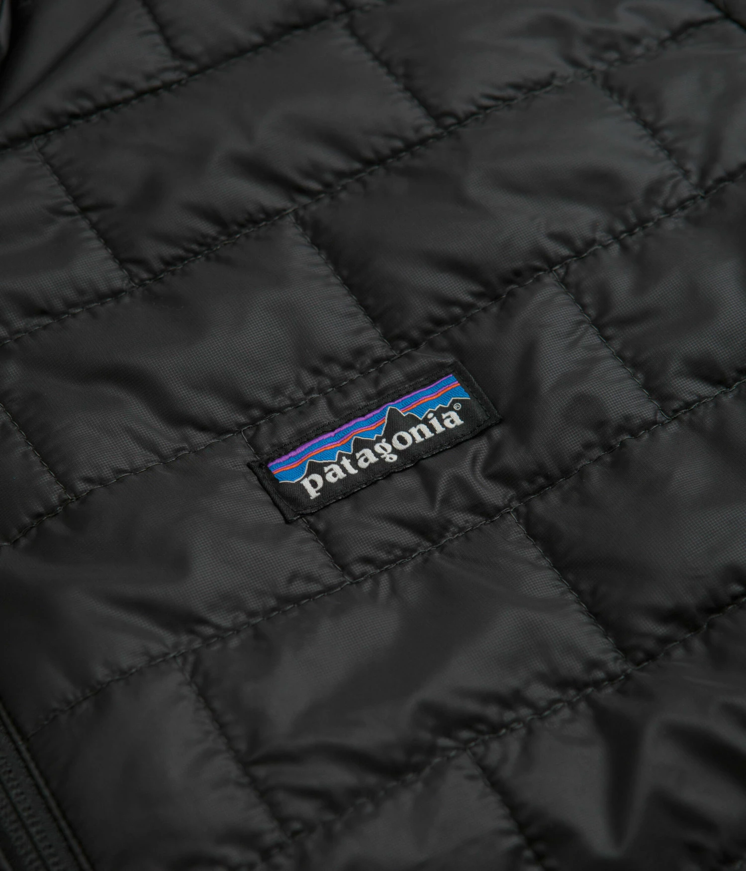 Constructed using incredibly lightweight and highly compressible PrimaLoft® Gold Insulation Eco with 55% postconsumer recycled content, this black Patagonia Nano Puff Jacket has a 100% recycled polyester shell and lining and is designed to keep you warm with no unnecessary bulk. Perfect for layering, the raised neckline offers protection from the elements whilst a full length front zipper has an interior storm flap and allows for ventilation when needed. An interior chest compartment provides space to tuck valuables out of the way and on the left side of the chest a woven P-6 logo label has been added, with two zip secured handwarmer compartments on either side of the waist for storage of essential items. An all over brick quilted pattern runs across the body and around the sleeves to help stabilize the insulation and uses durable thread to prevent damage from abrasion. The sleeves have narrow elasticated cuffs and the body has a drawcord adjustable drop-tail hem which helps to seal in warmth.