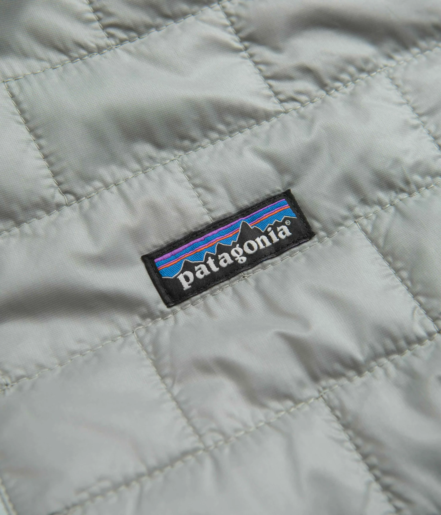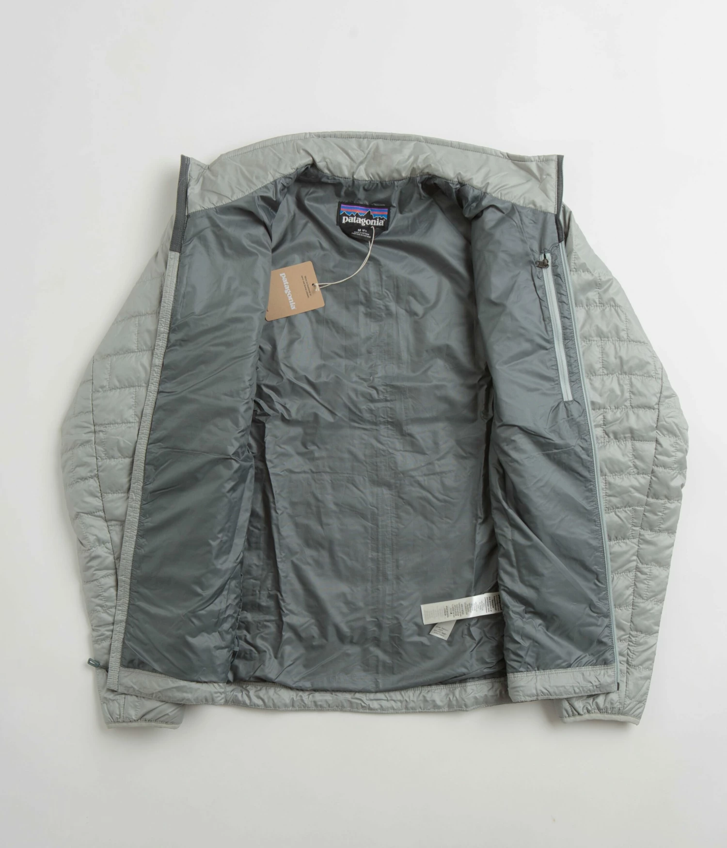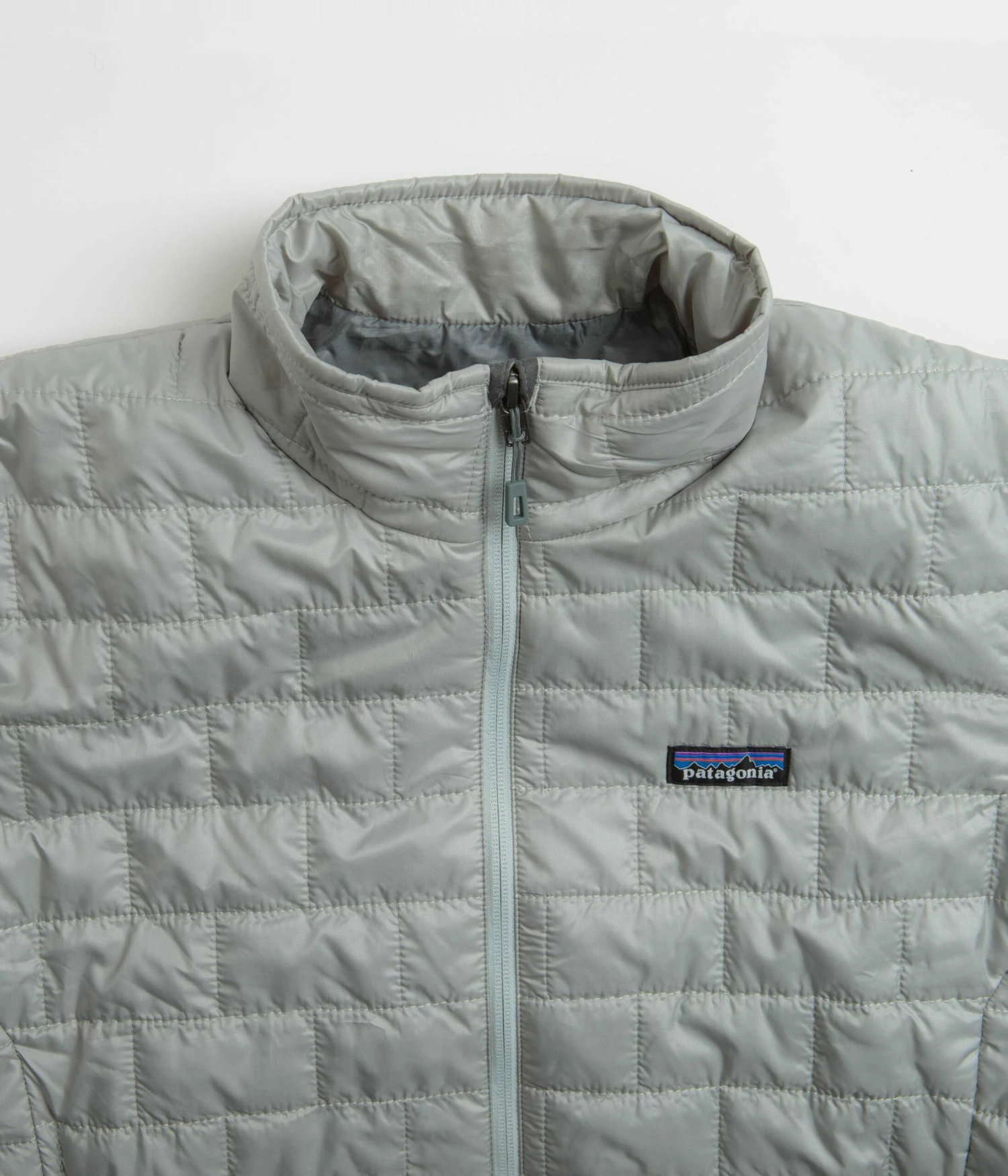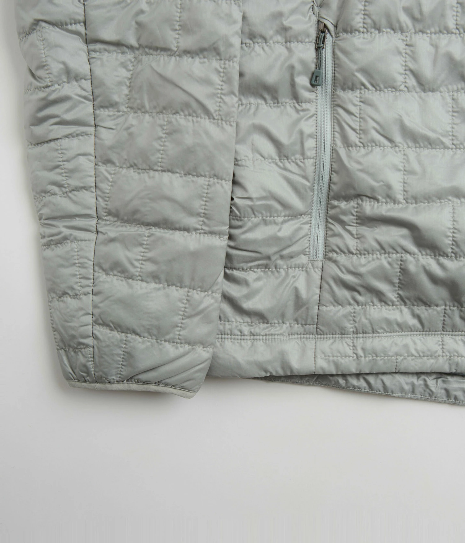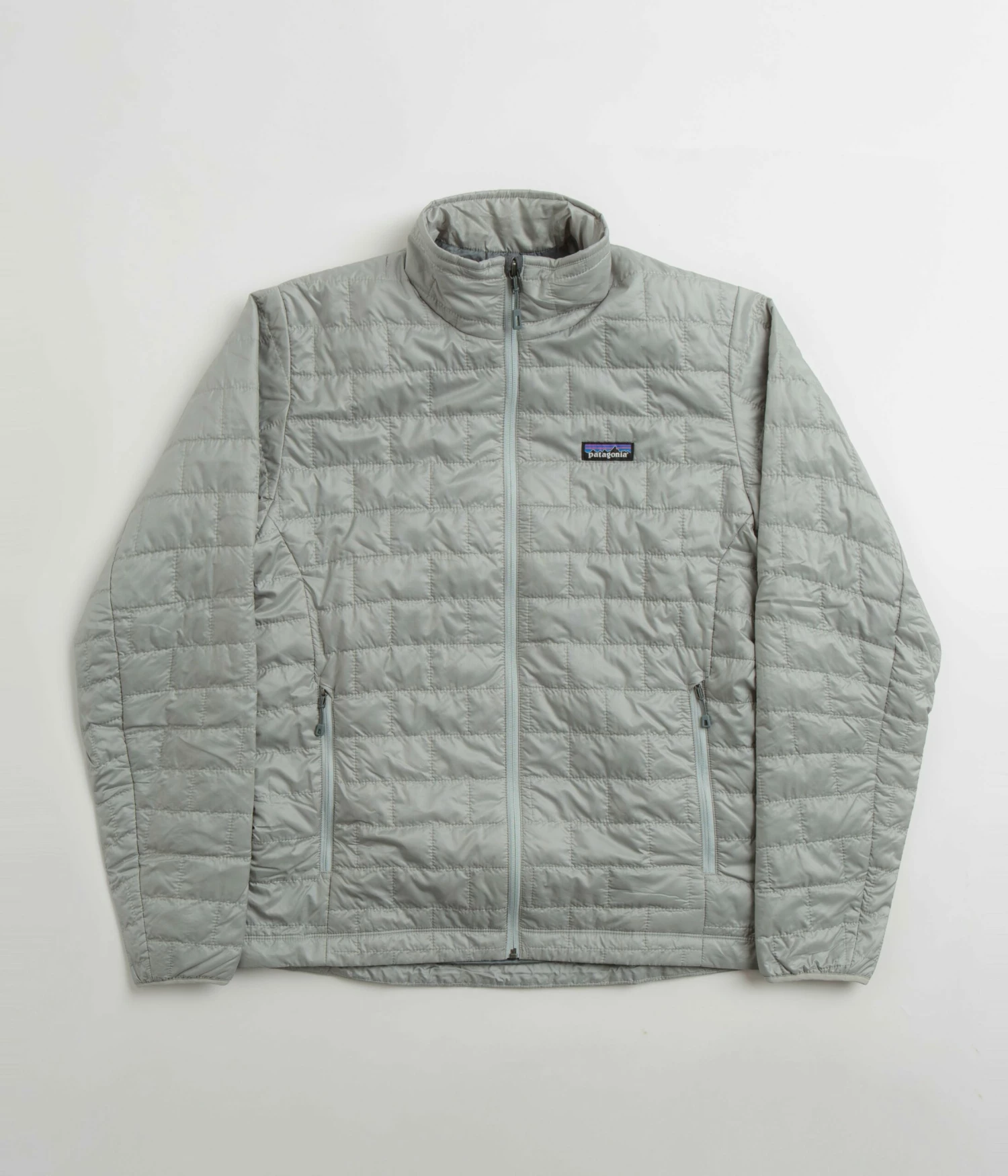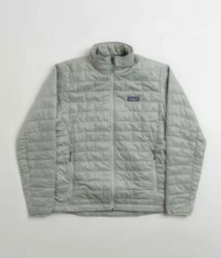 Patagonia Nano Puff Jacket in Sleet Green. Tailored to a regular fitting from 100% recycled polyester ripstop, this DWR coated Patagonia jacket is designed with PrimaLoft® Gold Insulation Eco technology. Featuring a full length zipper fastening, a brick quilted pattern, elasticated cuffs and a drawcord adjustable drop-tail hem, this grey green Patagonia jacket is finished with two zippered waist pockets, a zipped inner pocket and with an embroidered left chest P-6 flag label.